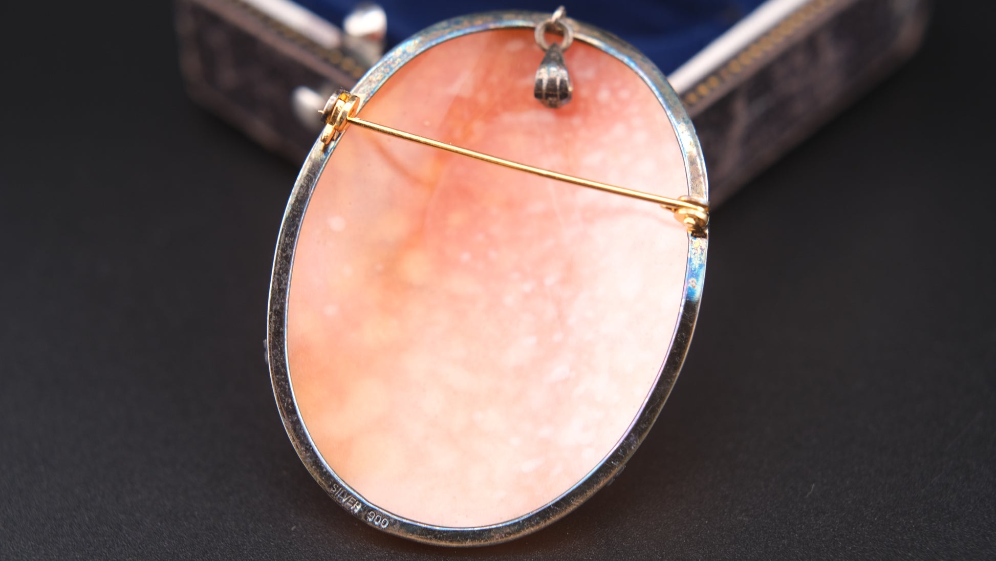 Antique Shell Cameo Brooch & Pendant – Hand-Carved Lady Portrait in Silver 800