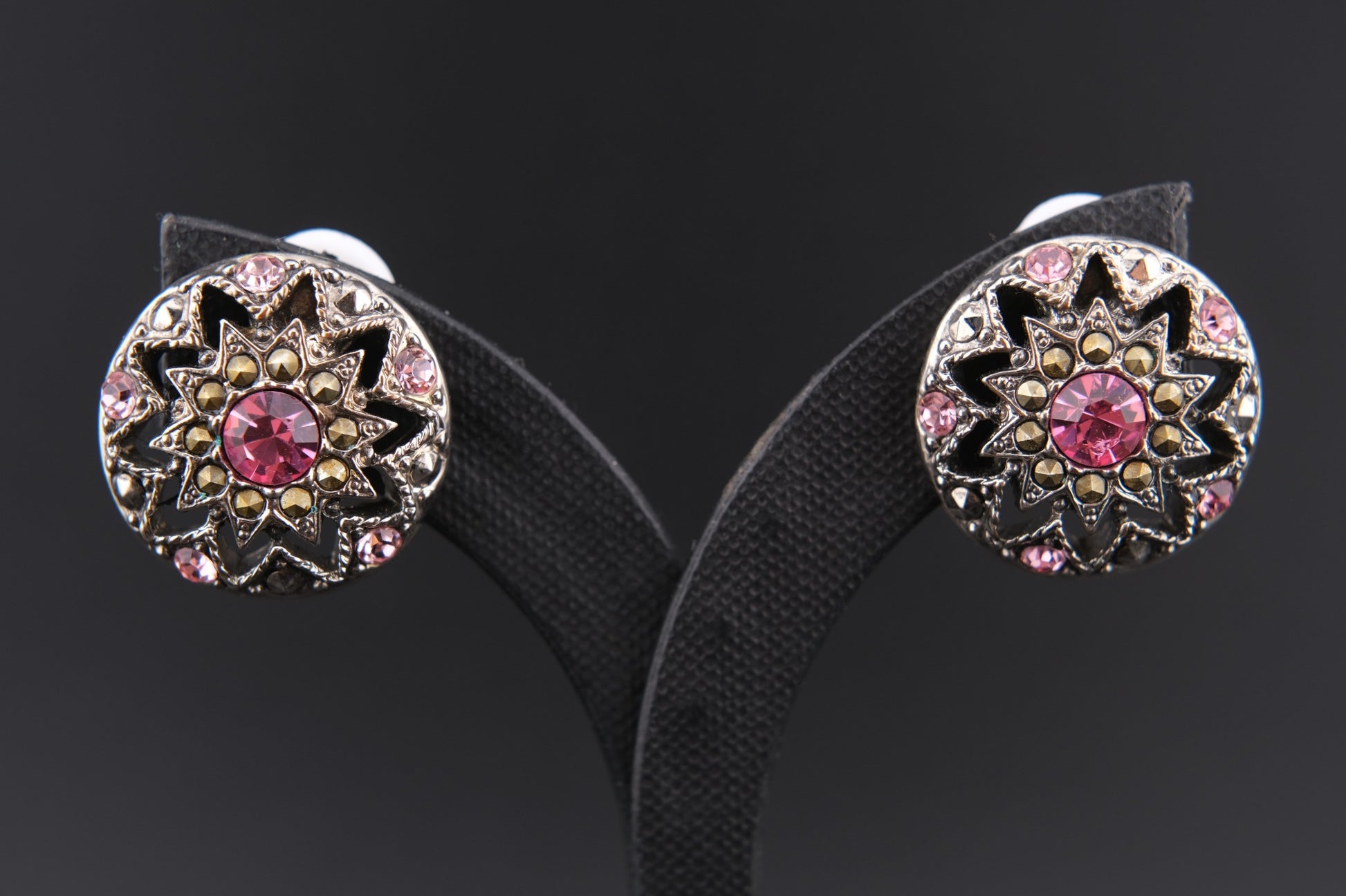 ❤️ Vintage 1928 Pink Crystal Medallion Clip Earrings – Silver-Tone, Made in USA