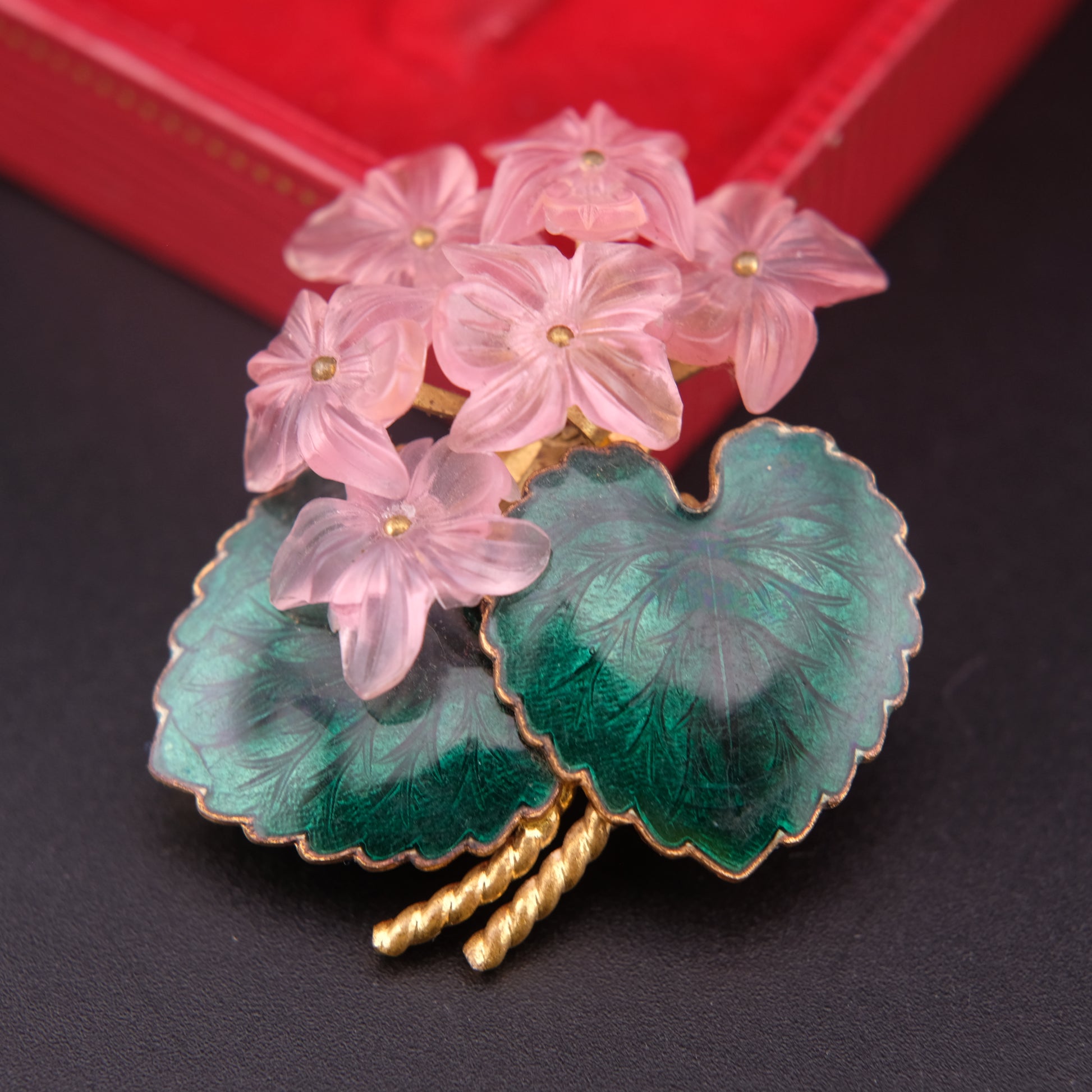 This lovely mid-century brooch captures the refined charm of 1950s–1960s West German craftsmanship. It features softly molded translucent pink lucite flowers with delicate gold-tone centers, beautifully complemented by rich green enameled leaves and twisted gold-tone stems. The design reflects the floral romanticism typical of postwar West German costume jewelry — light, feminine, and timelessly elegant.
