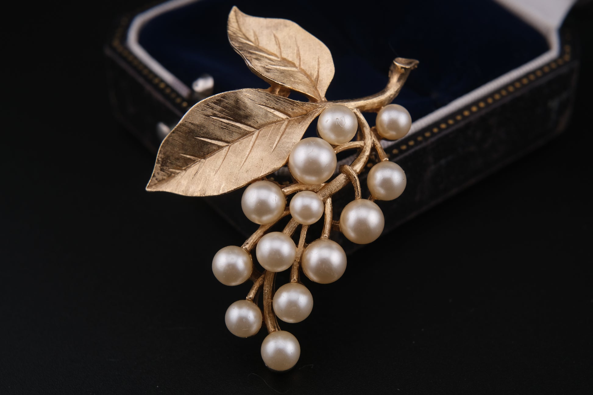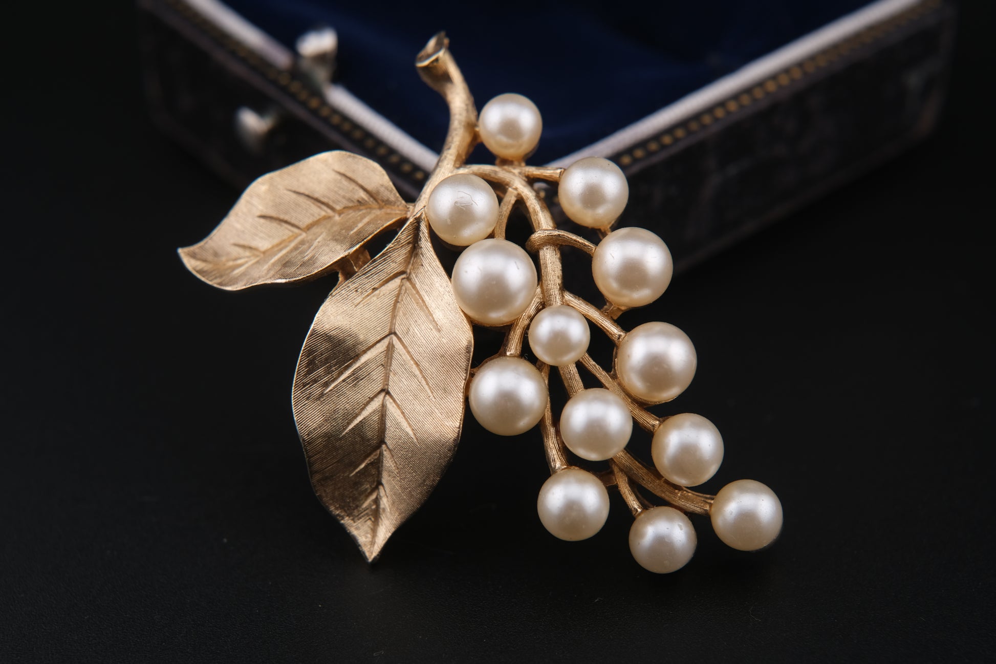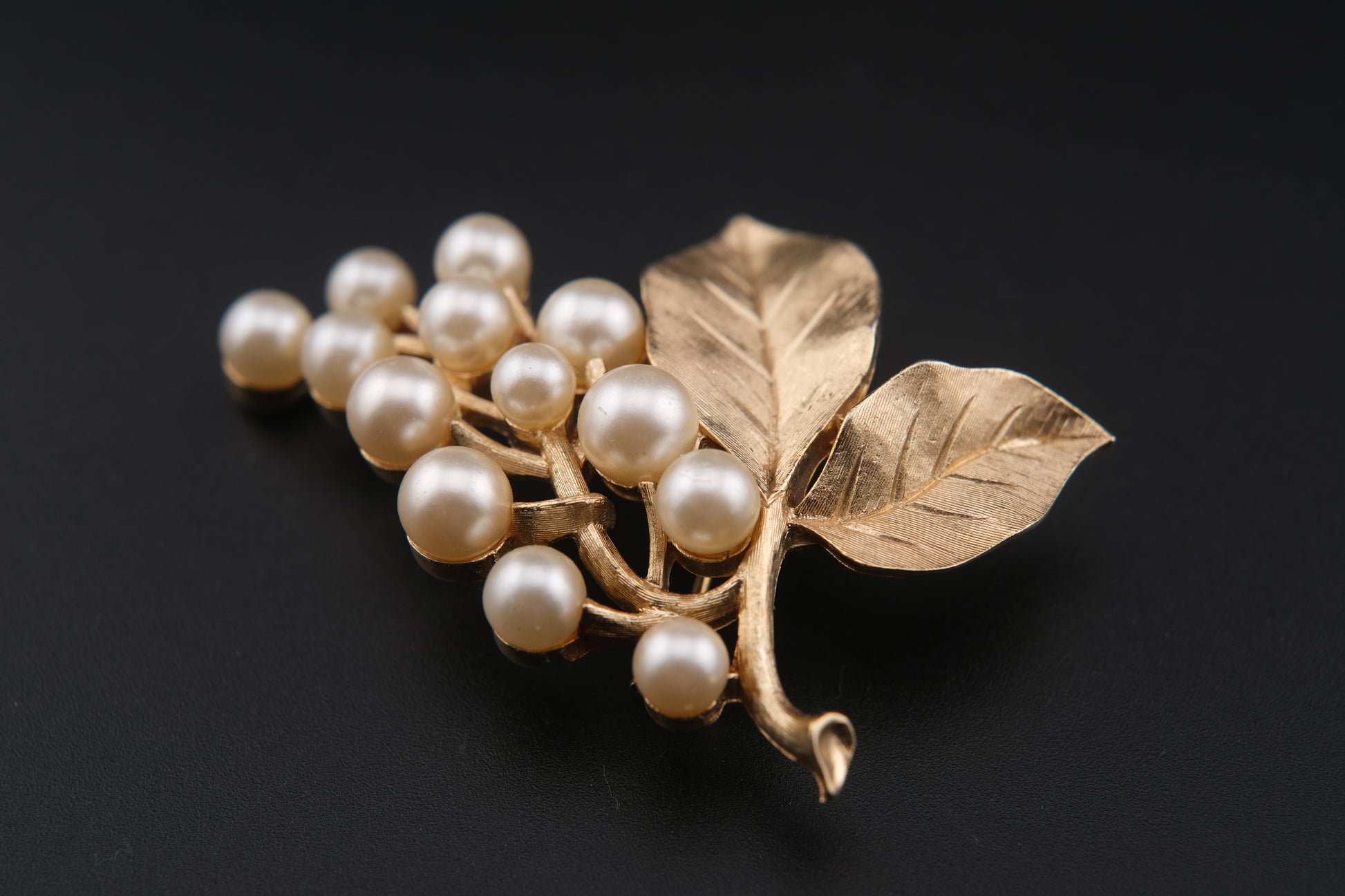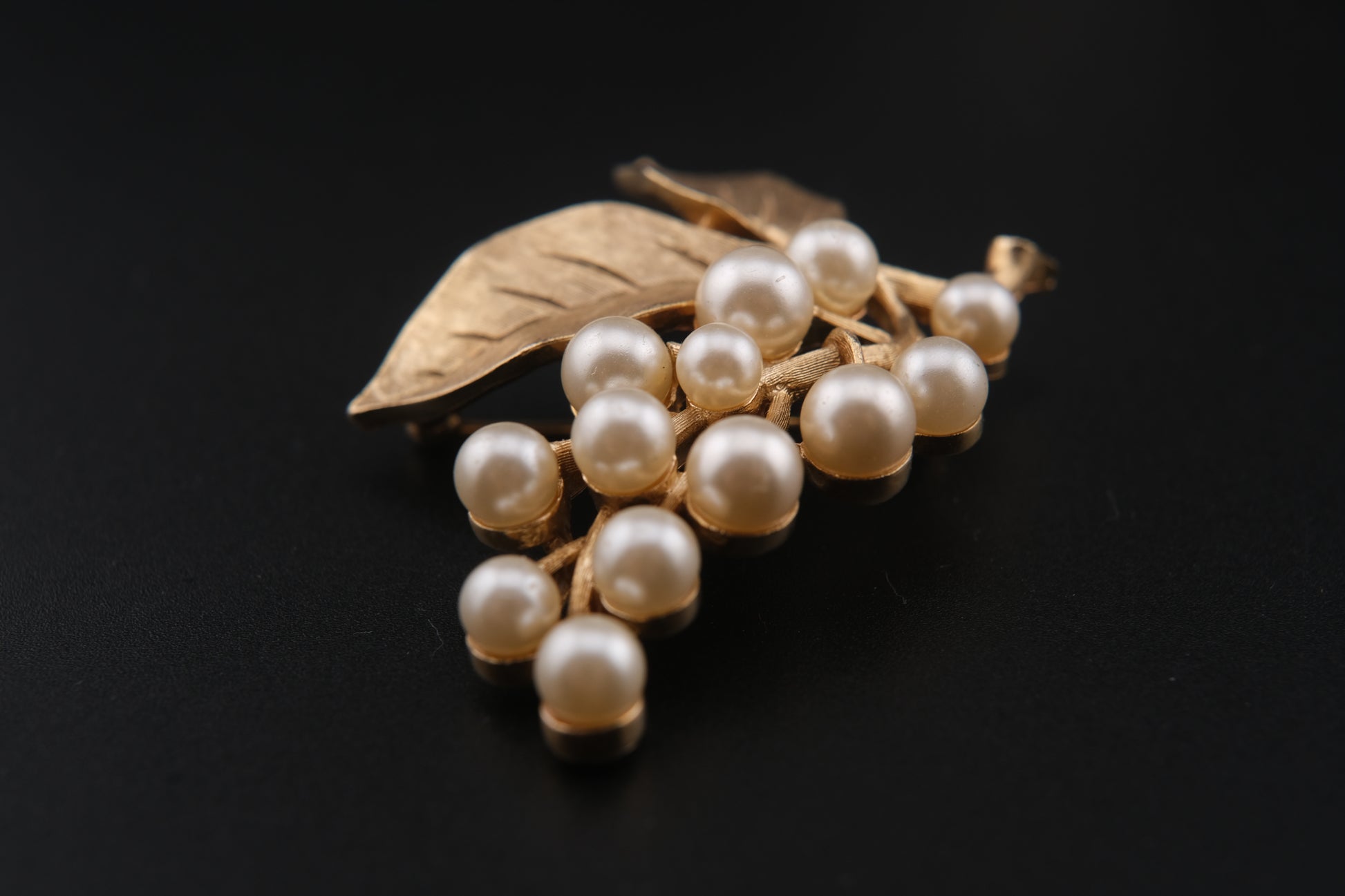 π Vintage Crown Trifari Faux Pearl Grape Cluster Brooch β Gold Tone with Leaf Detail