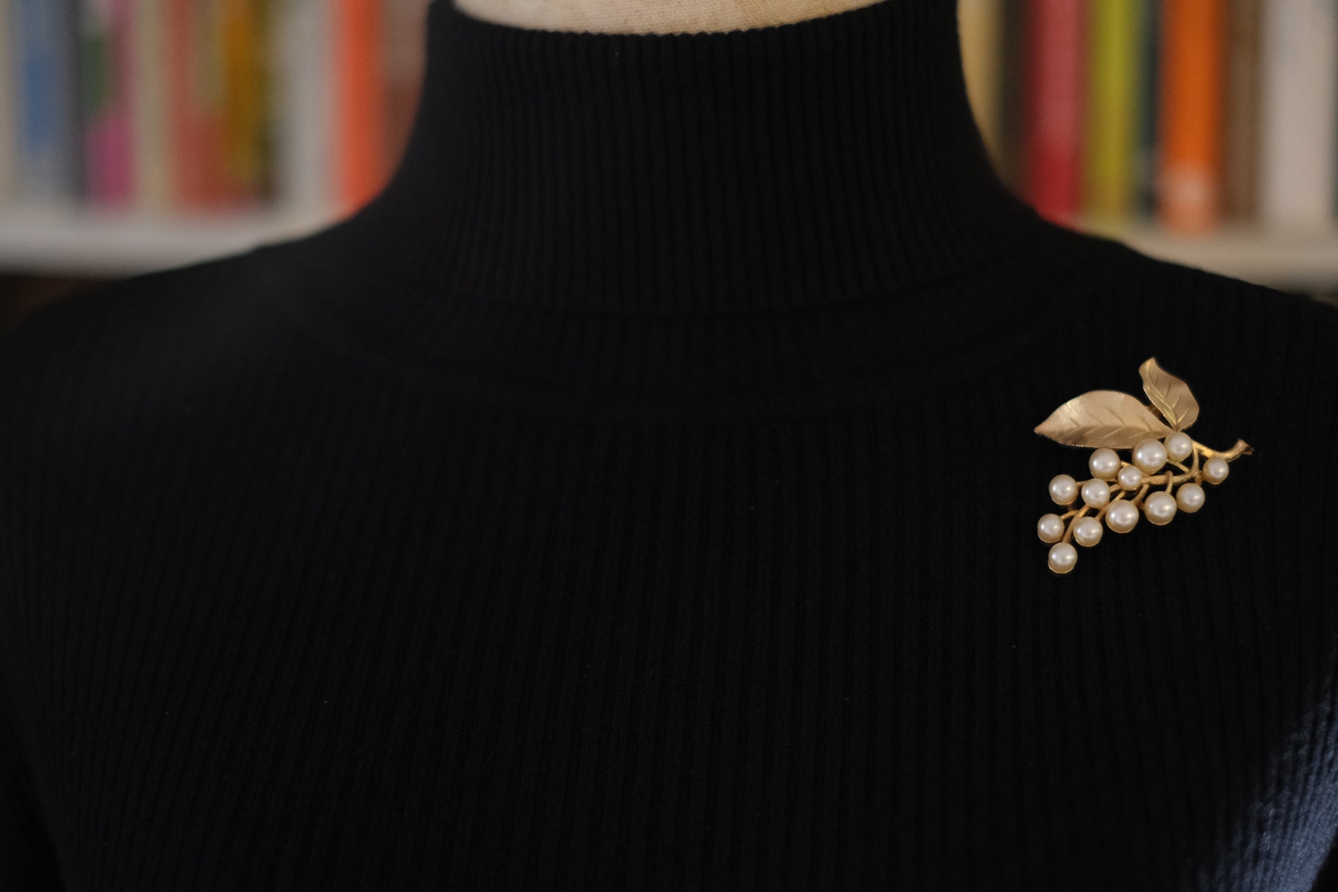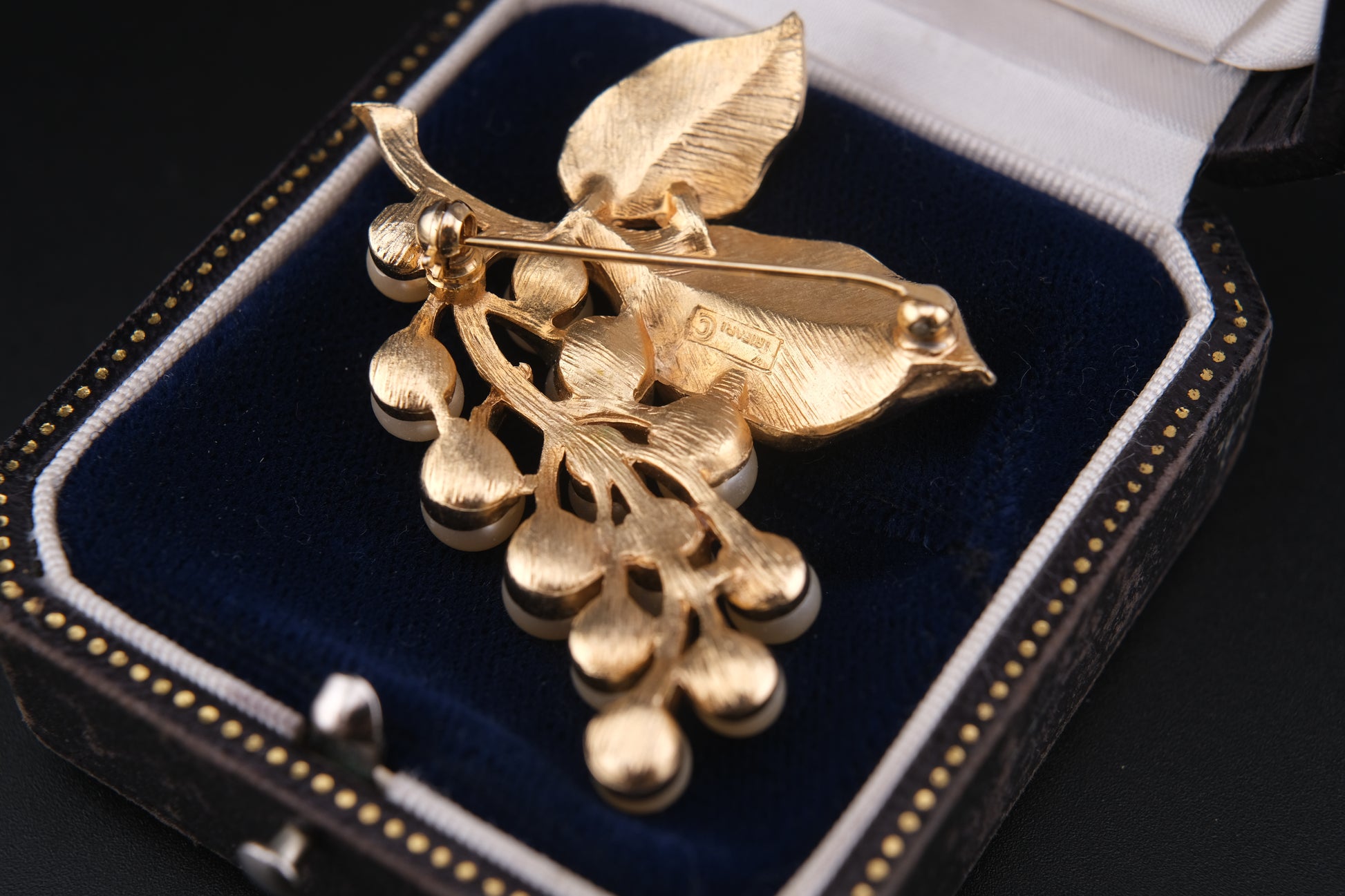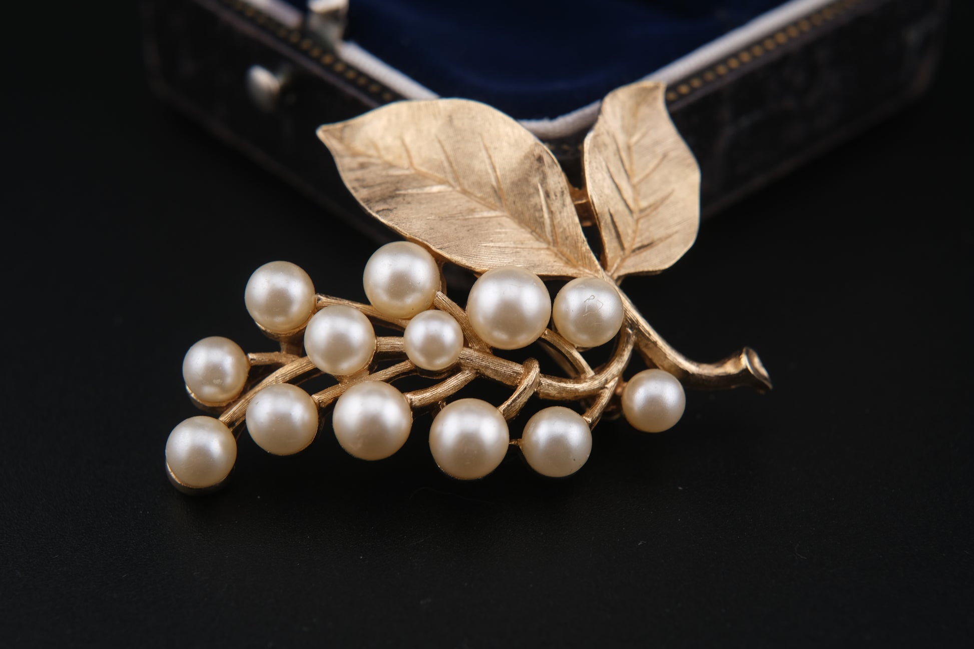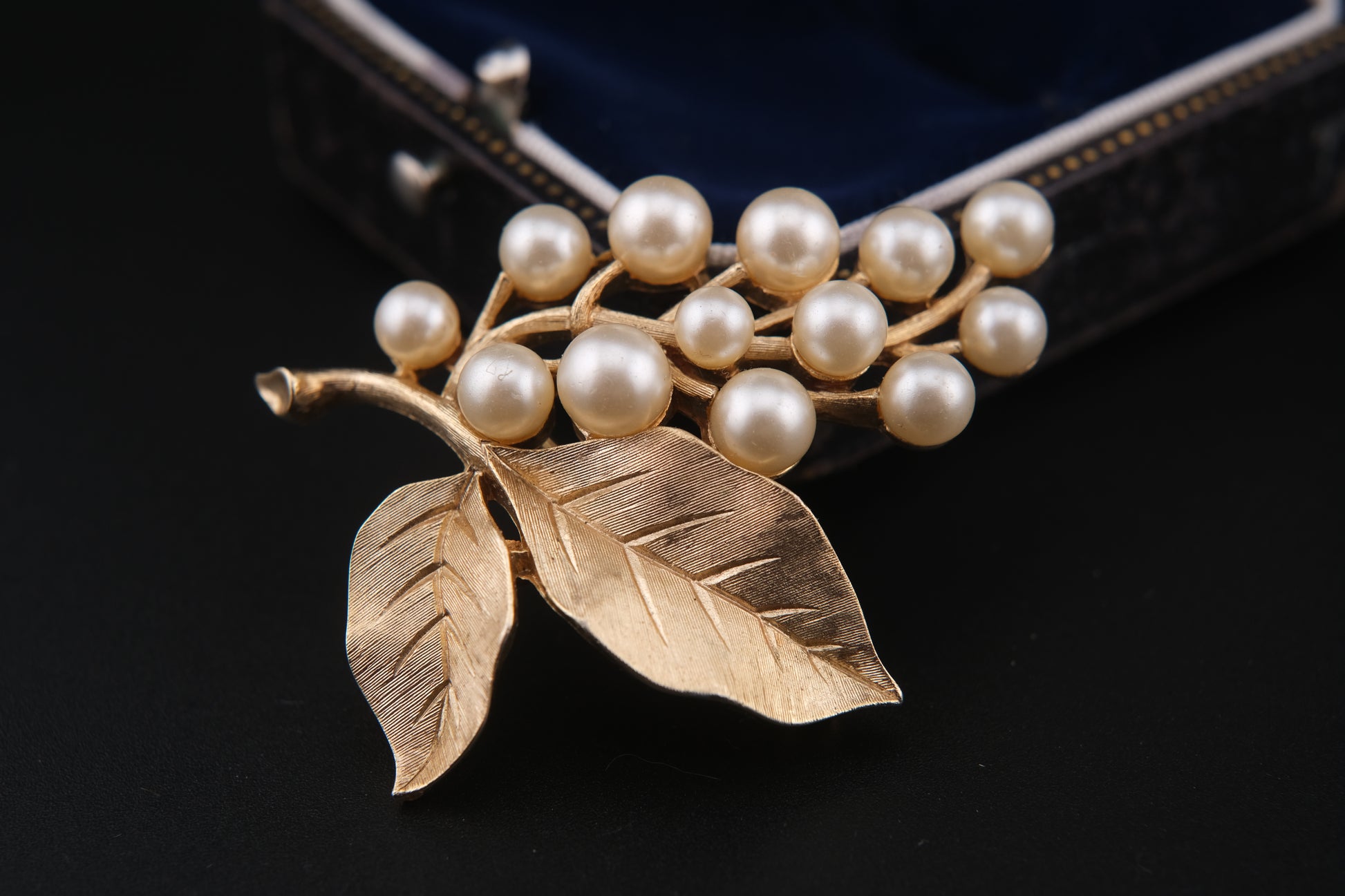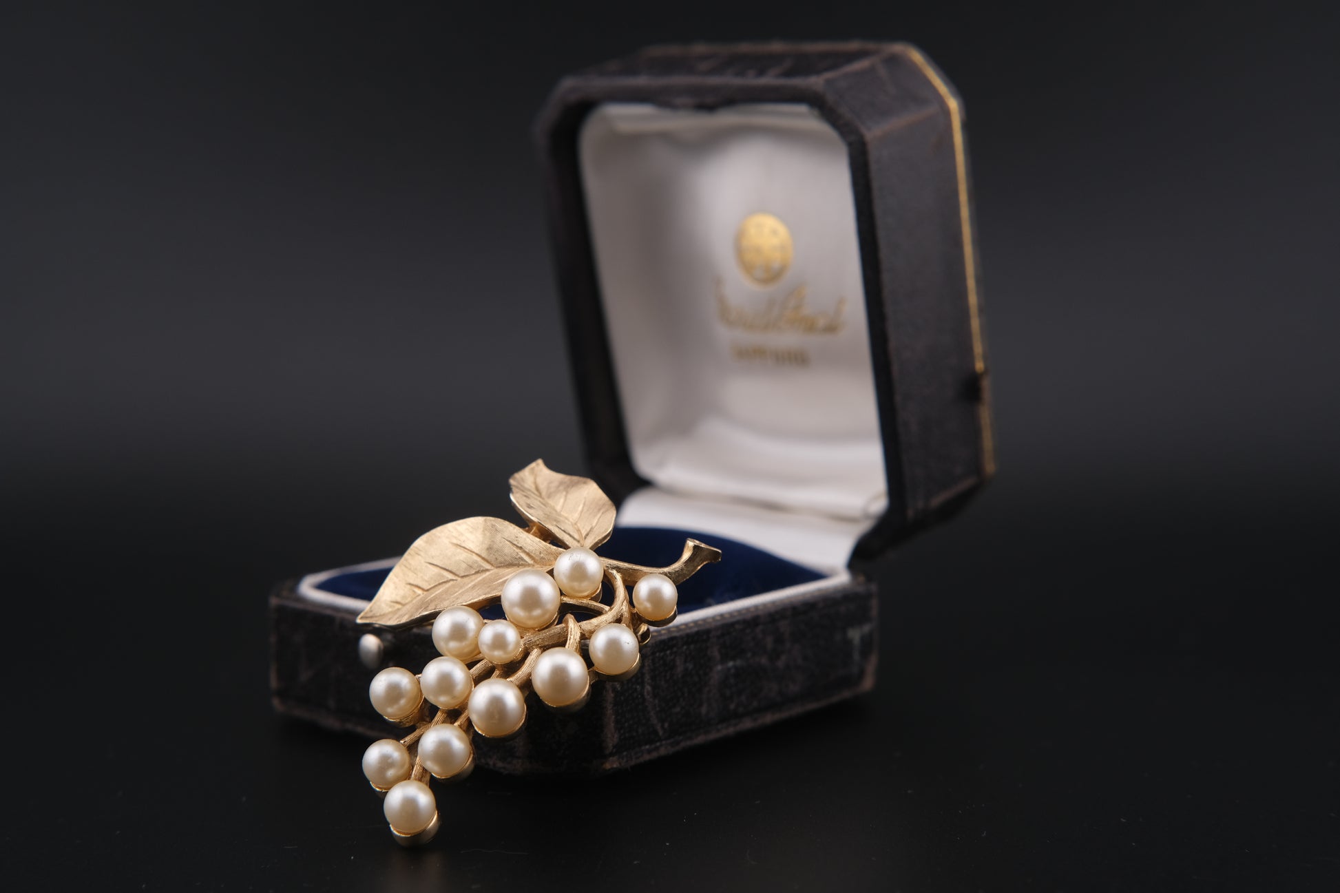 π Vintage Crown Trifari Faux Pearl Grape Cluster Brooch β Gold Tone with Leaf Detail