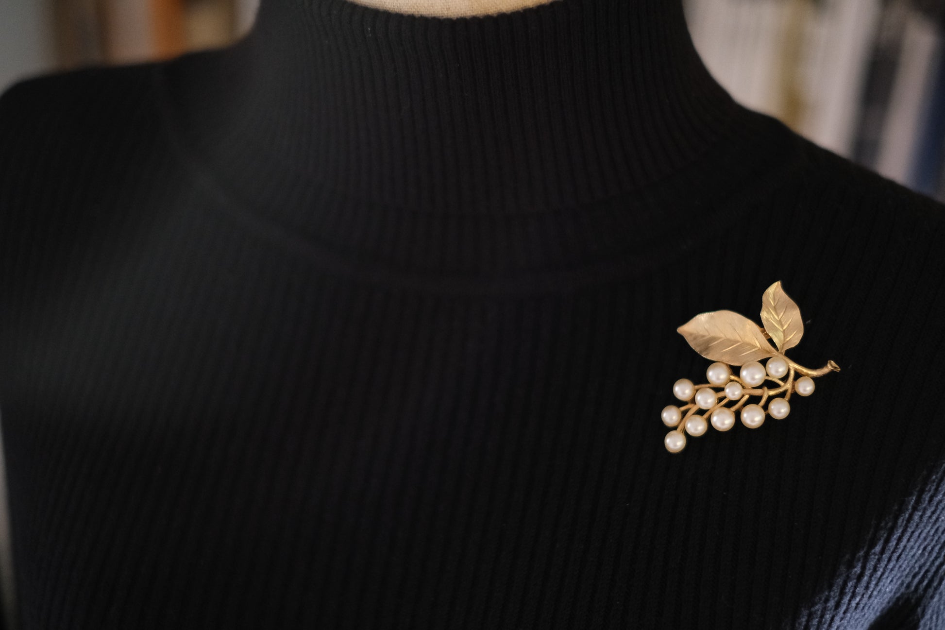 Elegant and timeless, this vintage Crown Trifari brooch captures the refined artistry of mid-century costume jewelry. Crafted in a graceful grape cluster motif, it features creamy faux pearls nestled against textured gold-tone leaves, evoking natureβs charm with a luxurious twist. Whether worn on a blazer, scarf, or dress, this signed piece is a sophisticated accent that elevates any look.