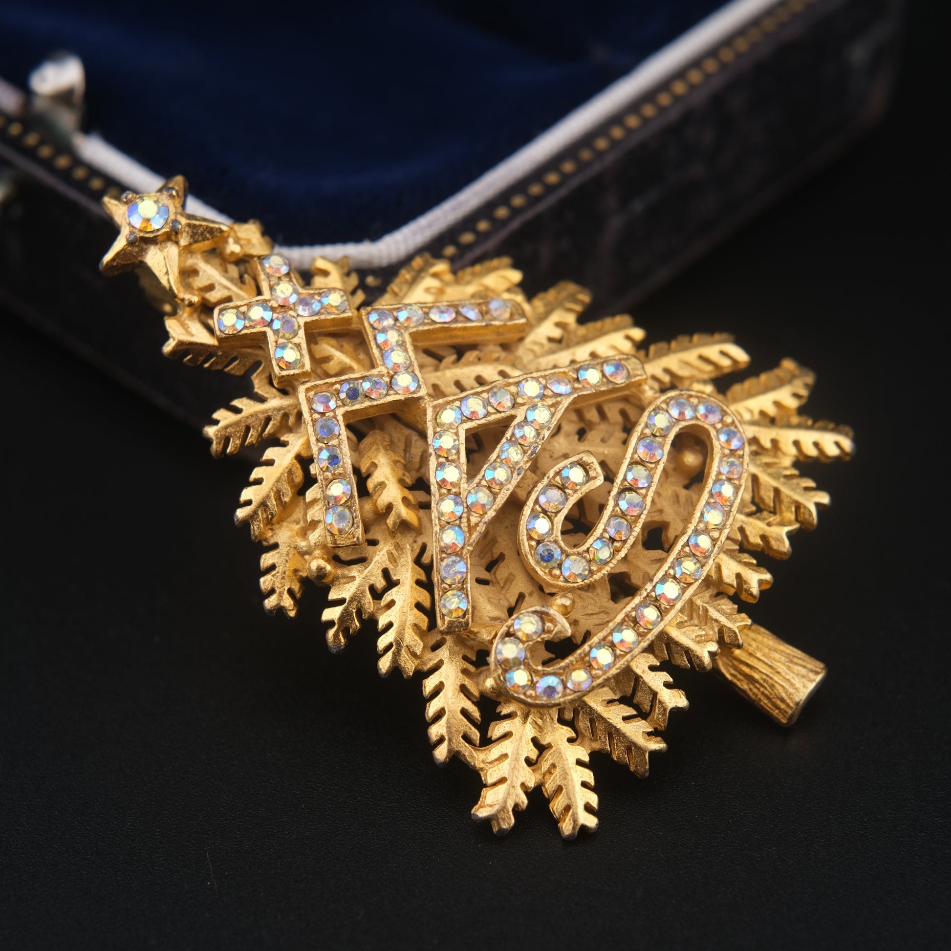 Celebrate timeless holiday charm with this beautifully crafted vintage Christmas tree brooch. Designed in a rich gold-tone finish, the piece features finely detailed, layered branch textures that give the tree wonderful depth and dimension. The front is accented with sparkling aurora borealis rhinestones, arranged in graceful scroll and geometric motifs, catching the light with subtle rainbow flashes.