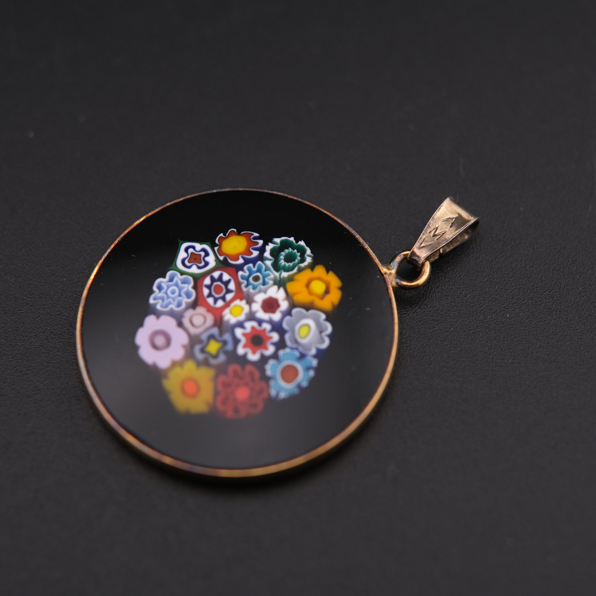 - Design: Round black glass pendant with multicolored millefiori floral mosaic