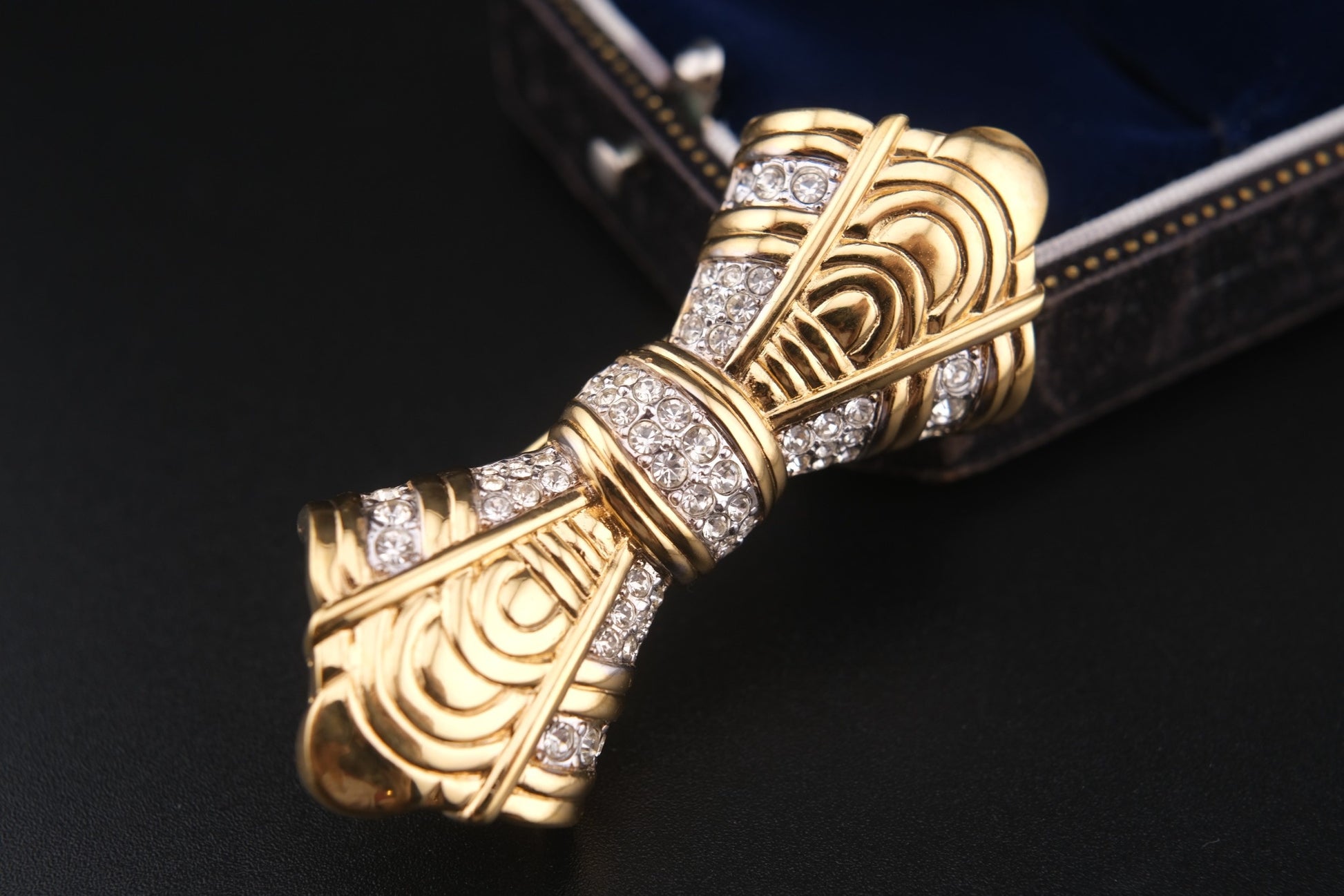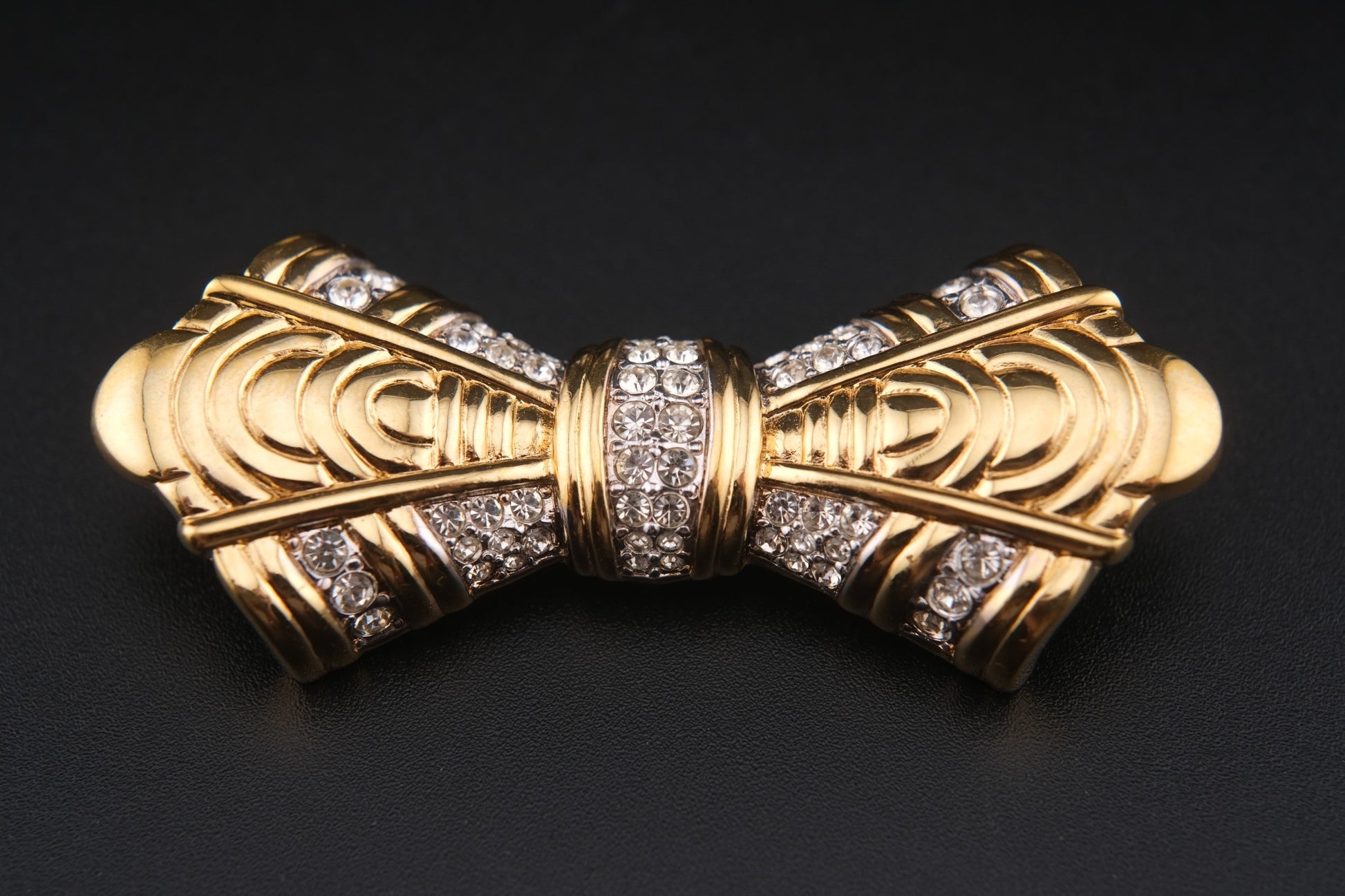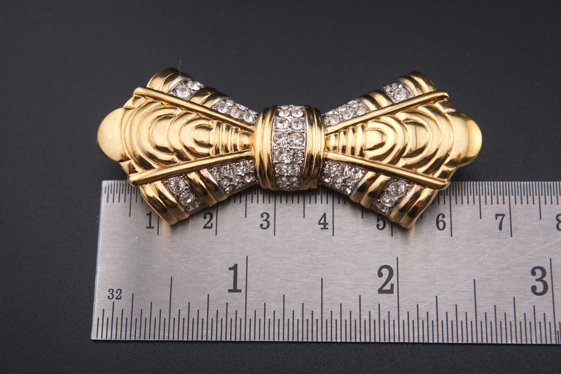 - Design: Sculptural bow with Art Deco-inspired arc pattern and pavé rhinestones