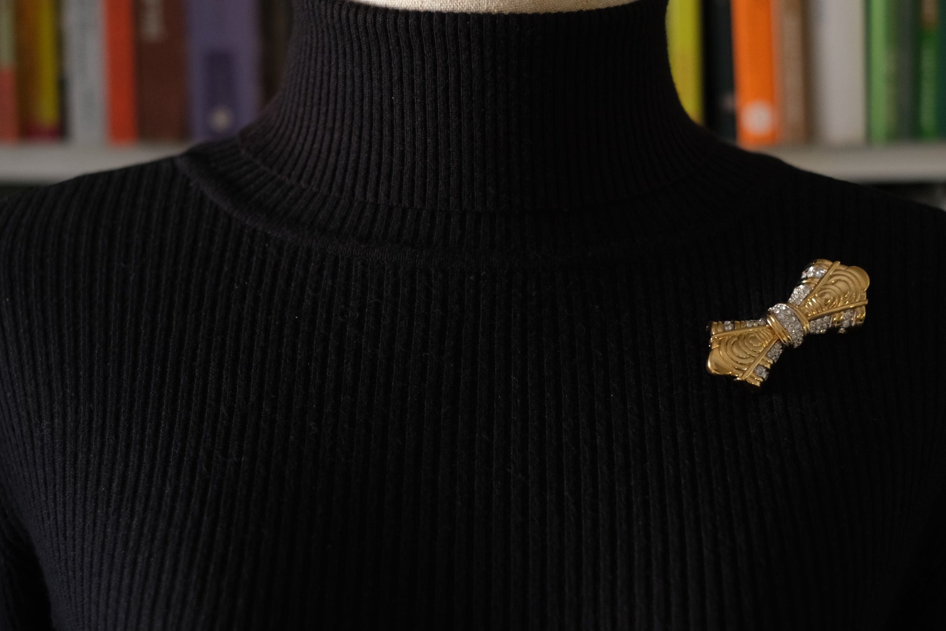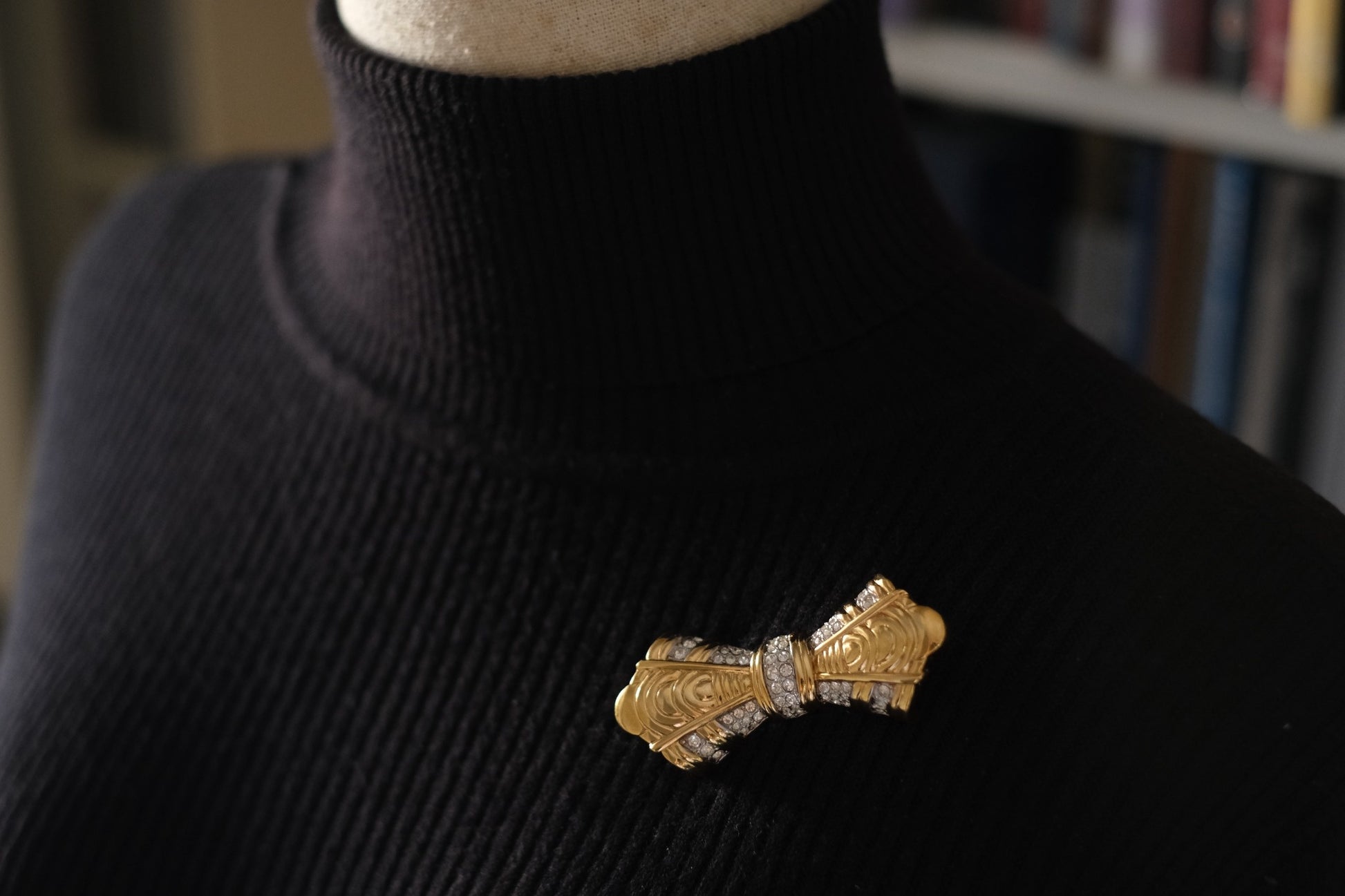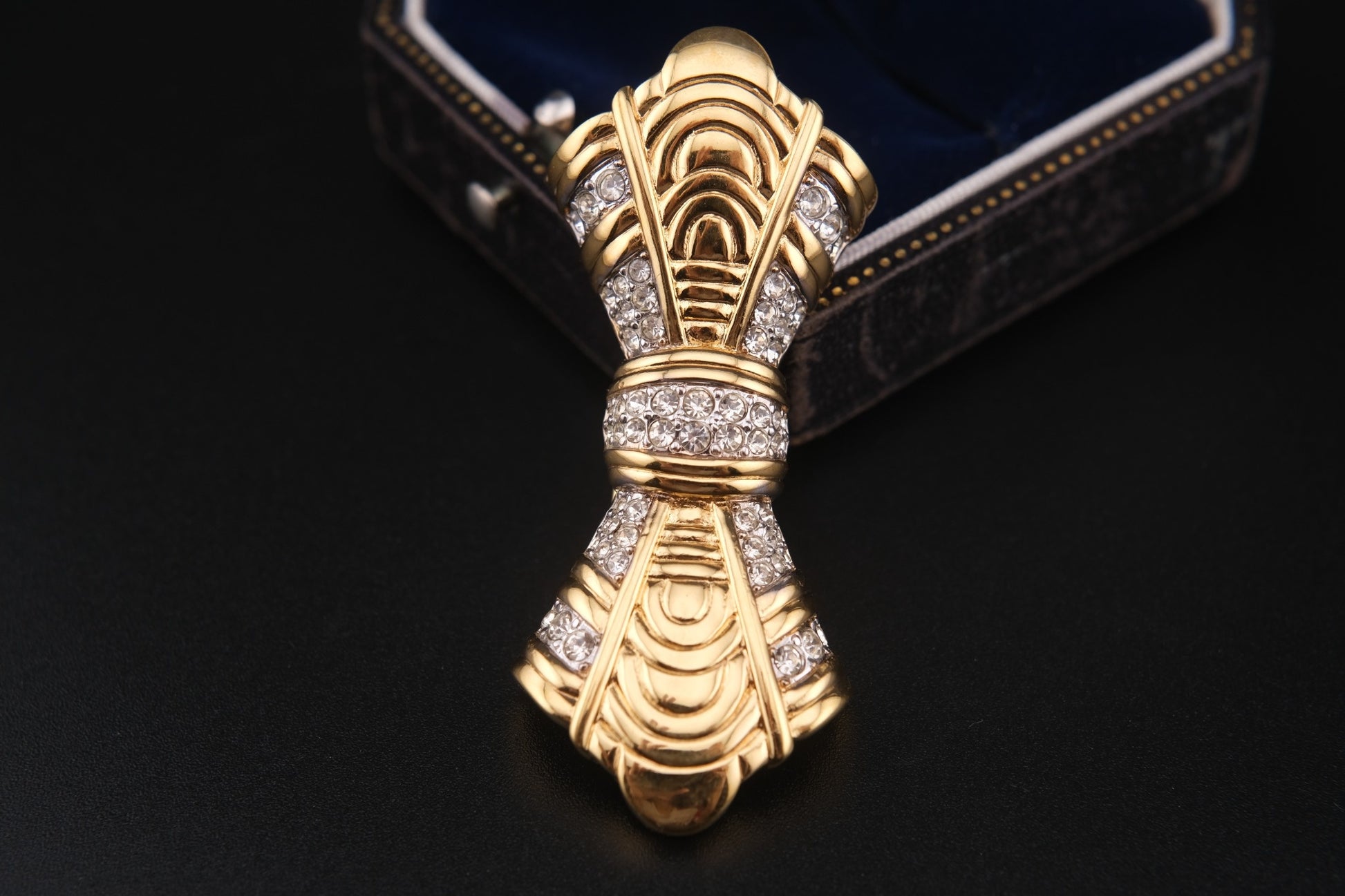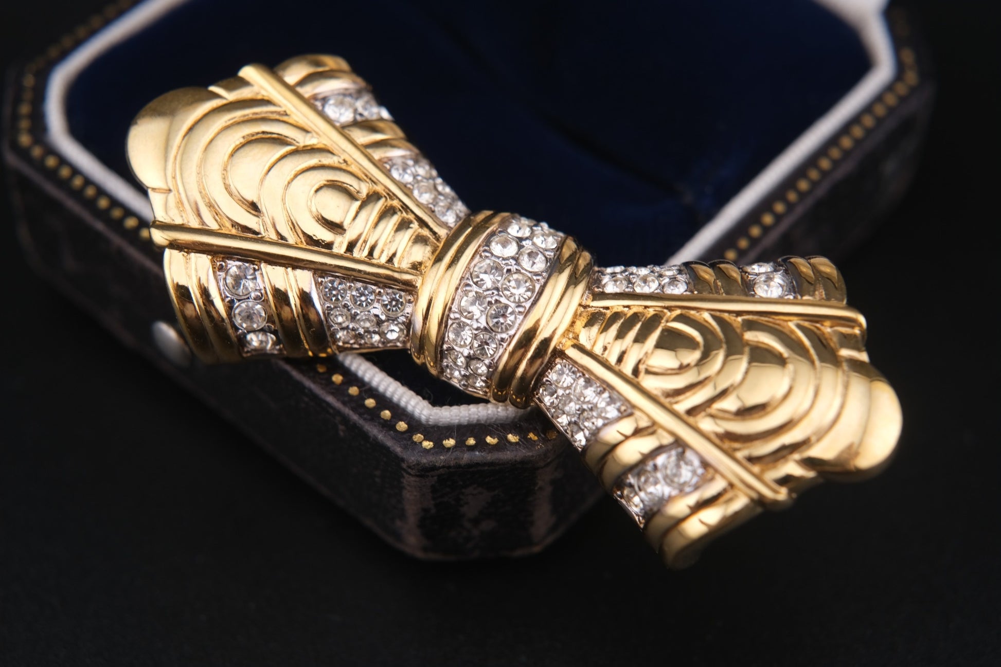 - Design: Sculptural bow with Art Deco-inspired arc pattern and pavé rhinestones