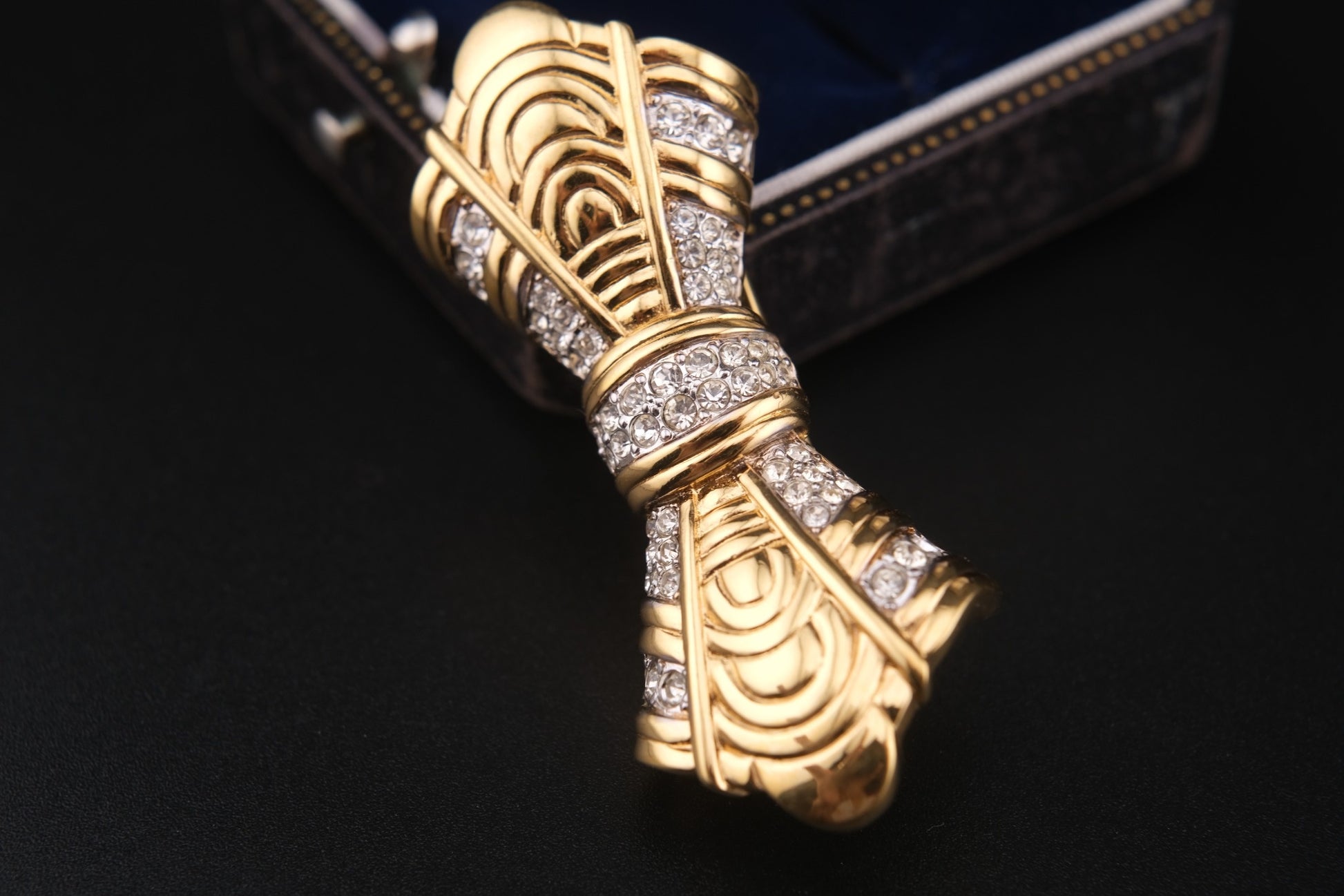 Exquisitely crafted in a bold bow design, this statement piece features richly textured gold-tone metal accented with rows of glittering pavé-set clear rhinestones. The sweeping Art Deco-inspired curves and dimensional ribbon motif lend timeless sophistication and vintage glamour to any outfit. Signed on the reverse, this brooch exemplifies Nina Ricci’s enduring elegance and Parisian refinement.