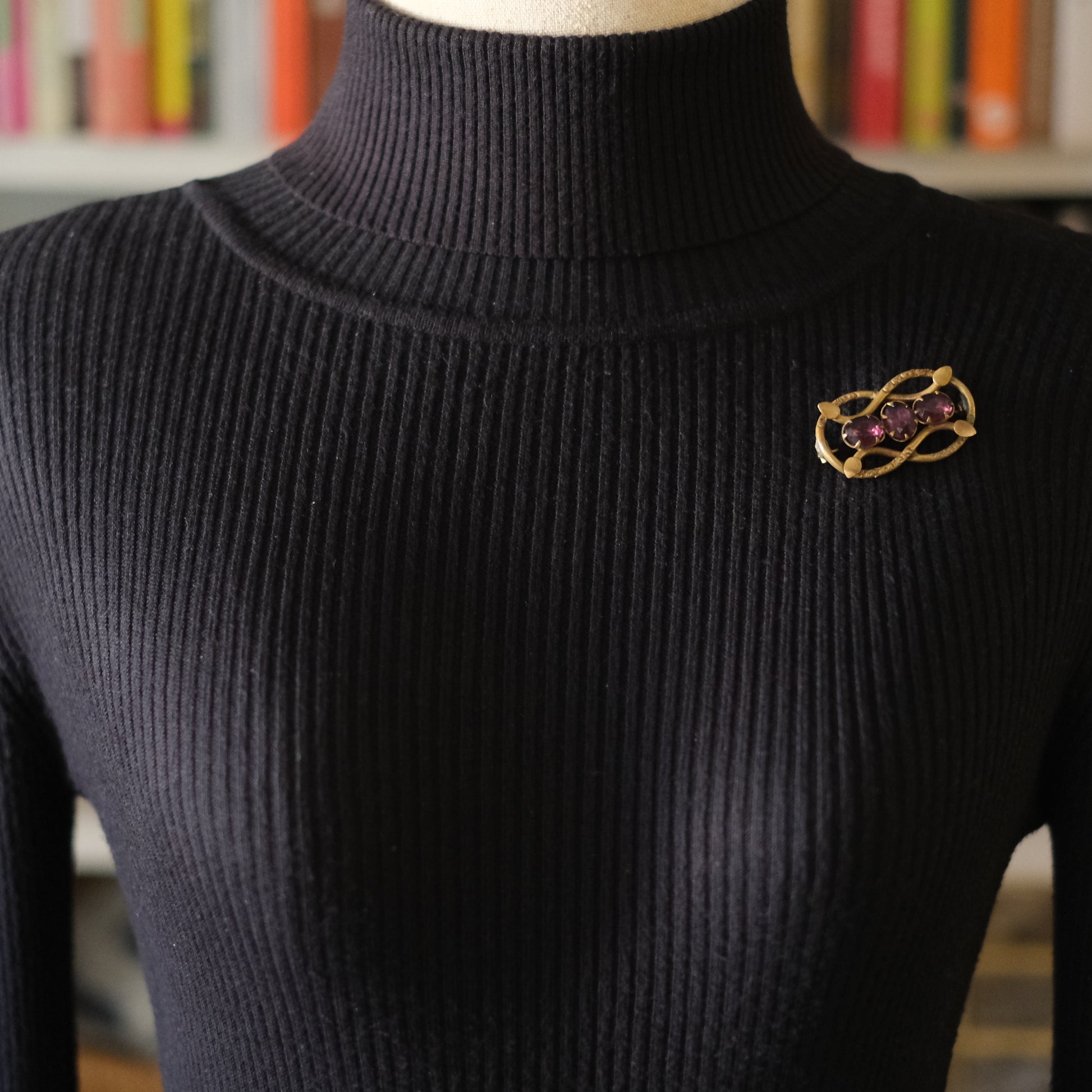 At the center sit three rich garnet-red faceted paste stones, glowing with deep wine and plum undertones that catch the light beautifully from every angle. The sculptural openwork frame gives the brooch wonderful dimension while remaining refined and wearable.