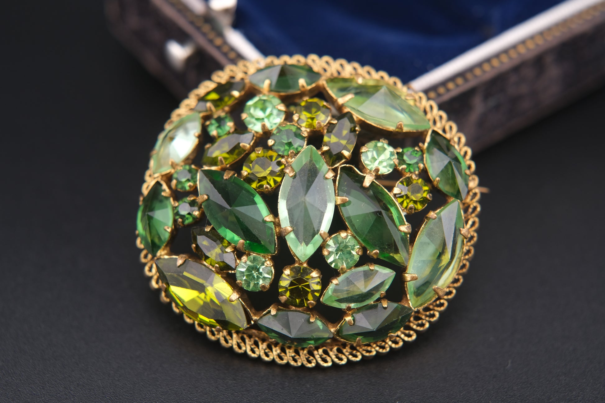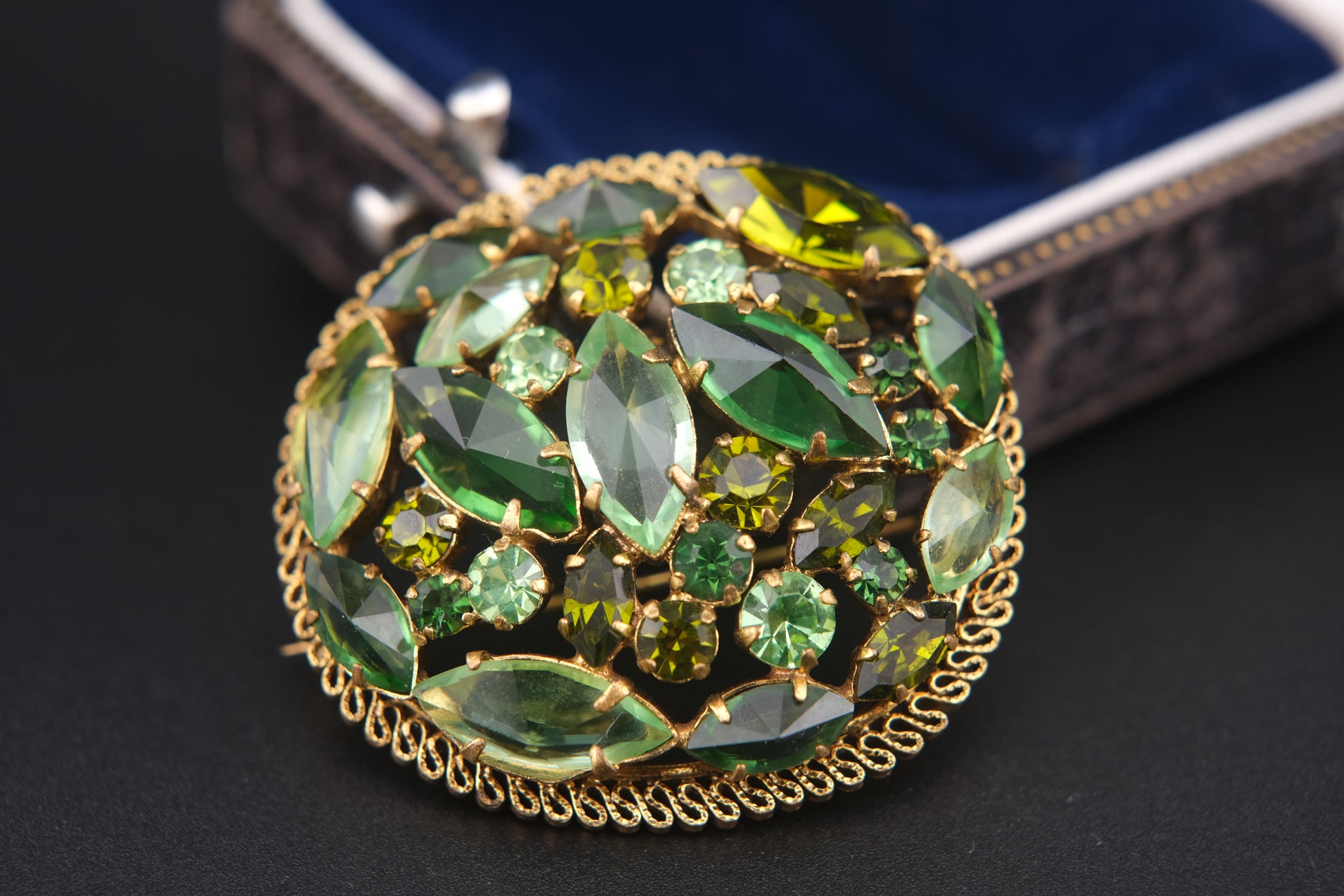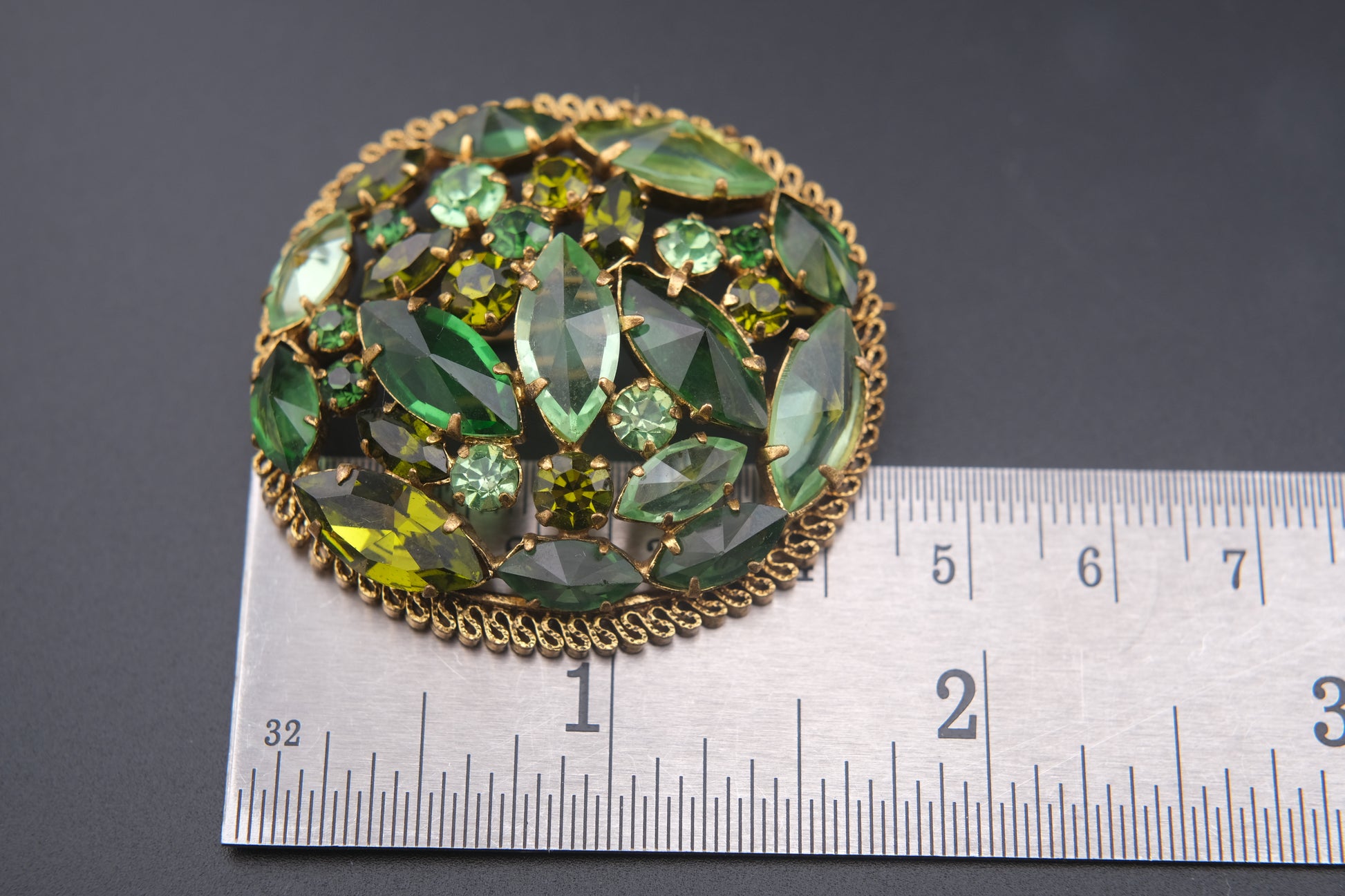 Add a pop of lush green sparkle to your collection with this vintage Austrian brooch, crafted in the mid-20th century. The design features an intricate gold-tone filigree frame set with a vibrant mix of emerald, olive, and peridot green glass rhinestones. Both navette- and round-cut stones are artistically layered to create a dimensional, light-catching effect, showcasing the fine craftsmanship for which Austrian costume jewelry is renowned. Measuring approximately 1.7 inches across, this elegant piece is perfect for adding vintage glamour to jackets, scarves, or dresses.
