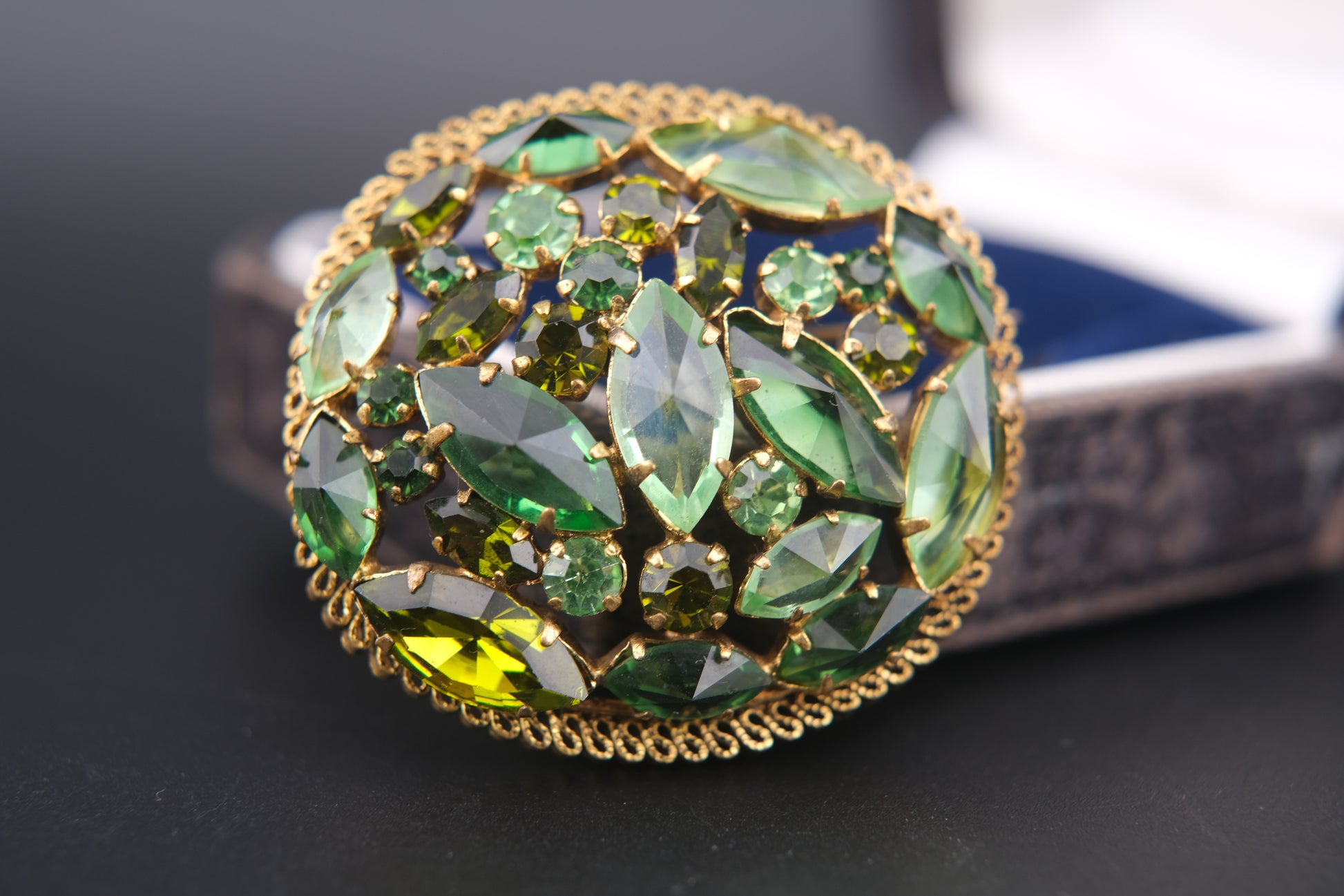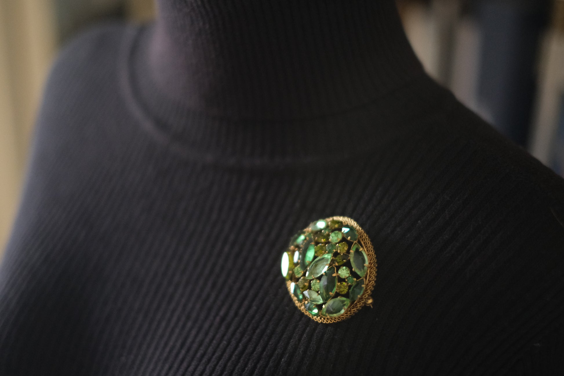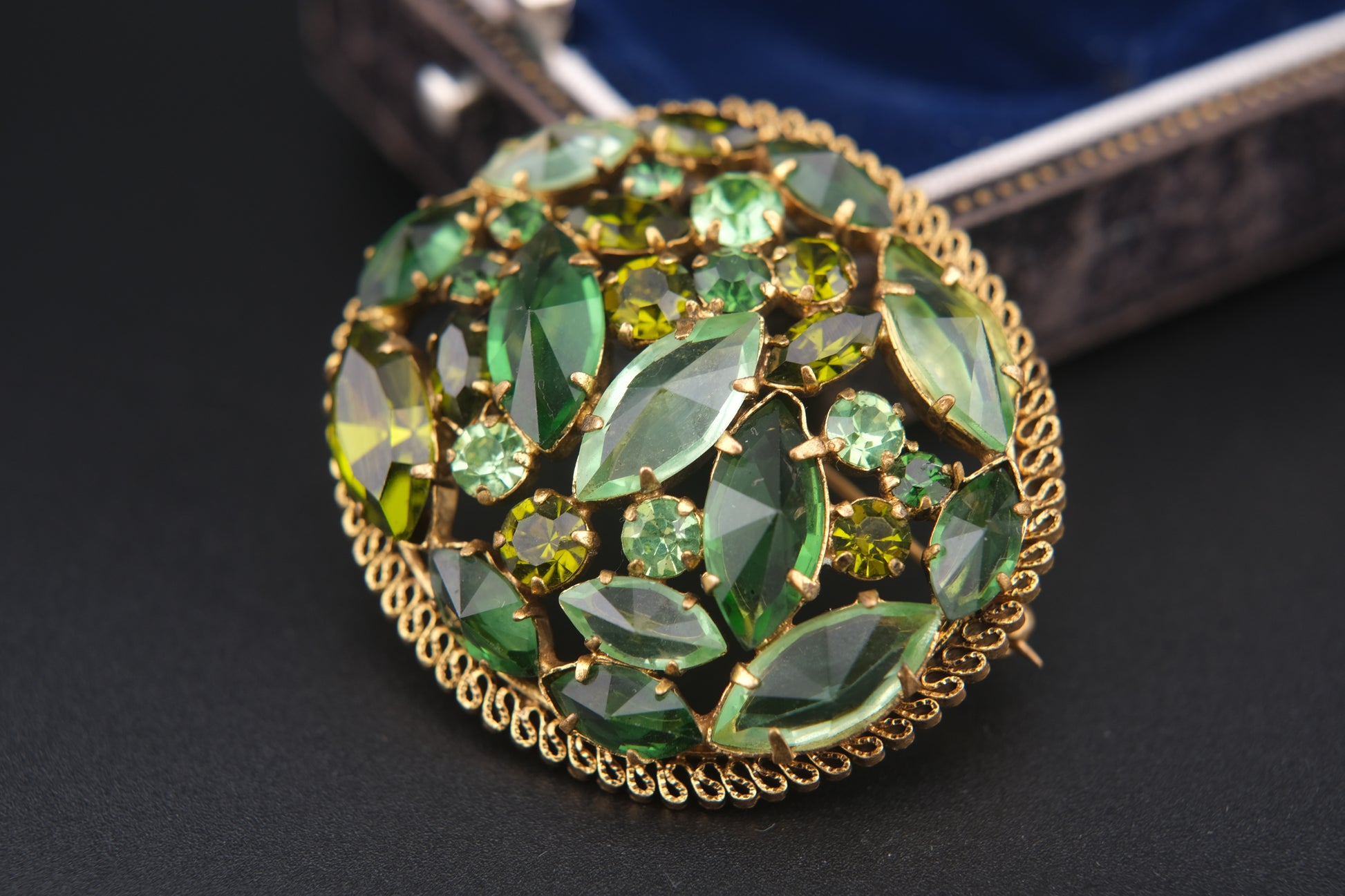 Add a pop of lush green sparkle to your collection with this vintage Austrian brooch, crafted in the mid-20th century. The design features an intricate gold-tone filigree frame set with a vibrant mix of emerald, olive, and peridot green glass rhinestones. Both navette- and round-cut stones are artistically layered to create a dimensional, light-catching effect, showcasing the fine craftsmanship for which Austrian costume jewelry is renowned. Measuring approximately 1.7 inches across, this elegant piece is perfect for adding vintage glamour to jackets, scarves, or dresses.