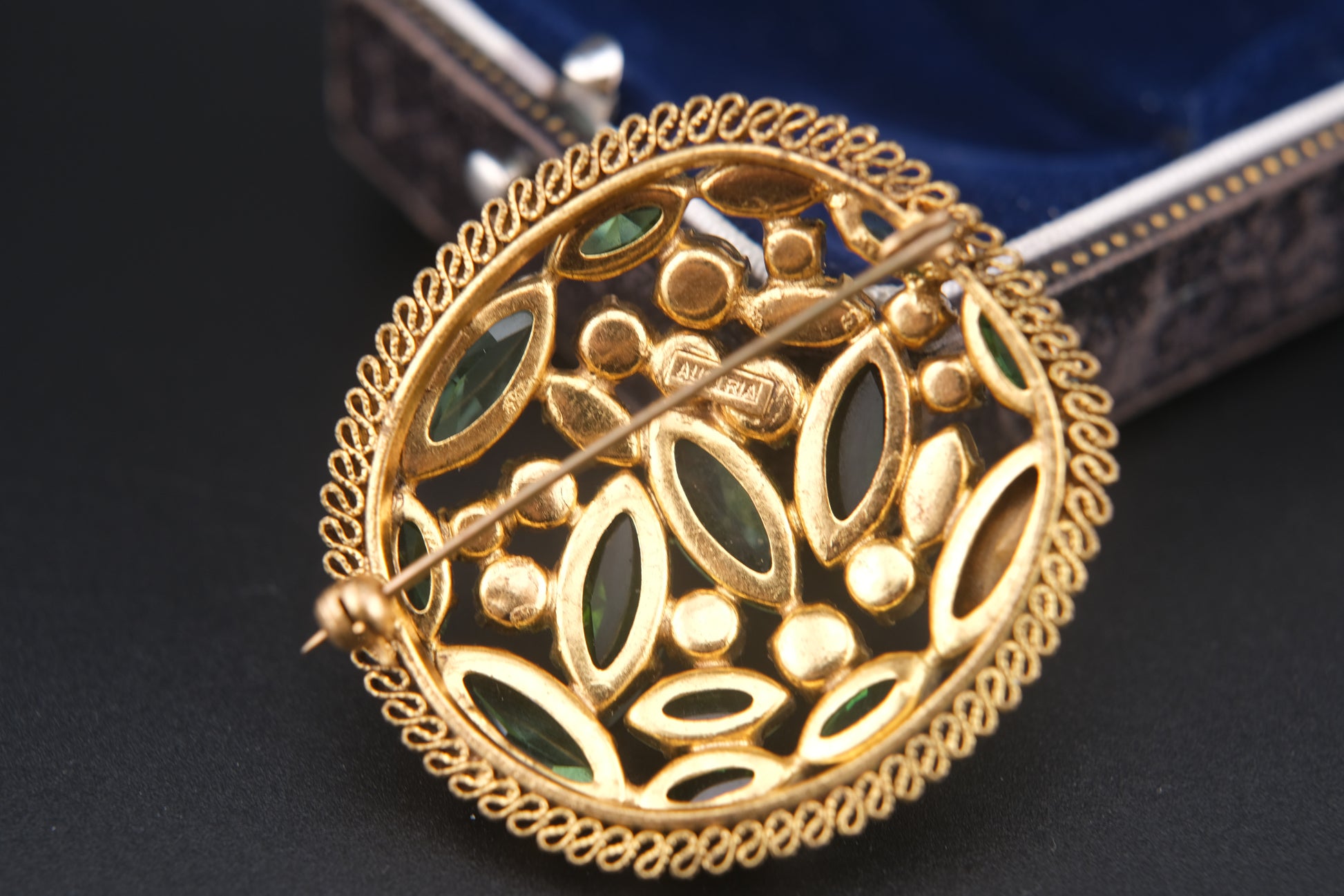 Austria Green Rhinestone Brooch – Gold-Tone Filigree with Navette & Round-Cut Stones