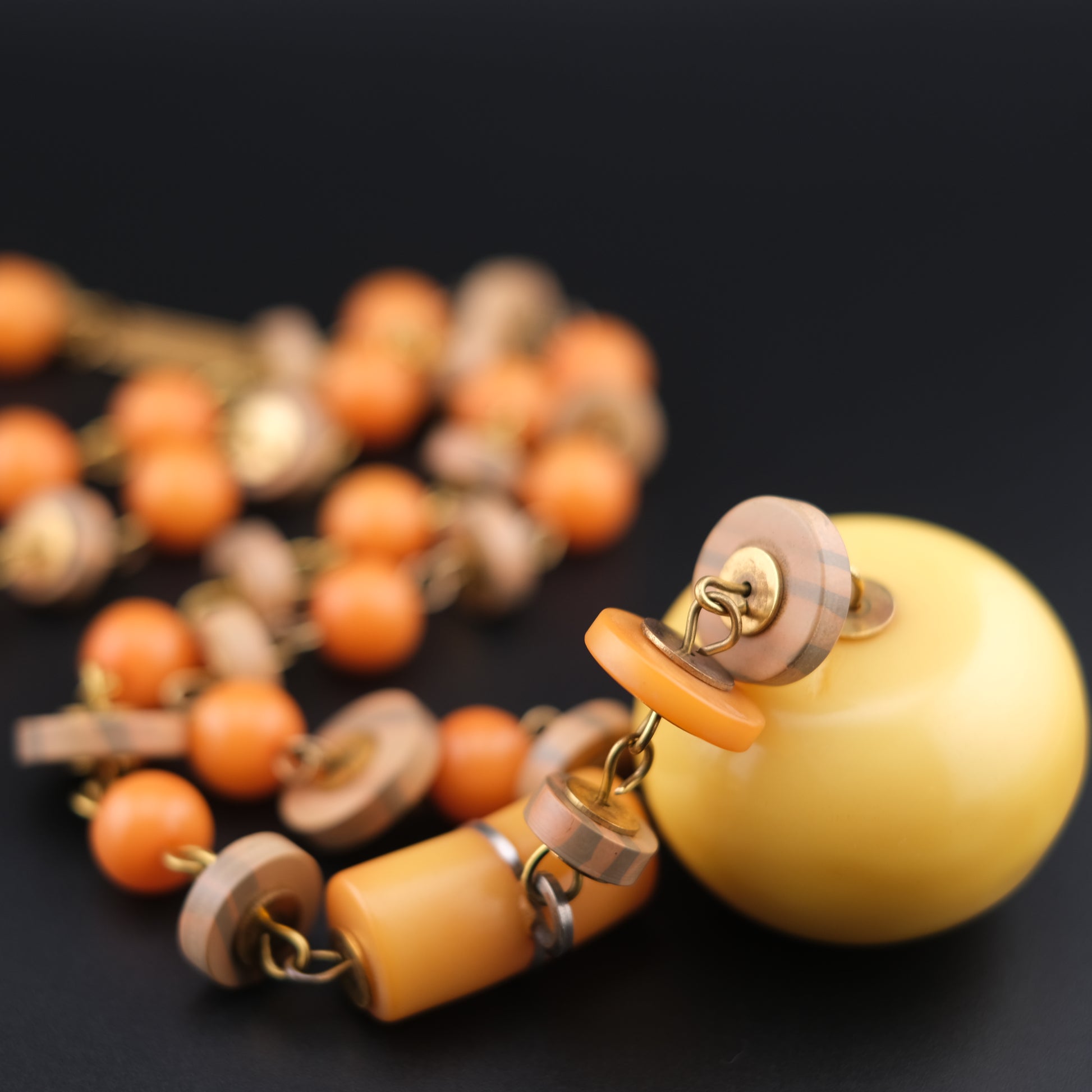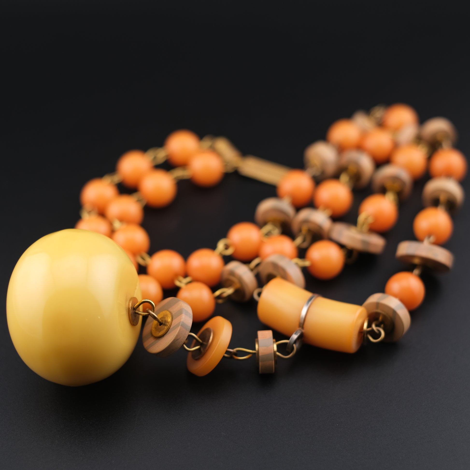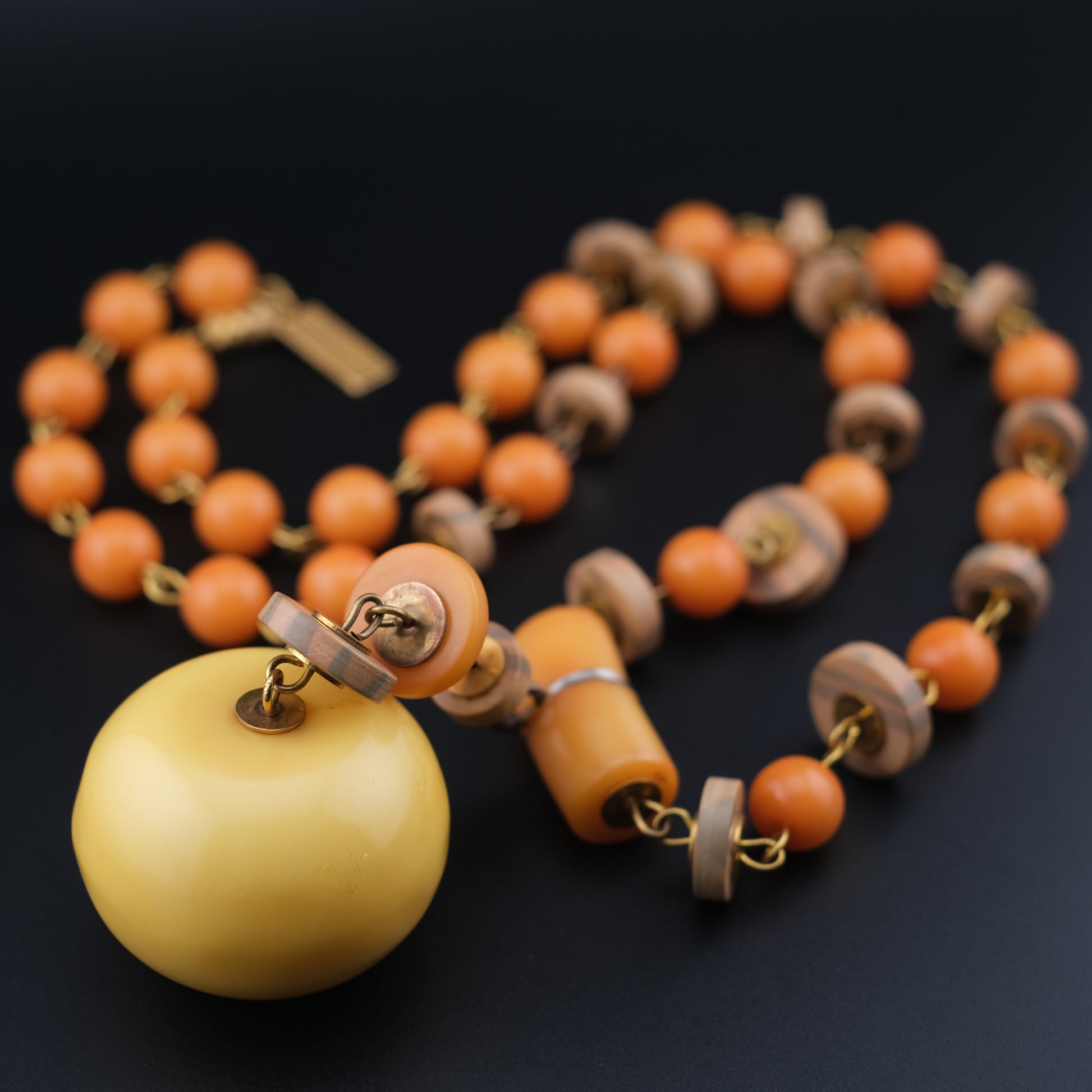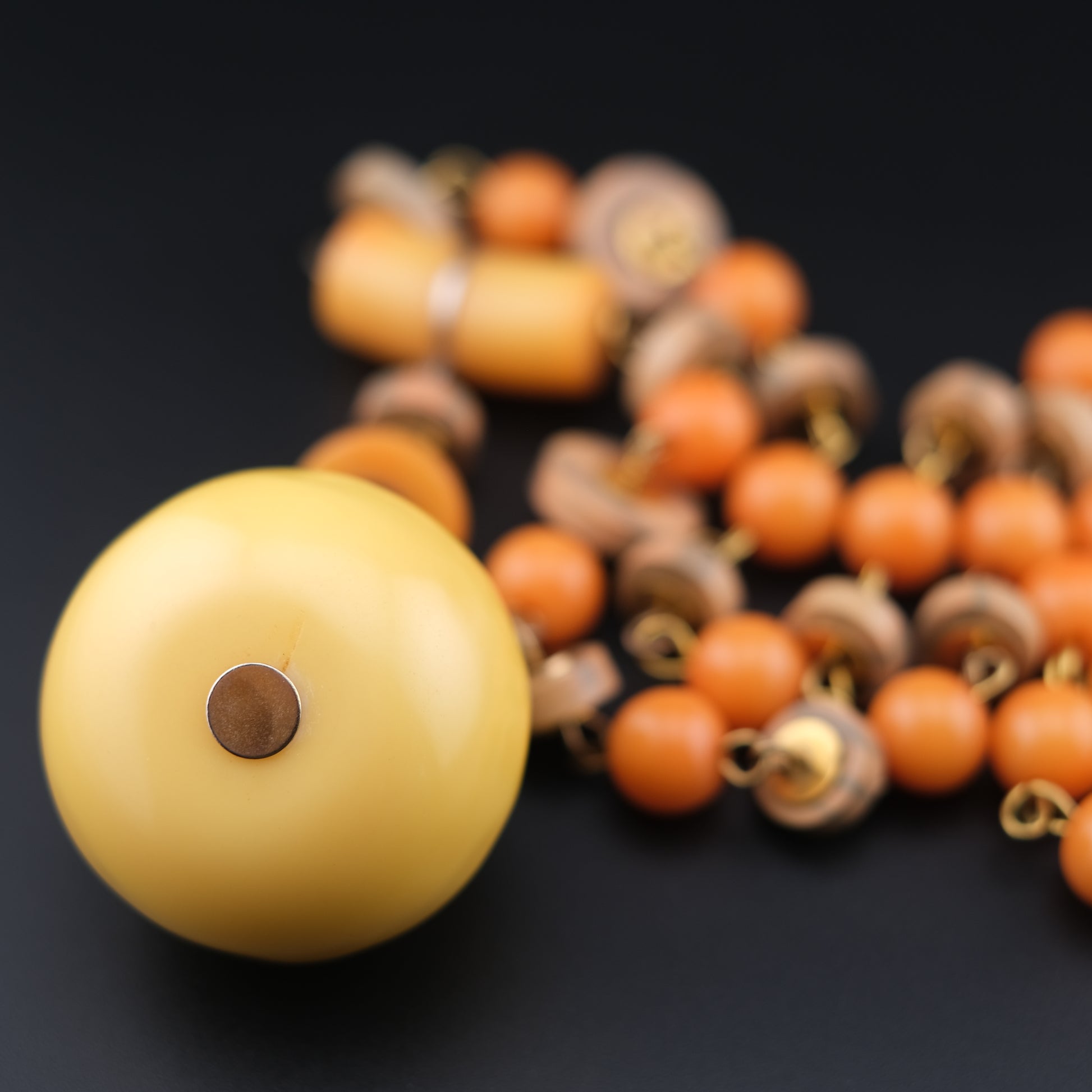 - Design: Graduated round orange beads, wood-tone spacers, oversized yellow pendant drop