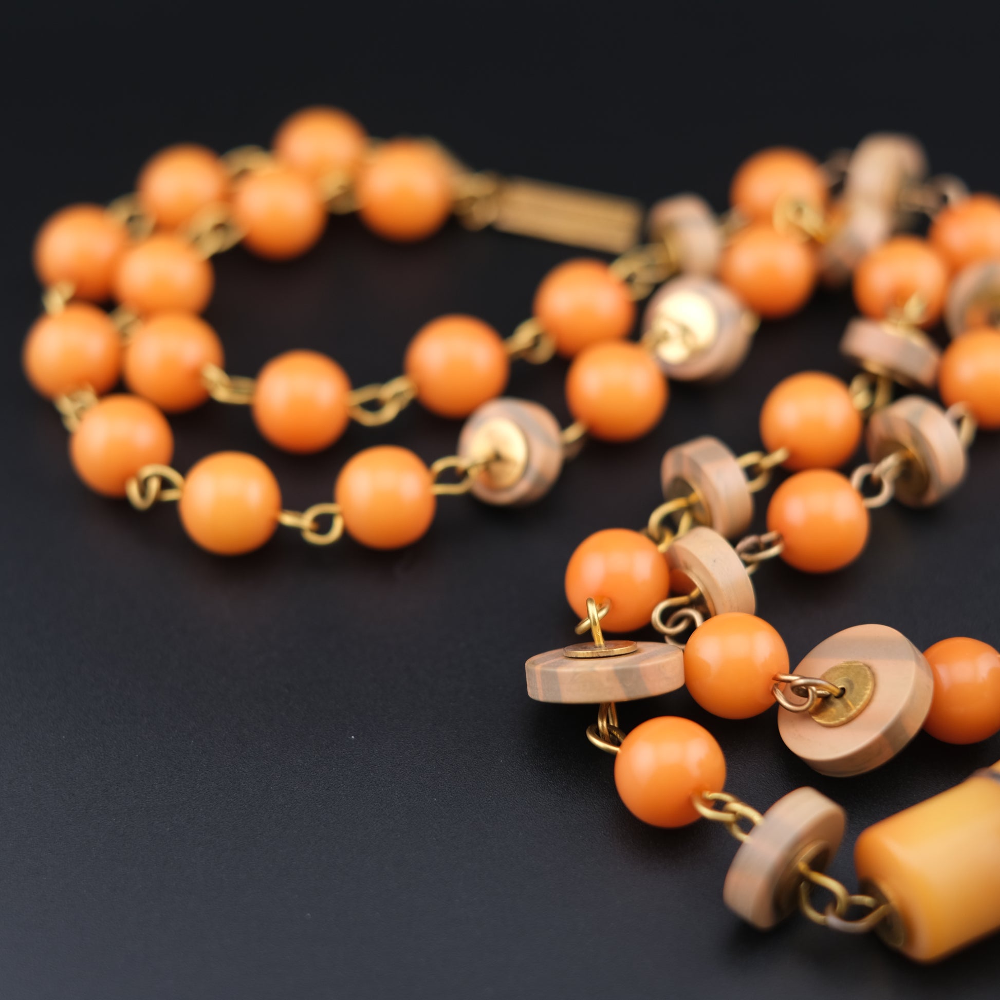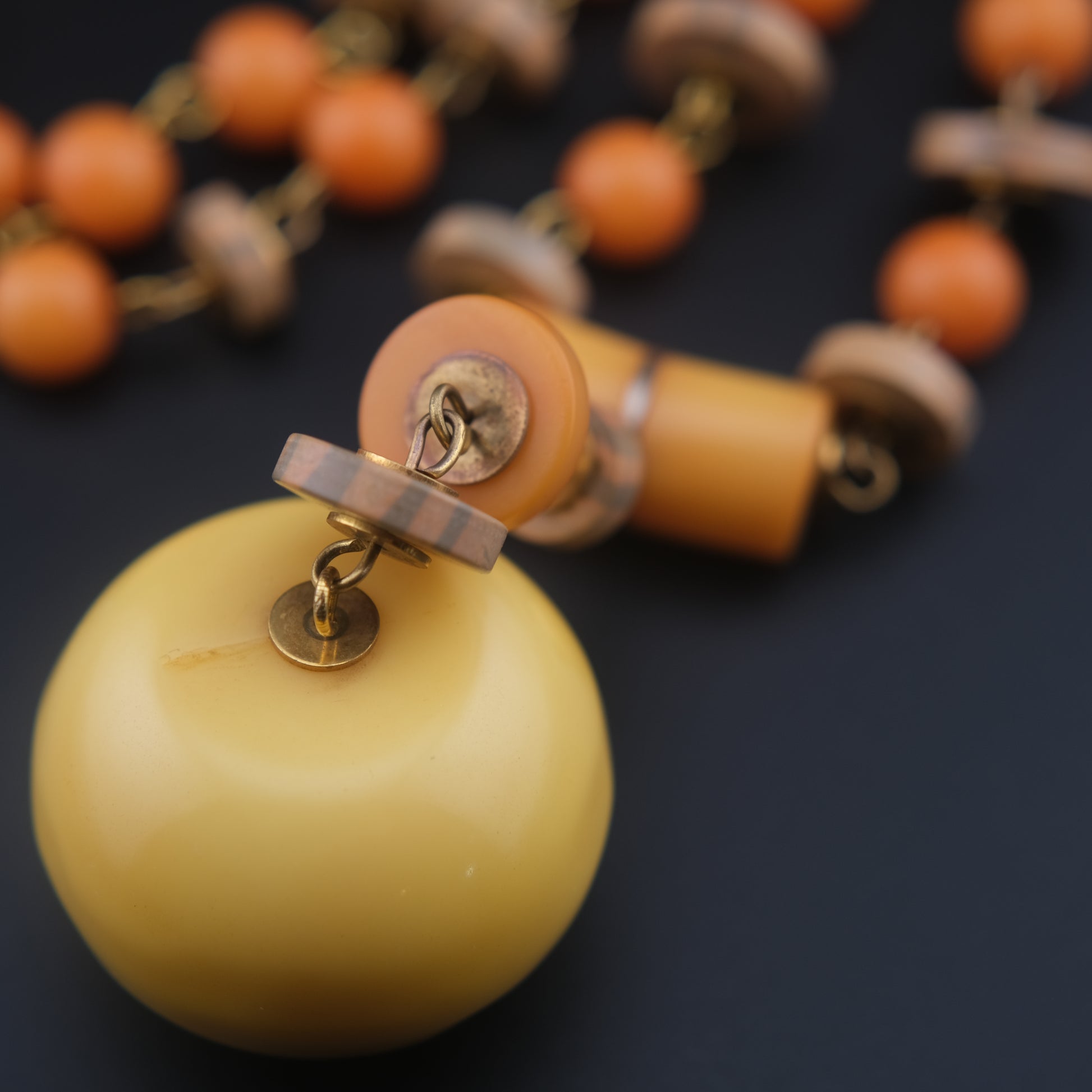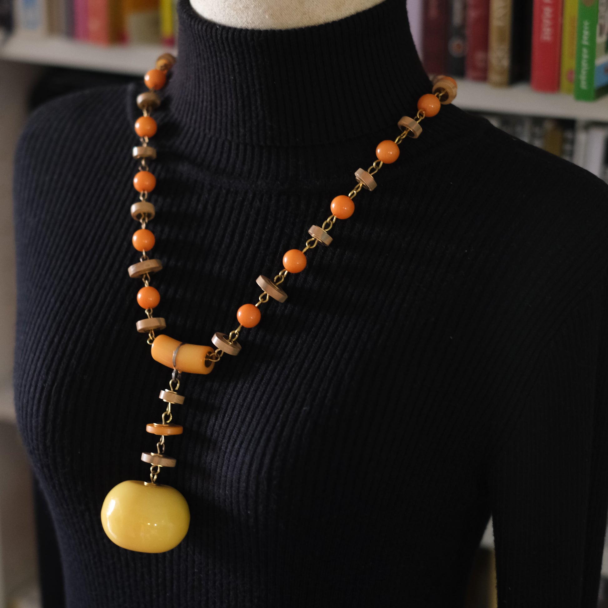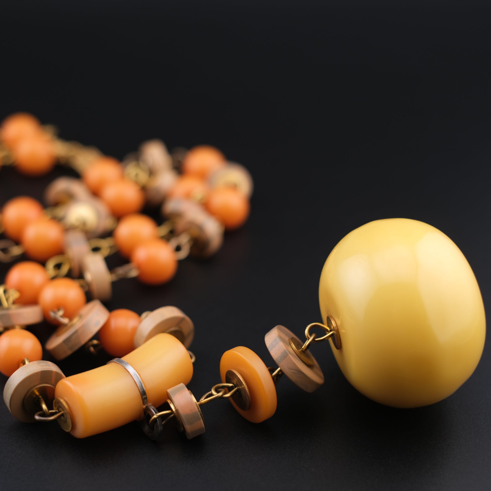 - Design: Graduated round orange beads, wood-tone spacers, oversized yellow pendant drop