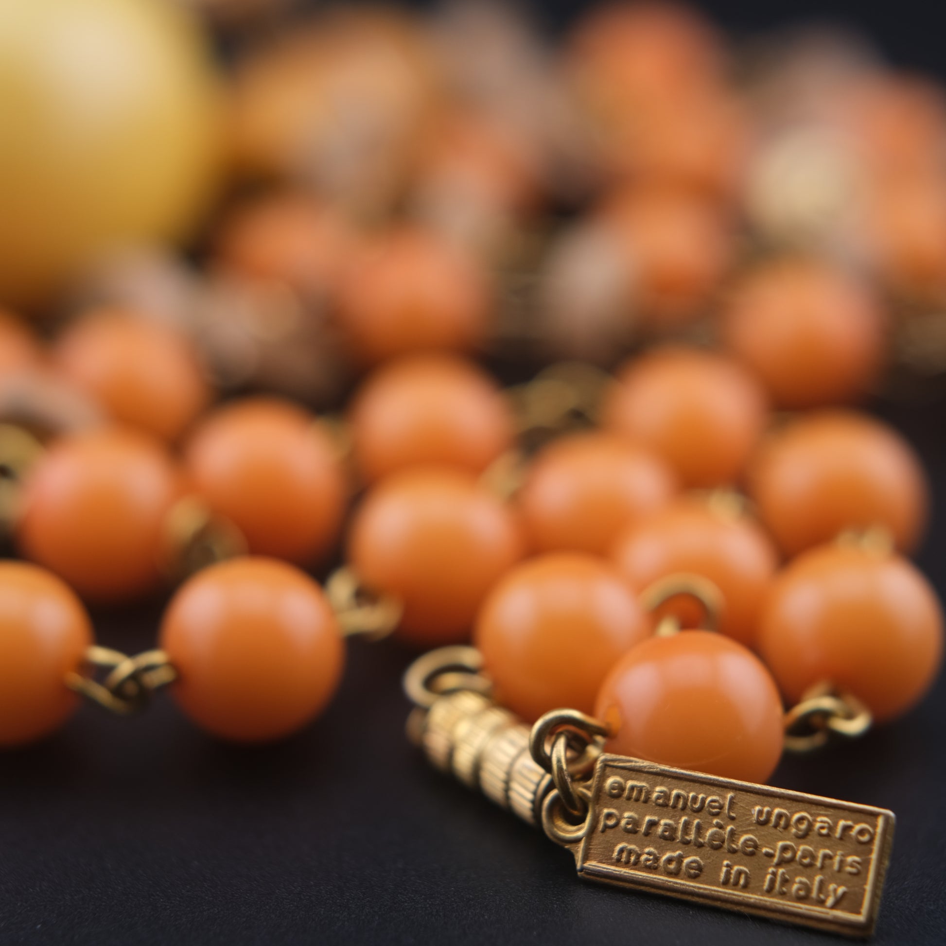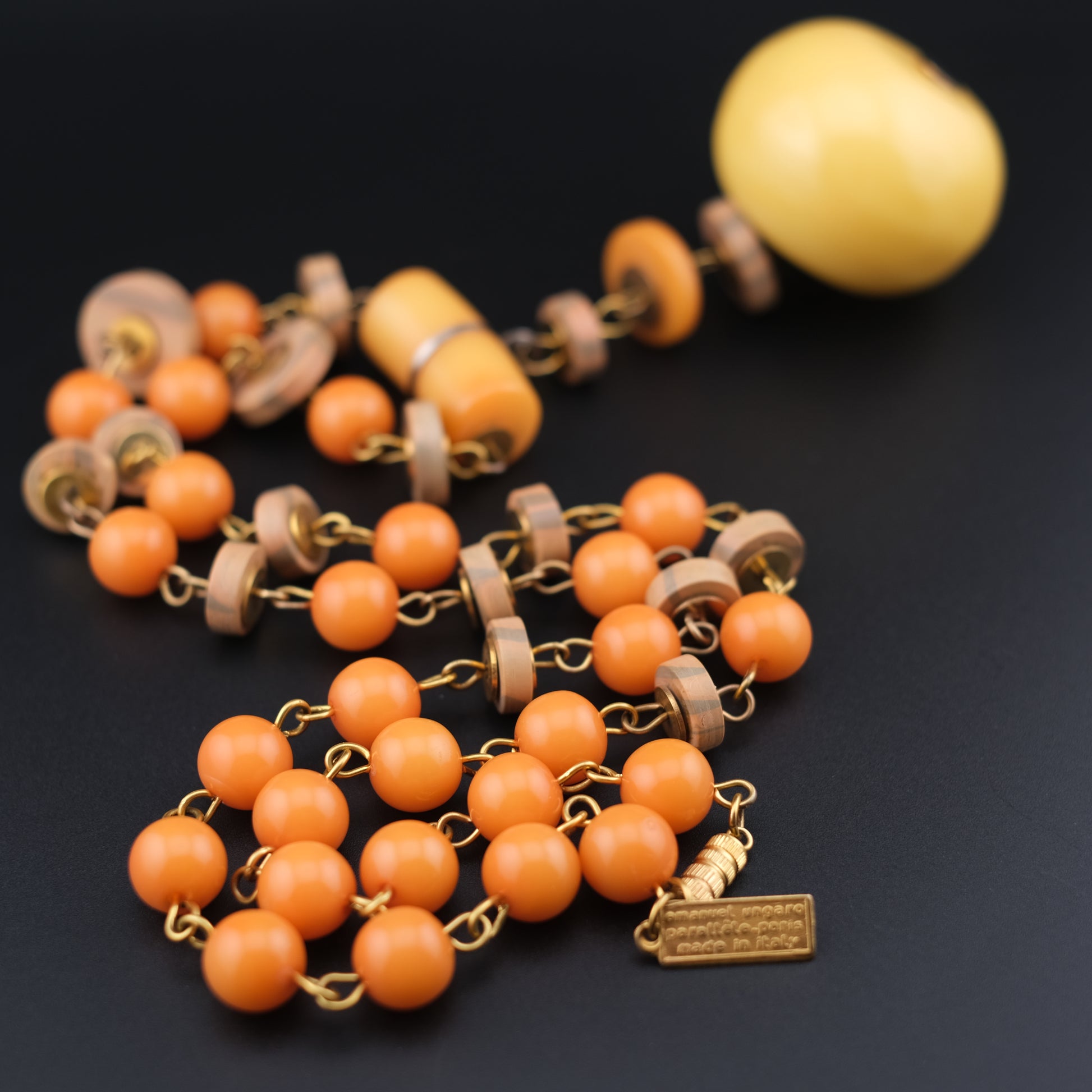 Add a punch of artistic retro style with this rare vintage necklace from Emanuel Ungaro's Parallel Paris line. Designed and made in Italy, the piece features a dynamic mix of warm orange resin beads, wood-toned disc spacers, and a large yellow bakelite-style pendant for a bold, sculptural finish. The combination of textures and colors offers an earthy yet playful look—perfect for turning heads.