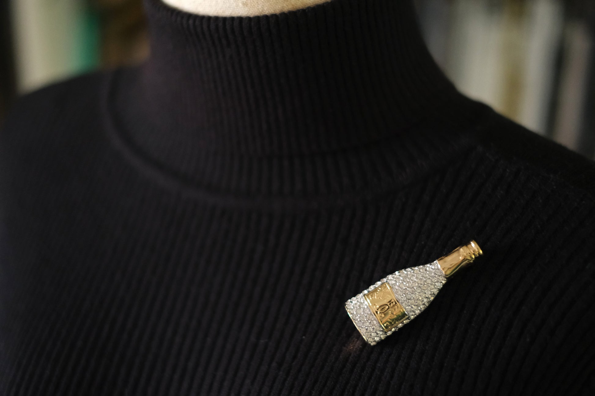 Raise a toast to timeless glamour with this sparkling Carolee Champagne Bottle Brooch. This limited edition piece, released in 2000, is beautifully crafted in the shape of a champagne bottle and encrusted with shimmering clear crystals. The gold-tone detailing and engraved “Celebrate” label make it a festive and eye-catching statement accessory.