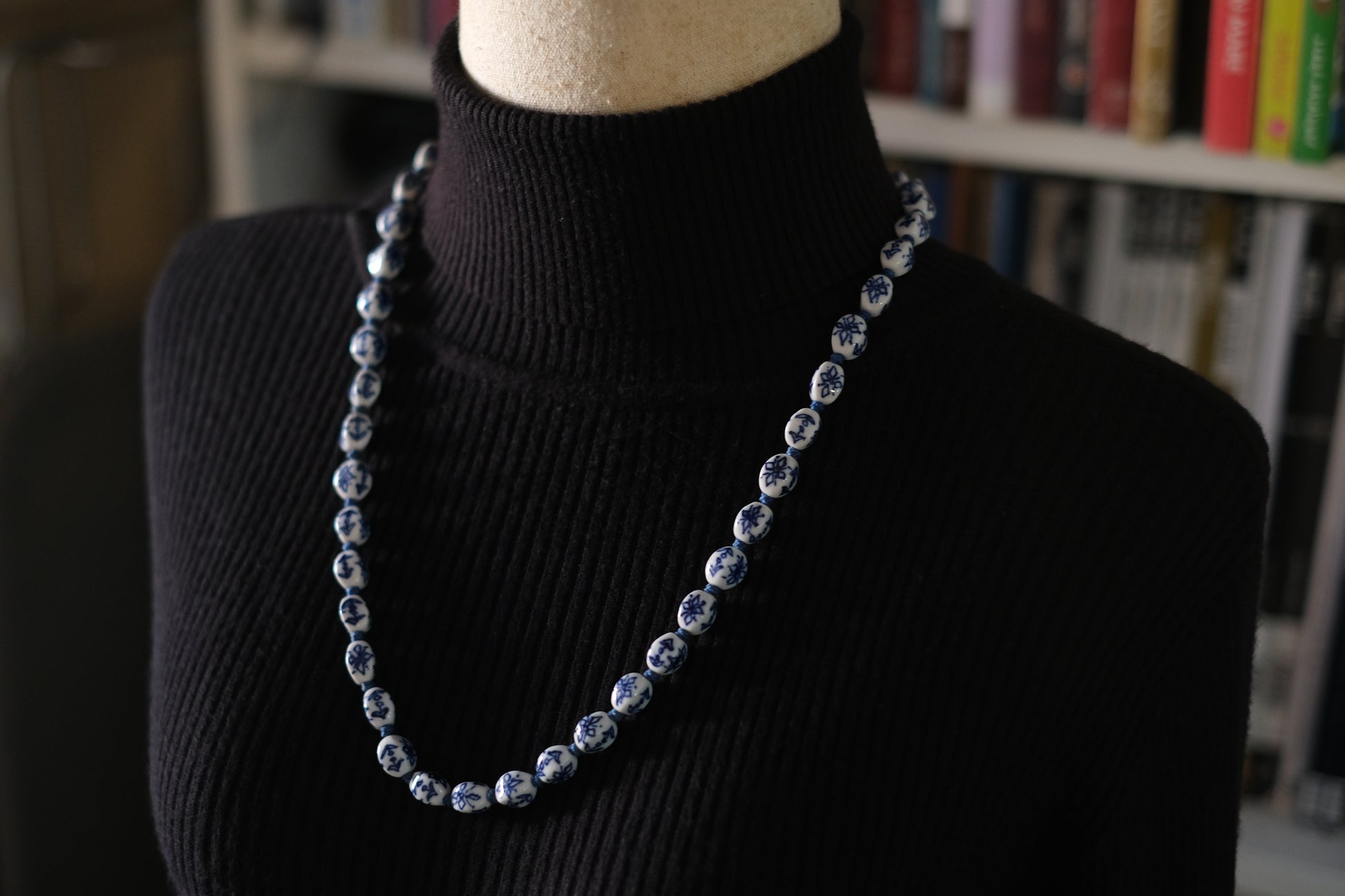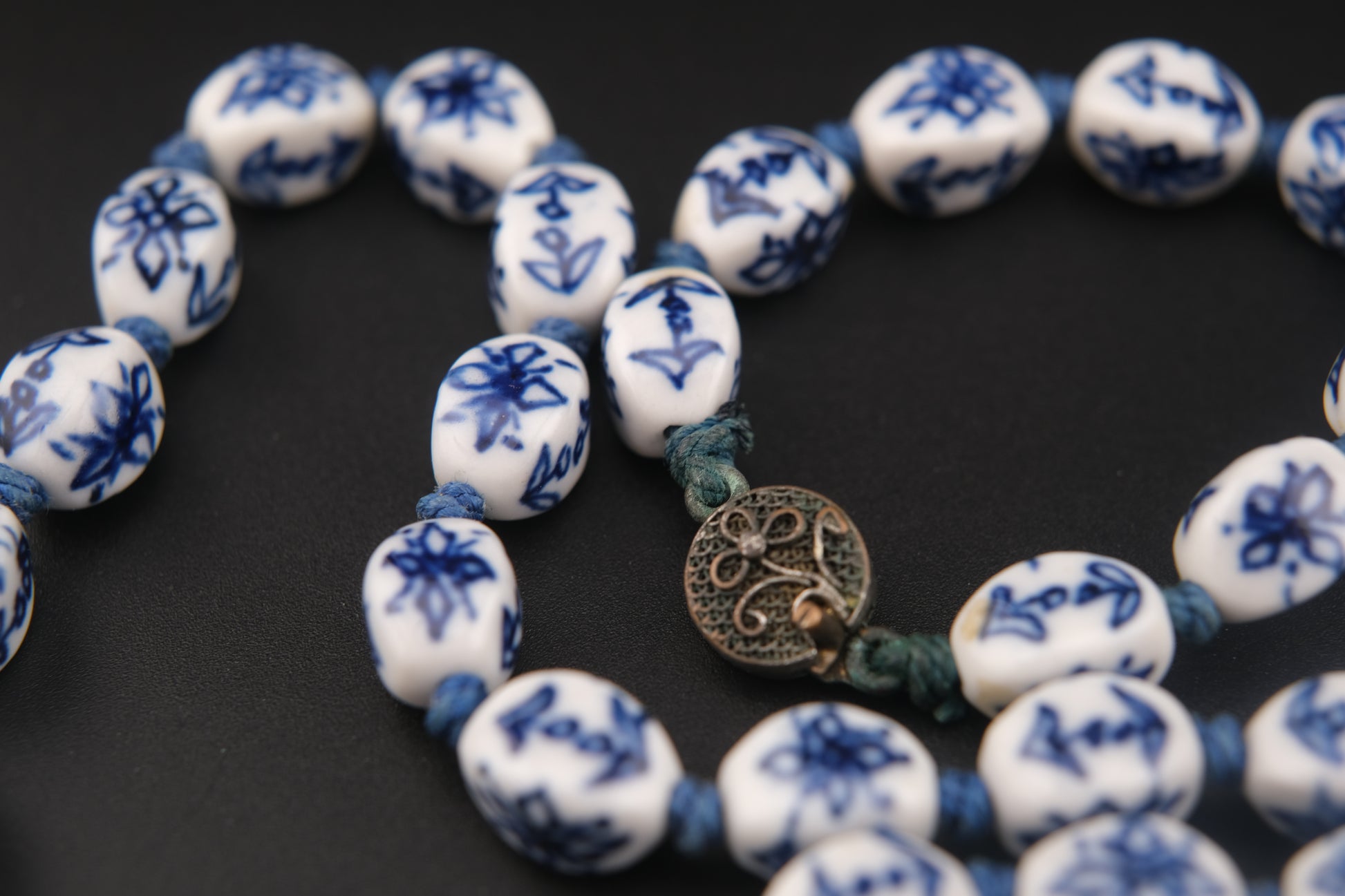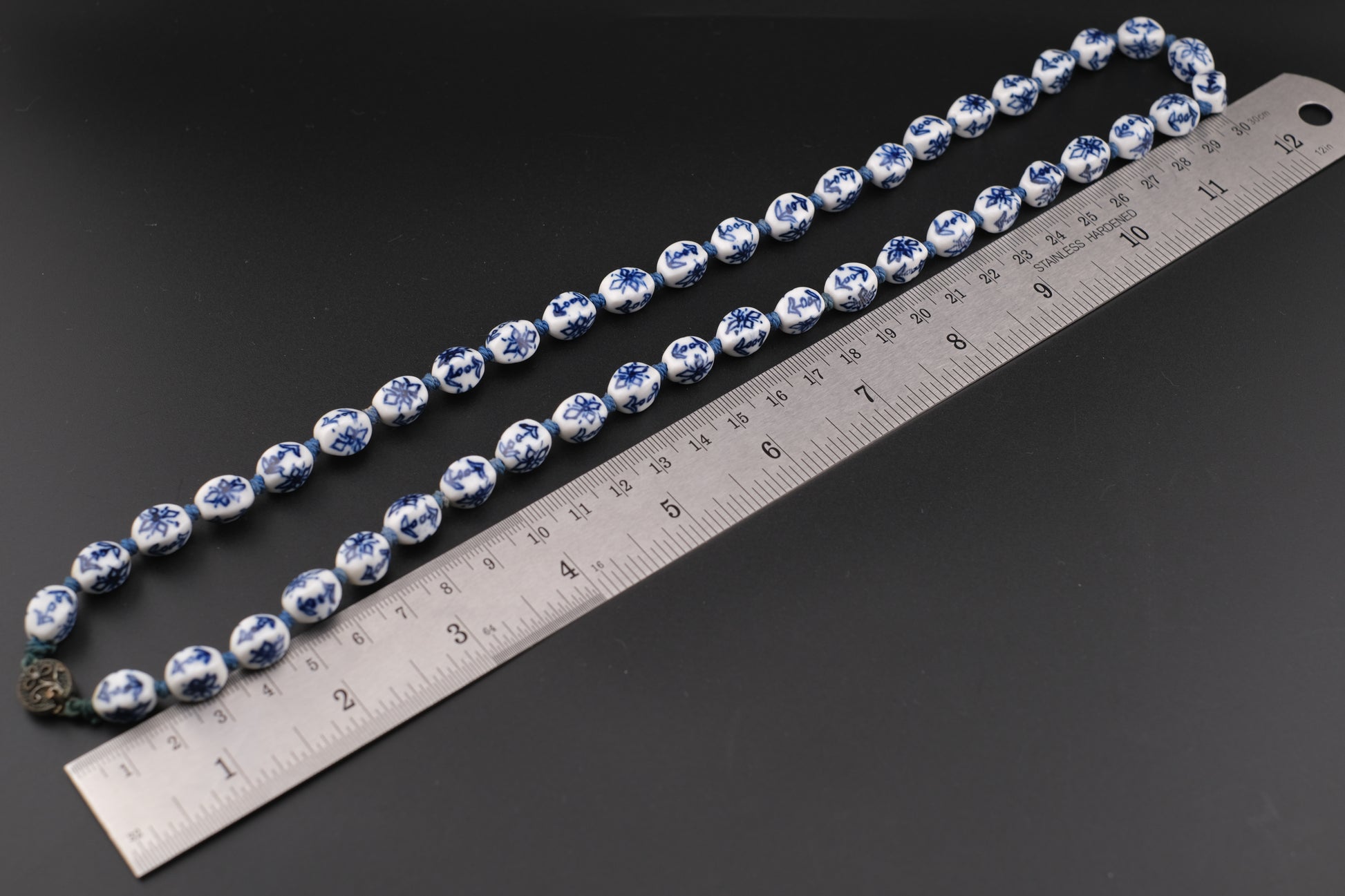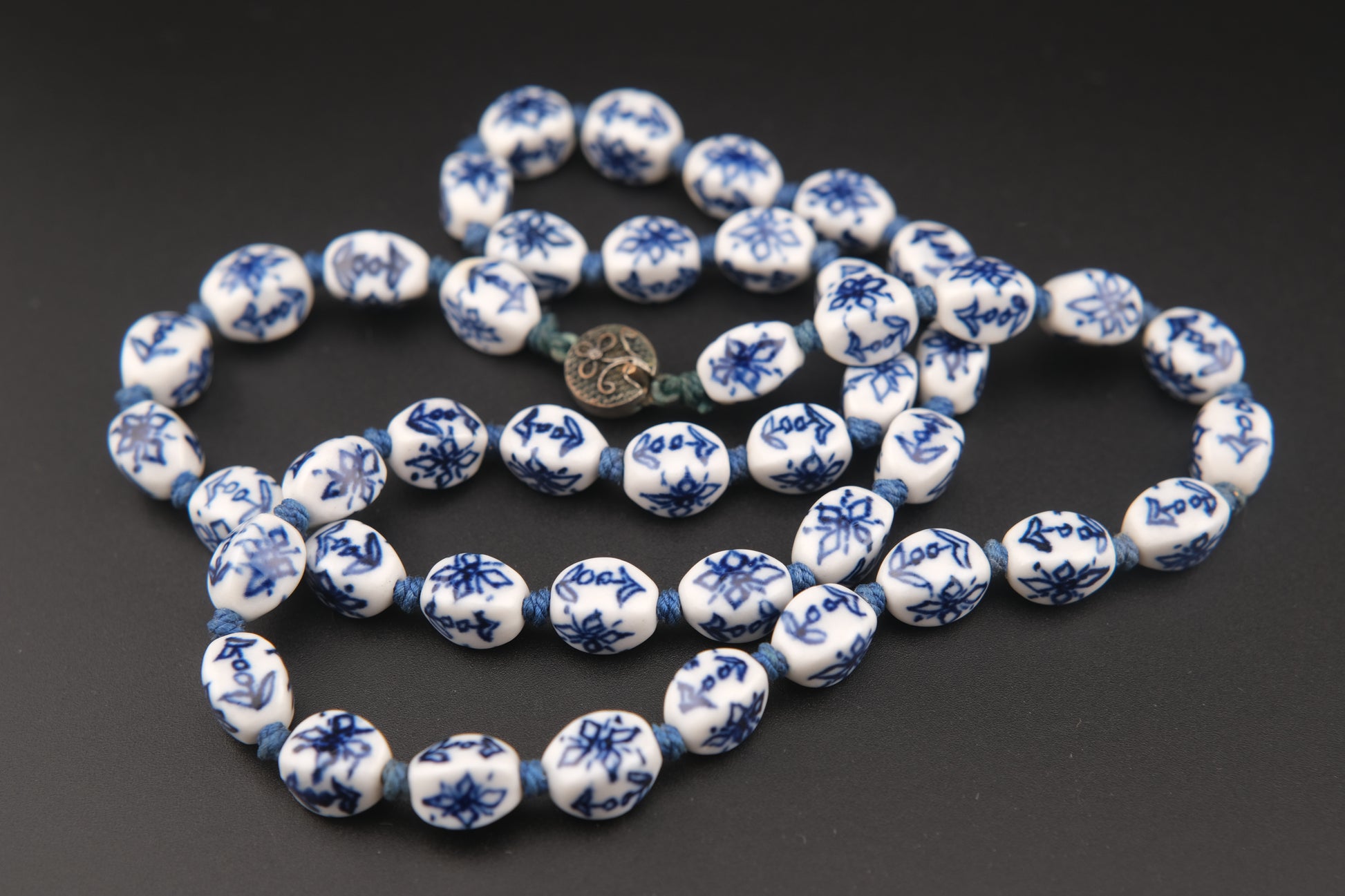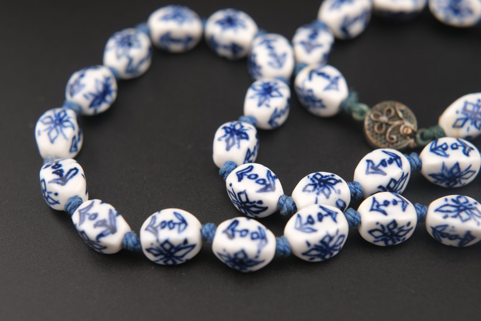 Chinese Blue & White Porcelain Bead Necklace – 24" Long