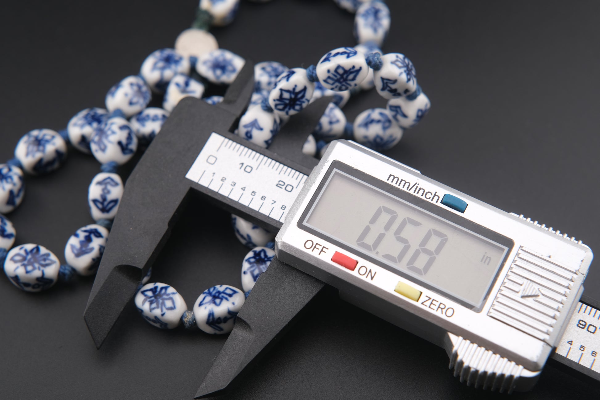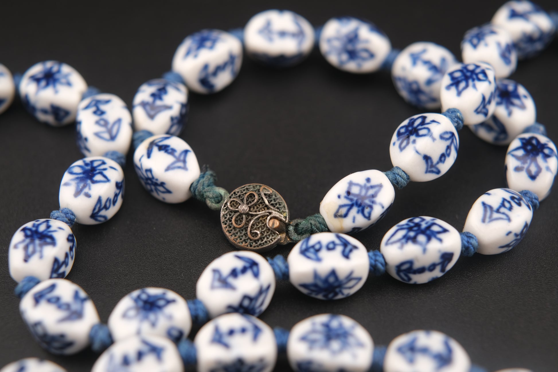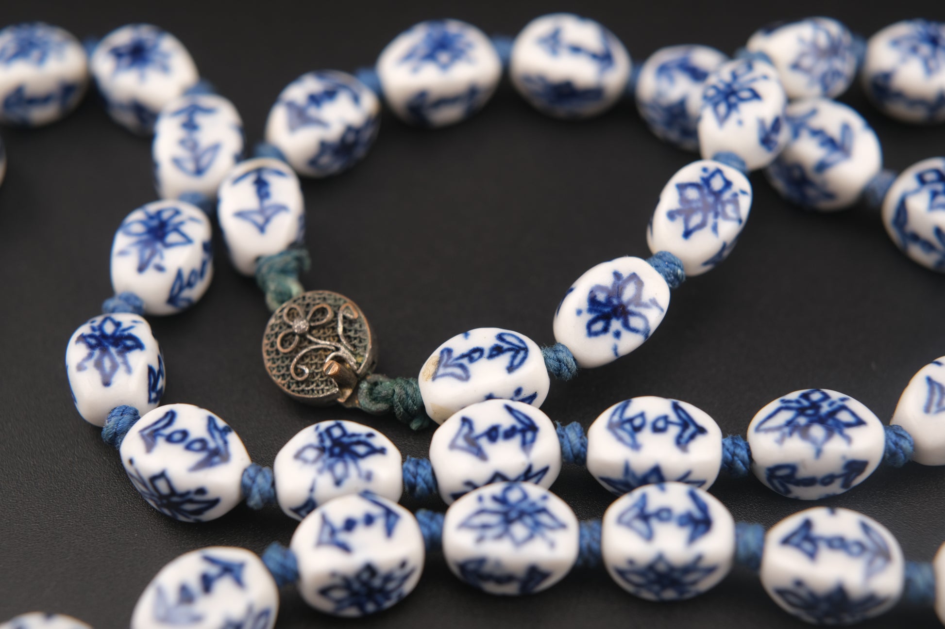 - Design: Hand-painted blue floral and geometric motifs on white porcelain beads