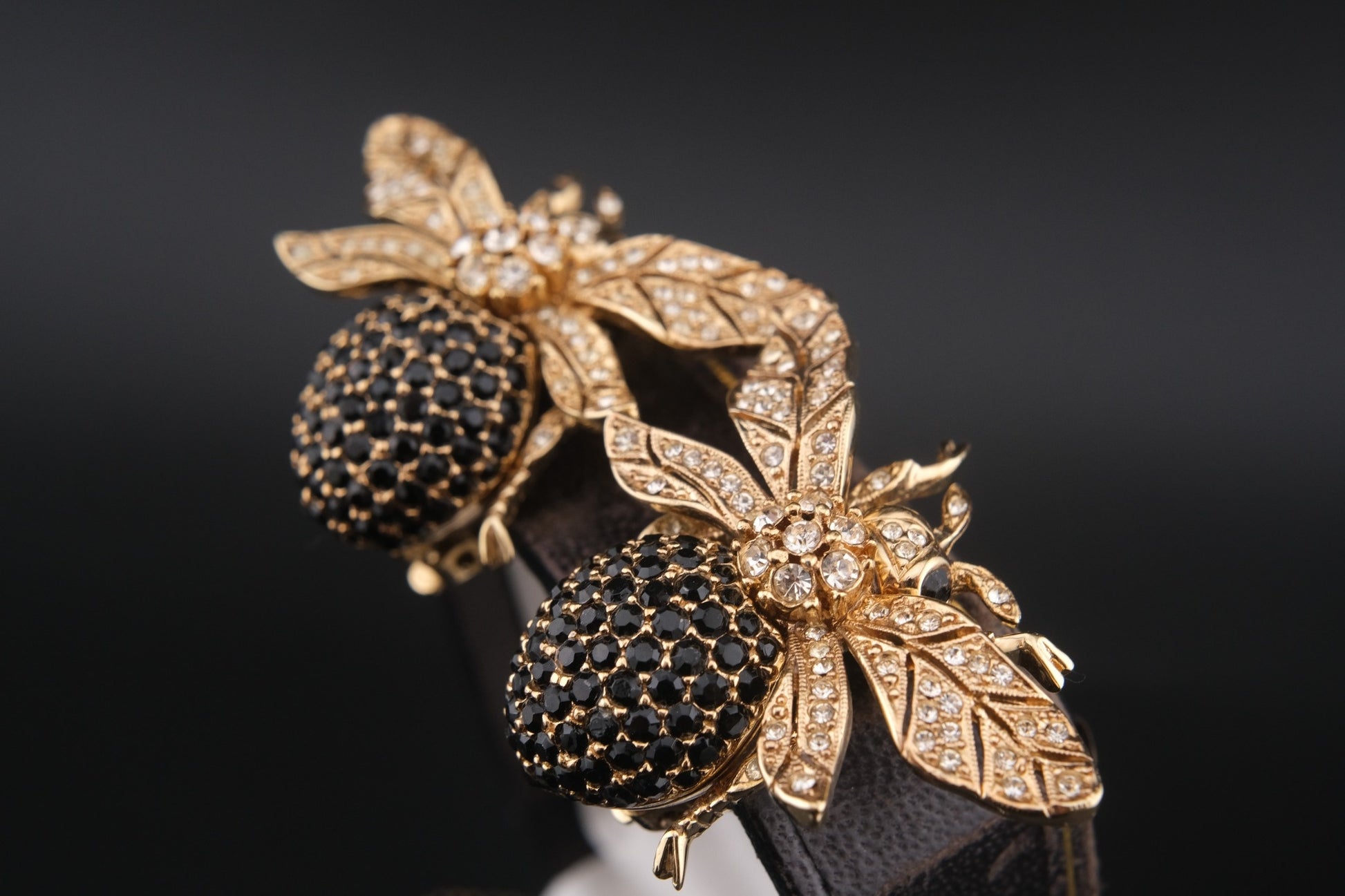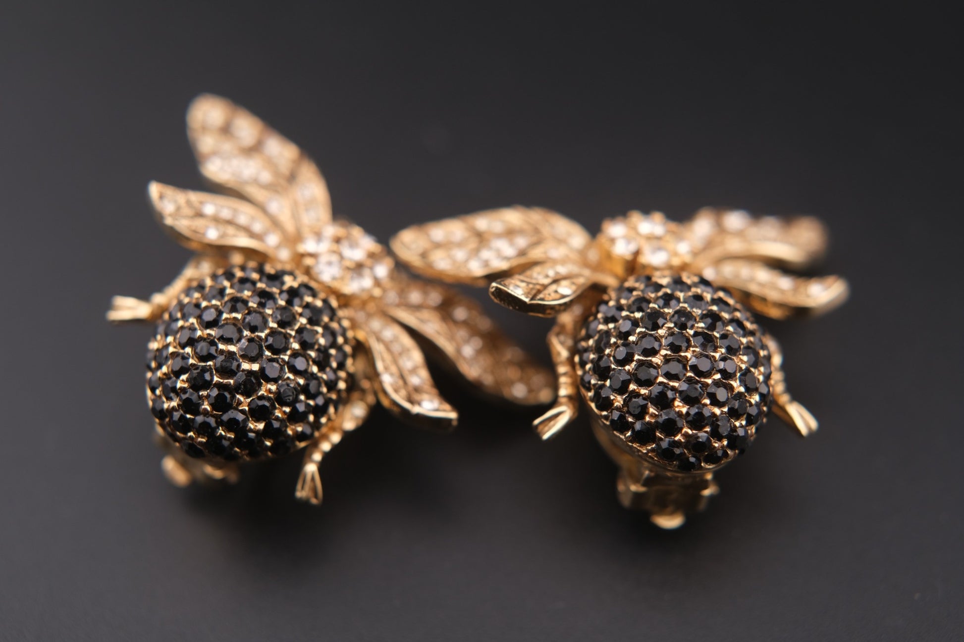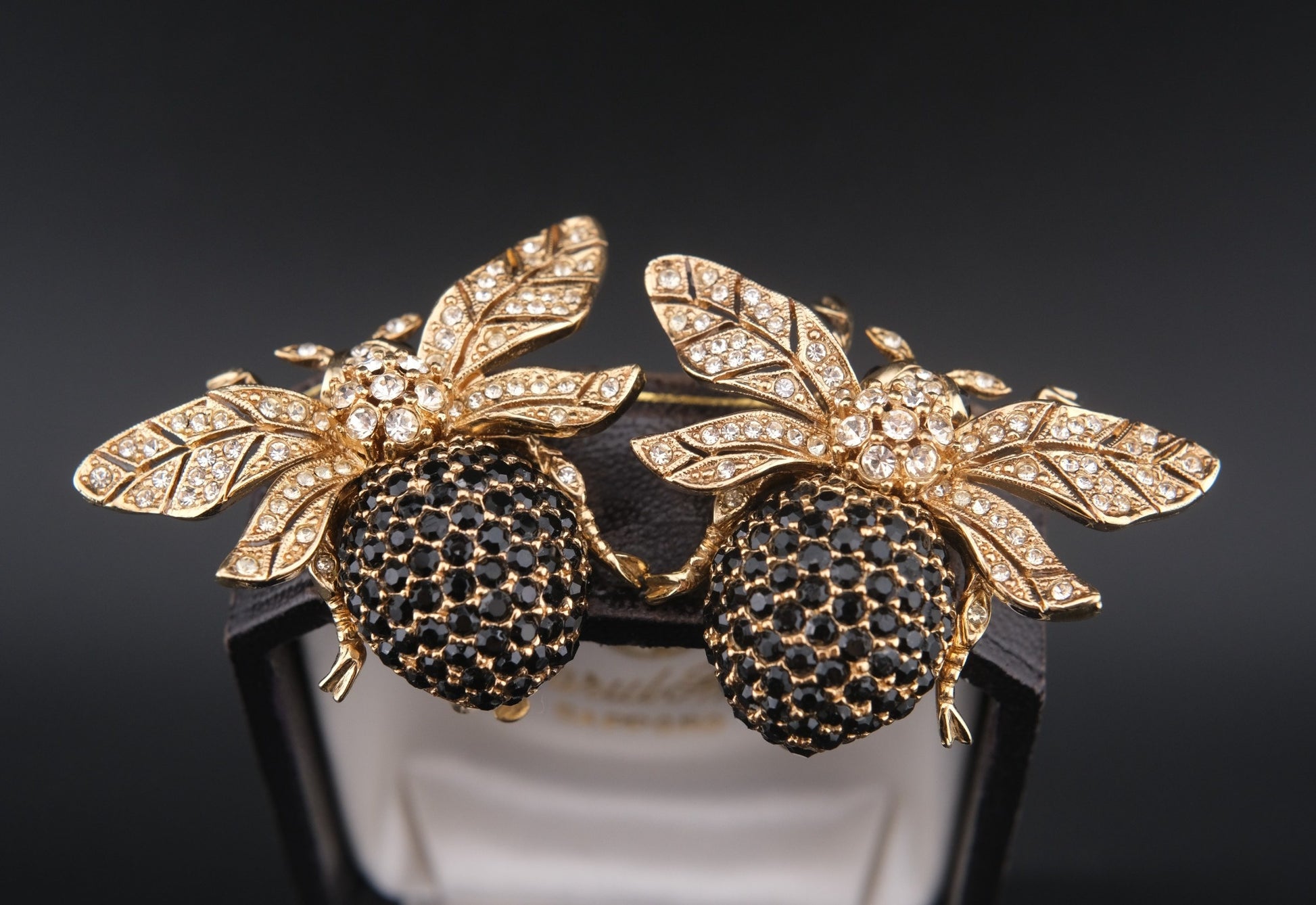 Featuring intricately detailed bees, these earrings combine luxurious gold-plated metal with dazzling pavé-set crystals. The wings are adorned with clear rhinestones, meticulously placed to highlight the elegant veins and contours, while the bodies are encrusted with jet-black rhinestones, adding contrast and depth to the design.