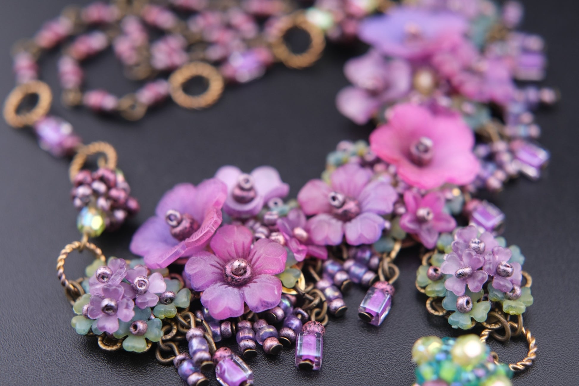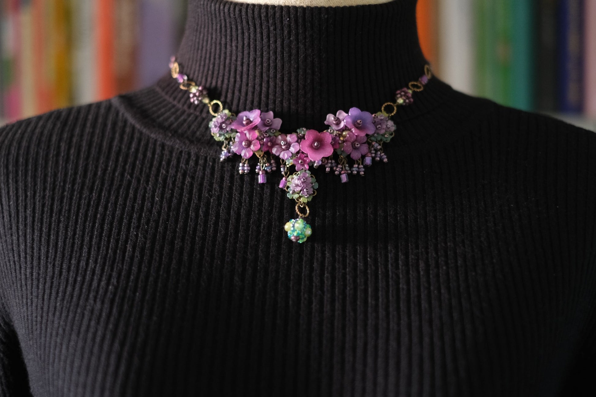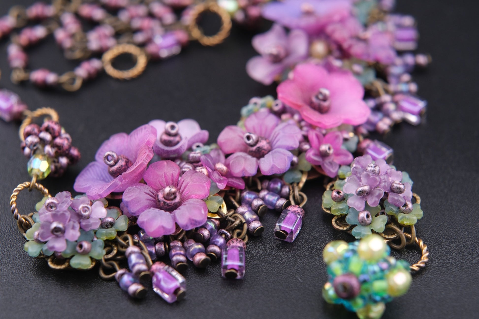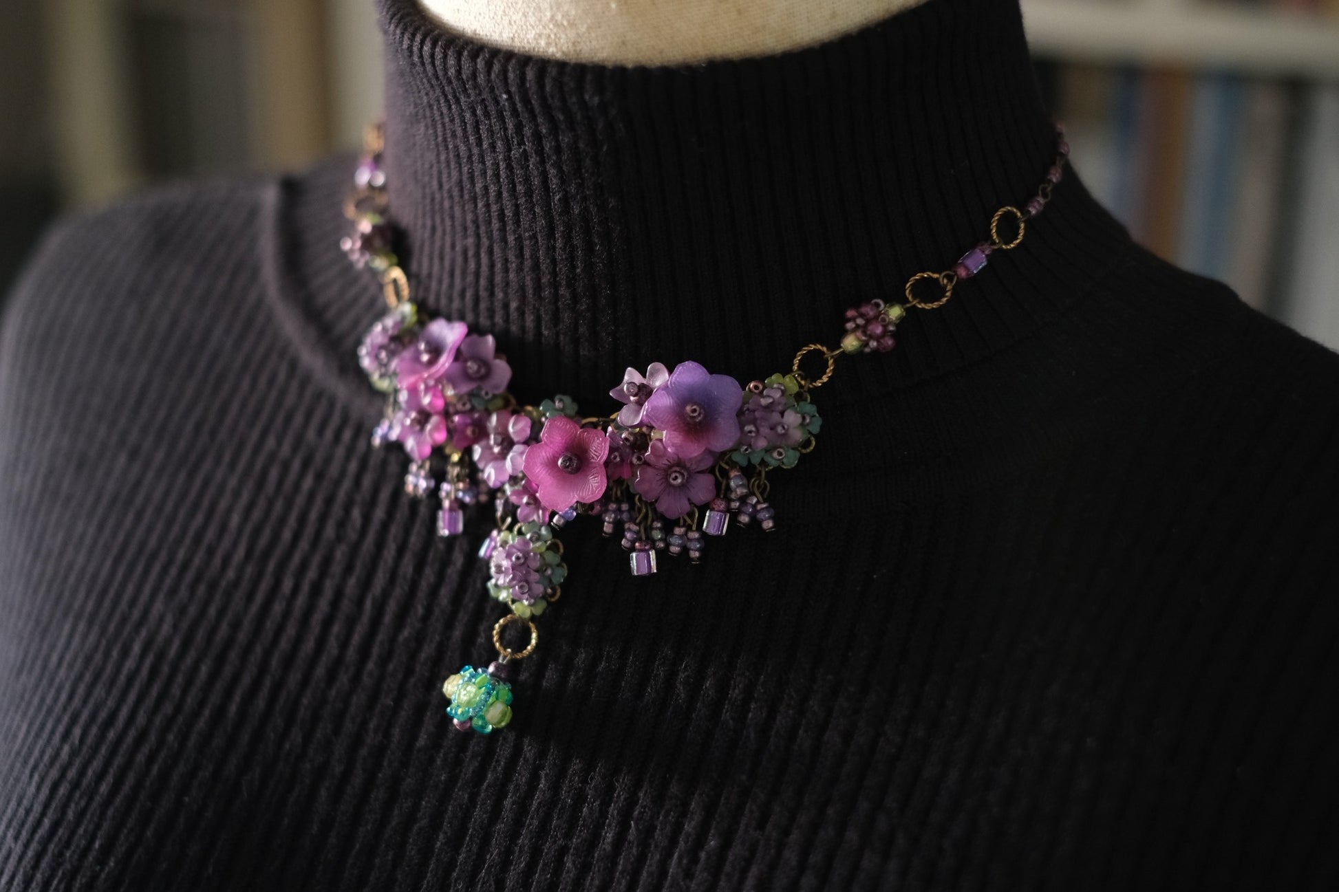 Colleen Toland Vintage Floral Necklace – Purple Pink Garden Statement