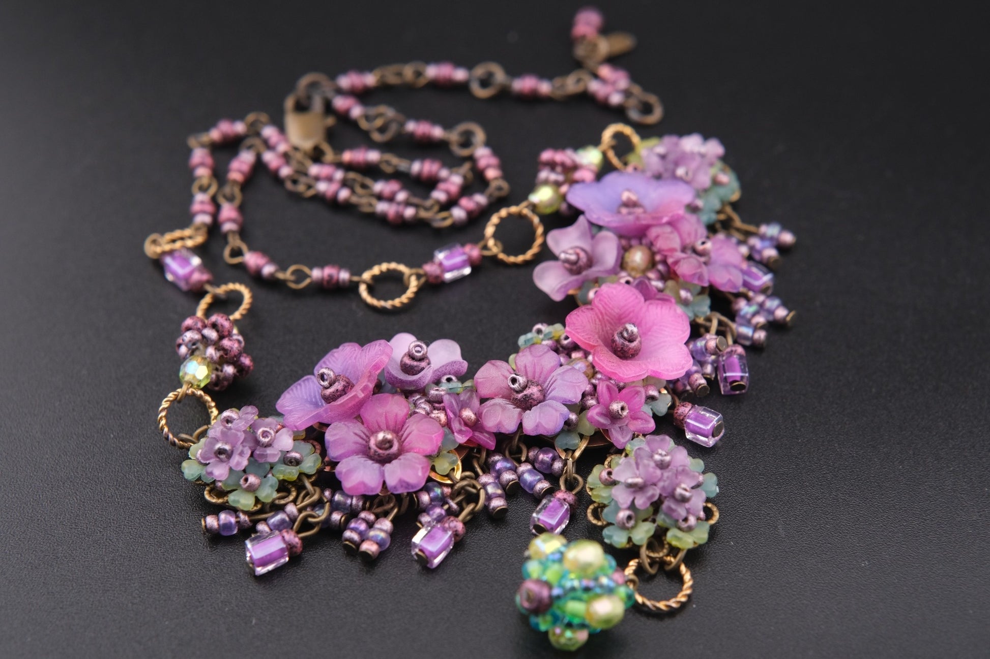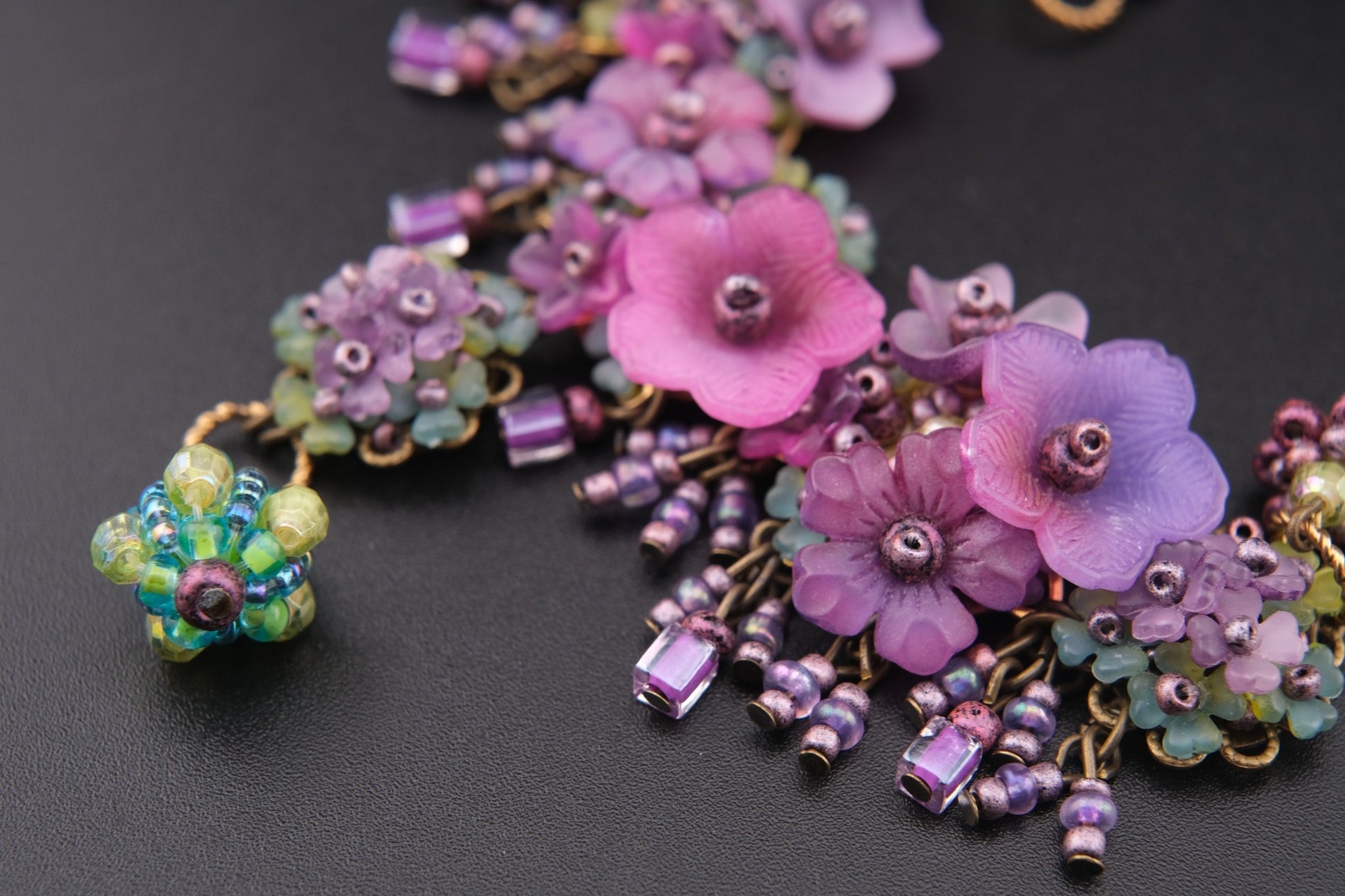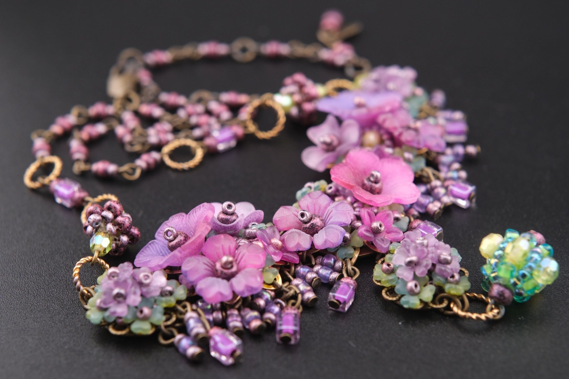 Colleen TolandFeaturing clusters of hand-crafted flowers in shades of pink, lavender, and purple with accents of green and iridescent beads, this necklace captures the essence of romantic garden beauty. Dangling beaded tassels and a vibrant orb charm add playful movement, while the intricate metalwork and signature tag highlight Colleen Toland’s renowned craftsmanship. Perfect for collectors, vintage enthusiasts, or anyone seeking a bold artistic accessory.