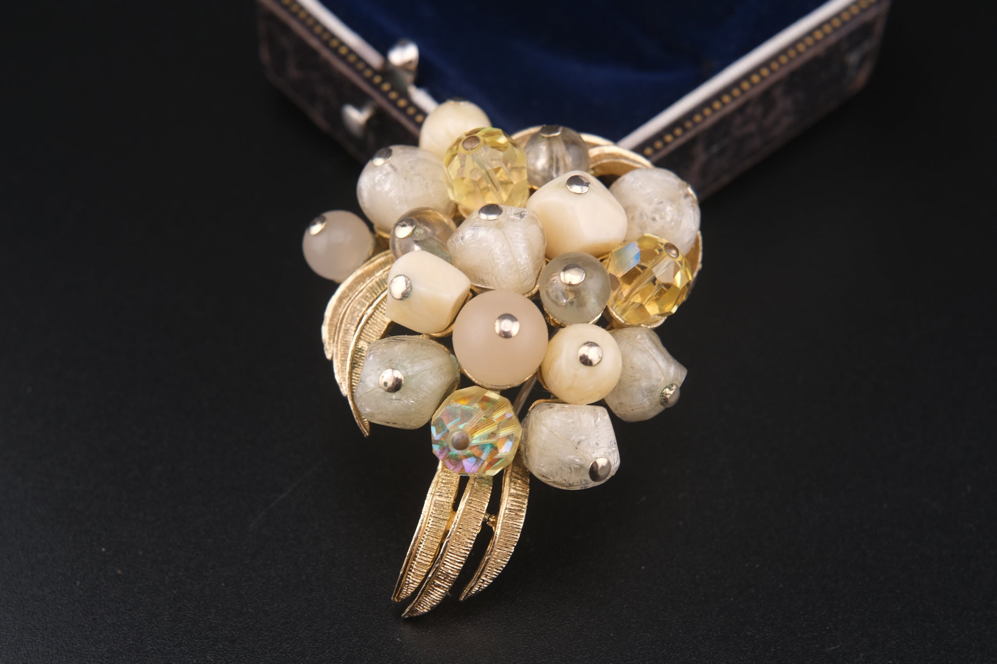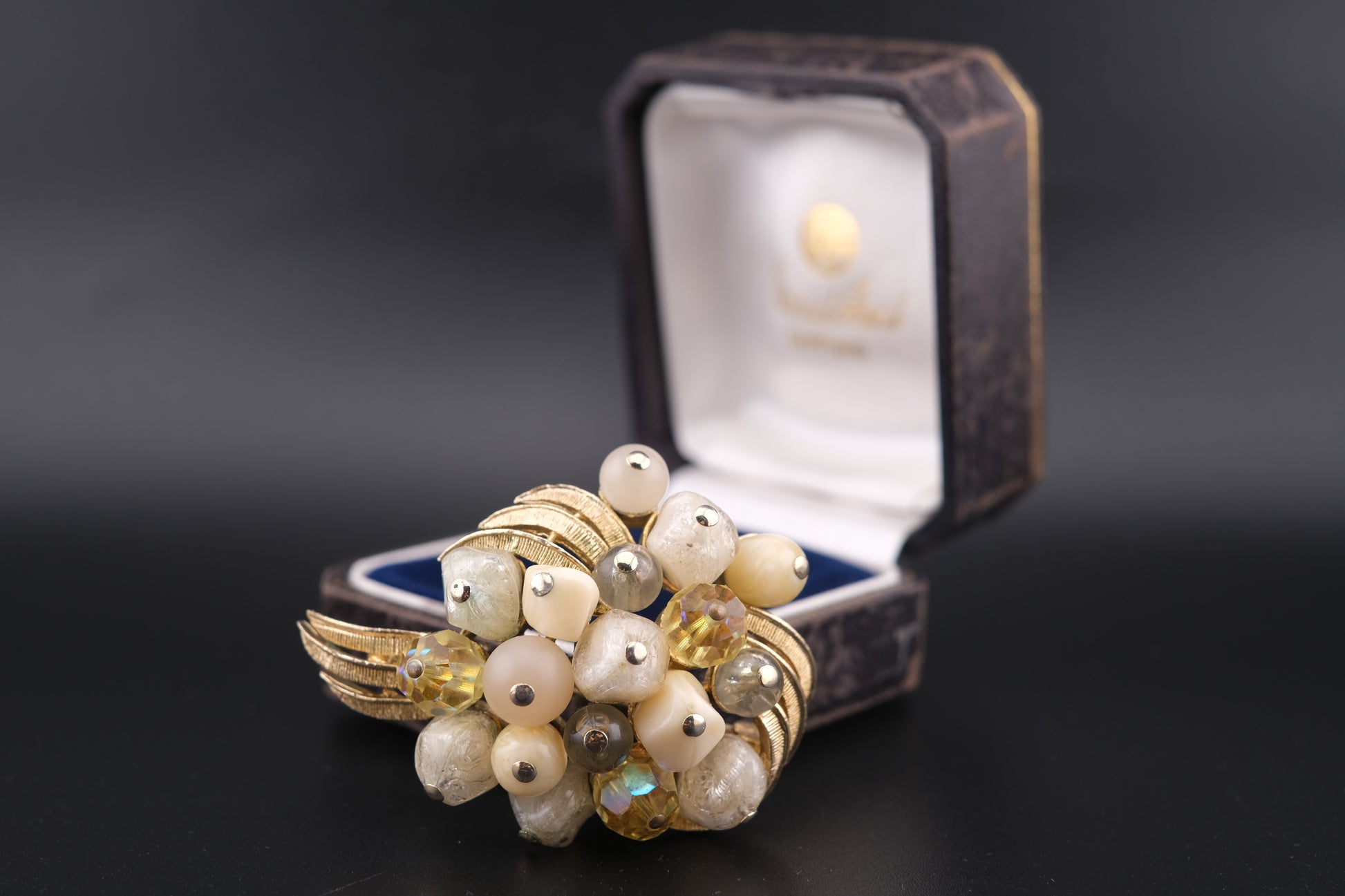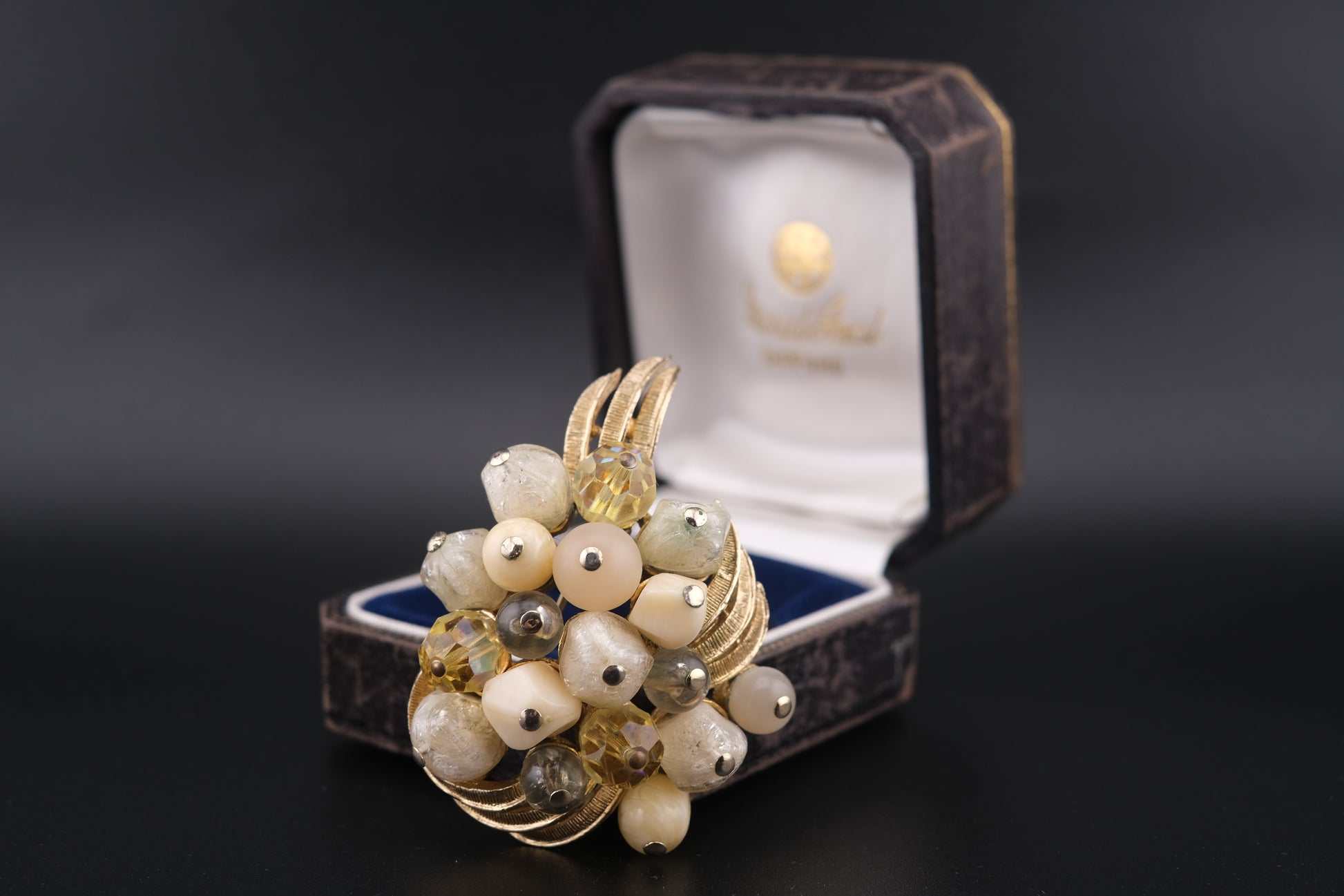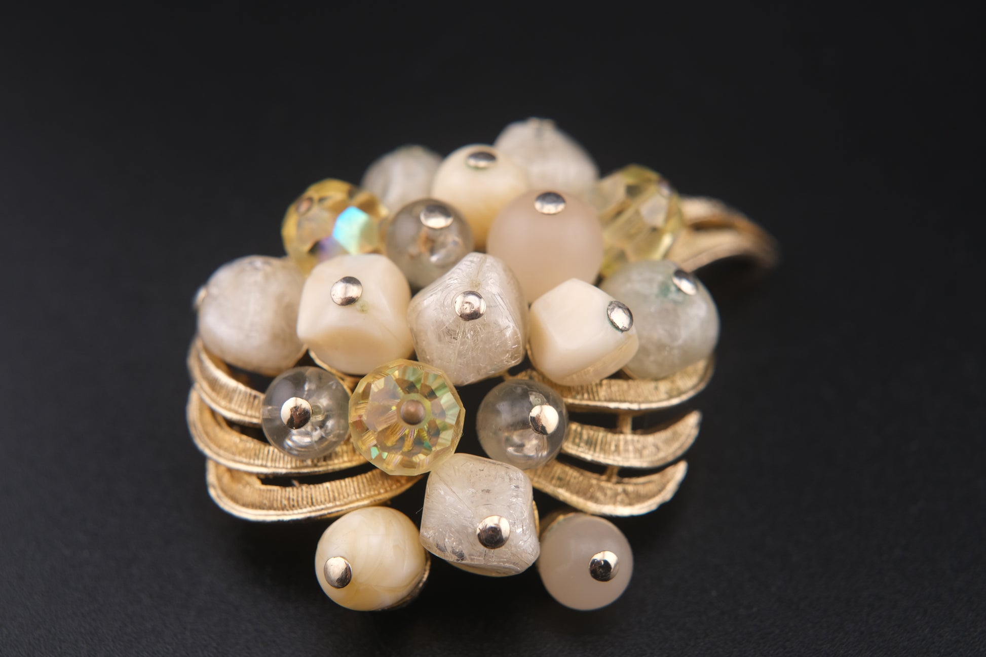 Coro Beaded Cluster Brooch – Gold-Tone with Cream Lucite, Moonglow & Crystal Beads