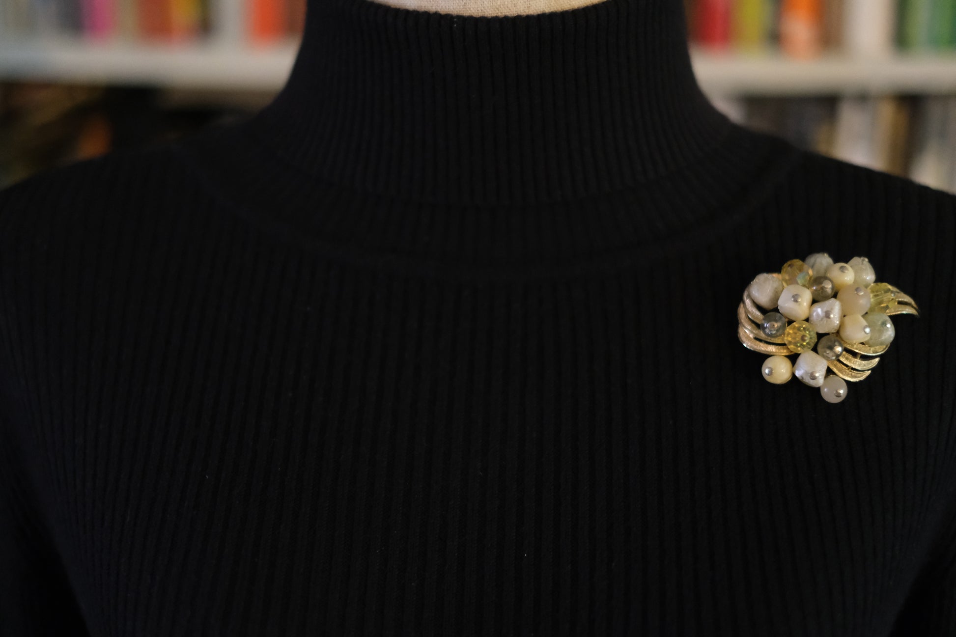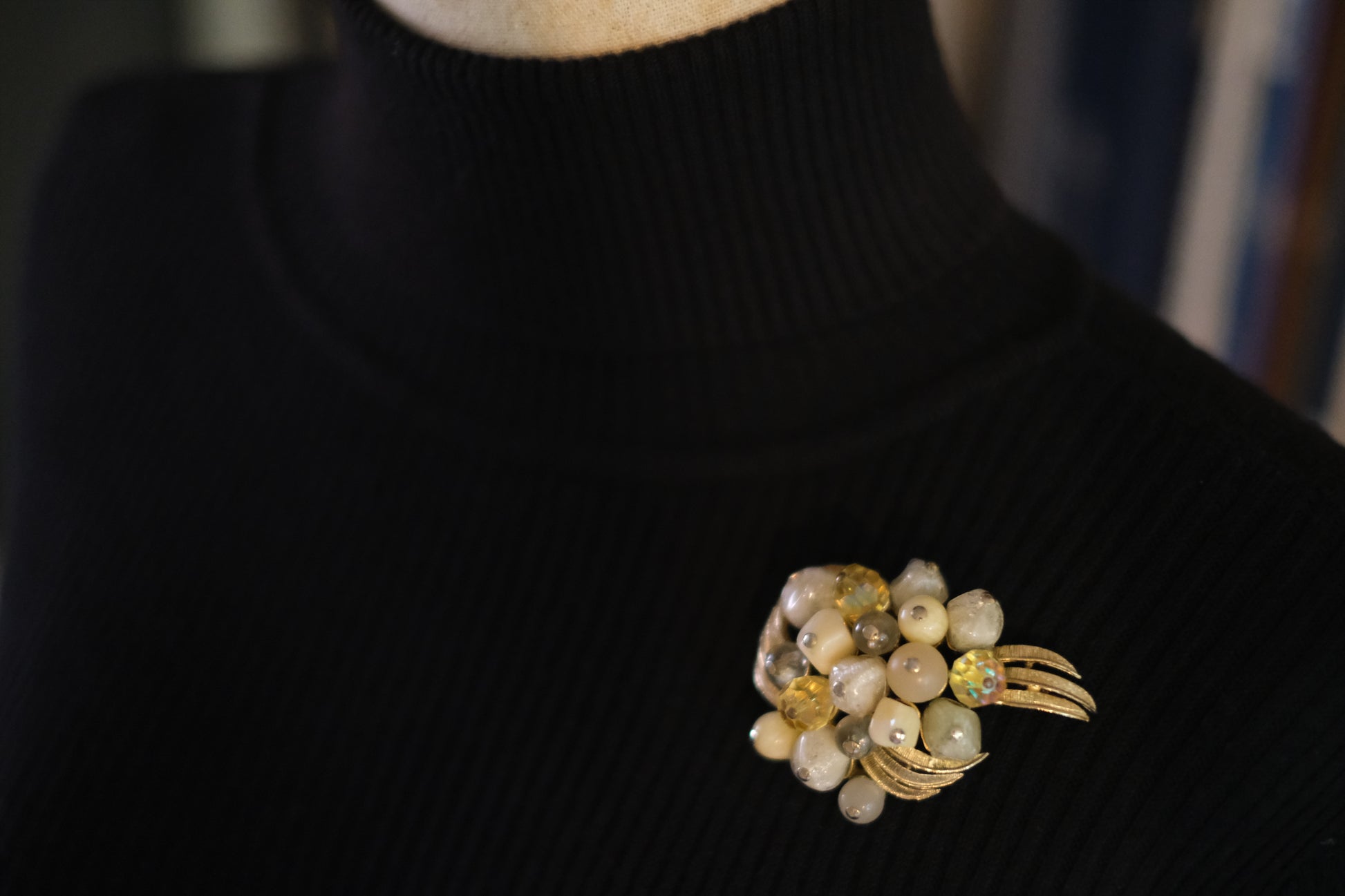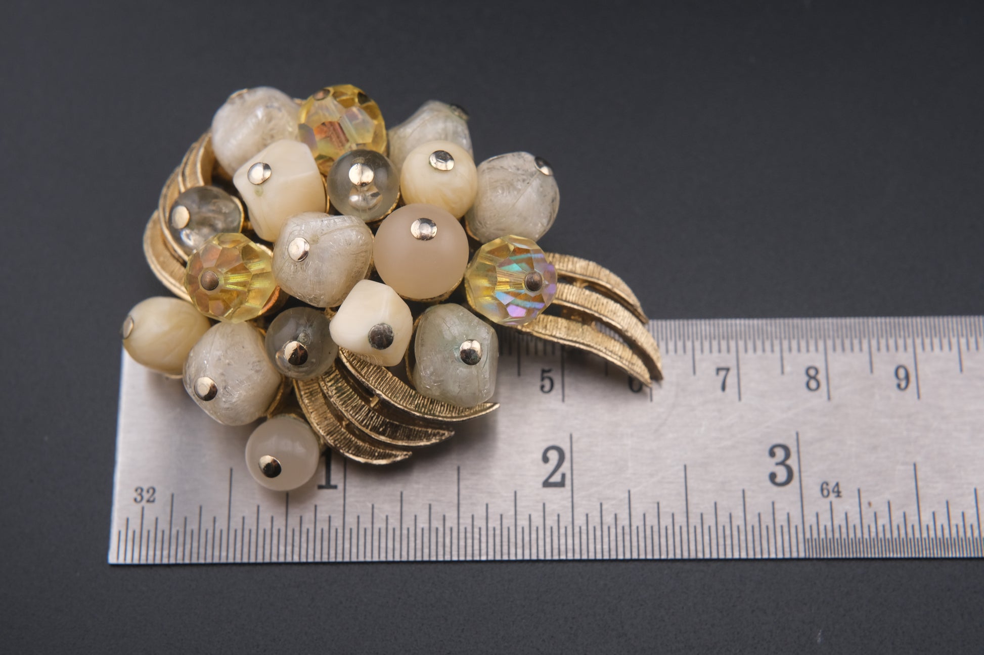 - Design: Beaded floral cluster on gold-tone scroll leaves