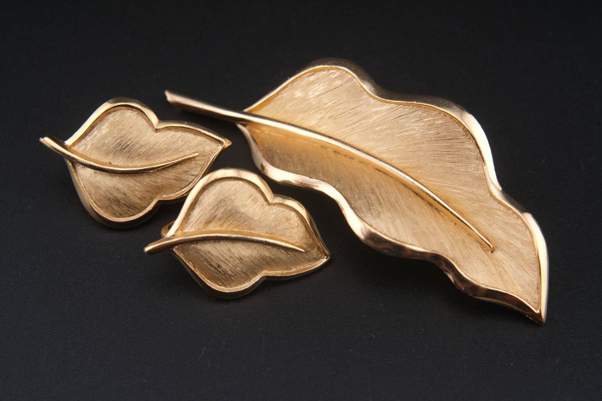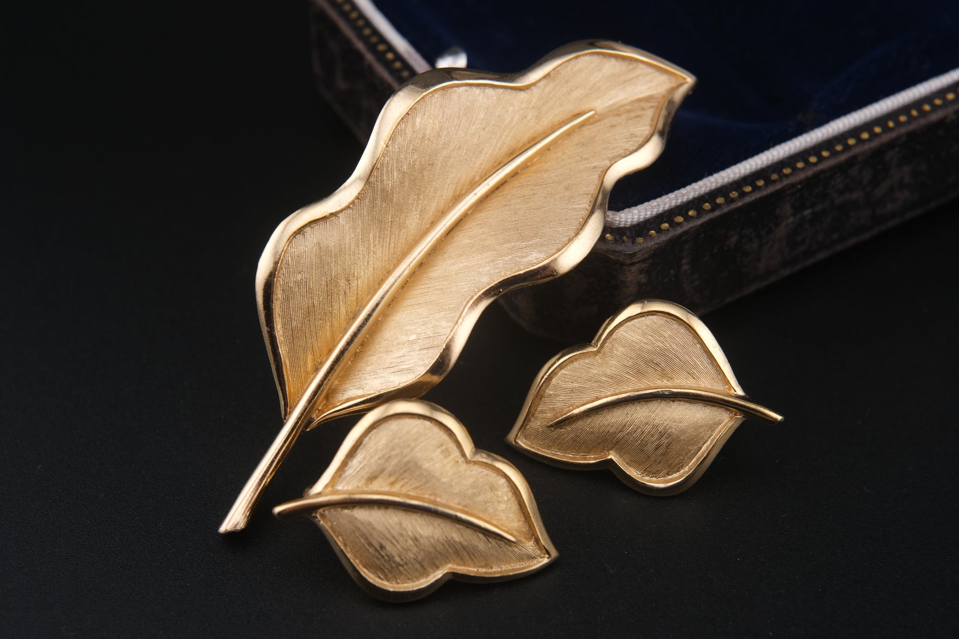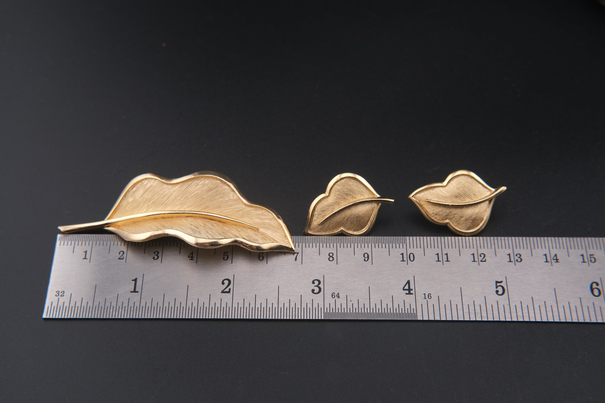 Step into timeless mid-century elegance with this vintage Crown Trifari jewelry set, featuring a stylized botanical design. The set includes a gold-tone leaf brooch and matching clip-on earrings, each meticulously crafted with a brushed satin texture and polished raised borders. The sleek curvature of the leaves and the delicate veining capture the beauty of nature in true retro glamour style.