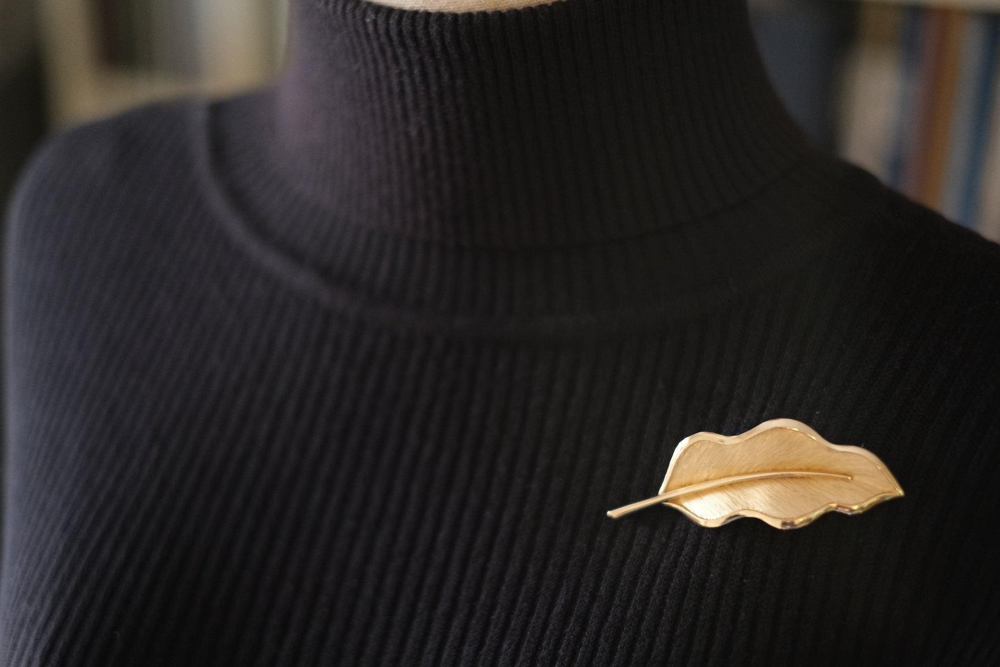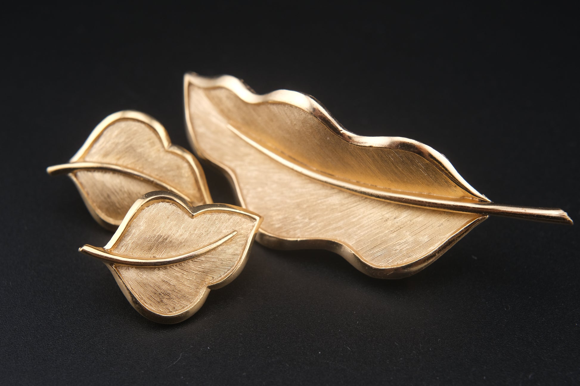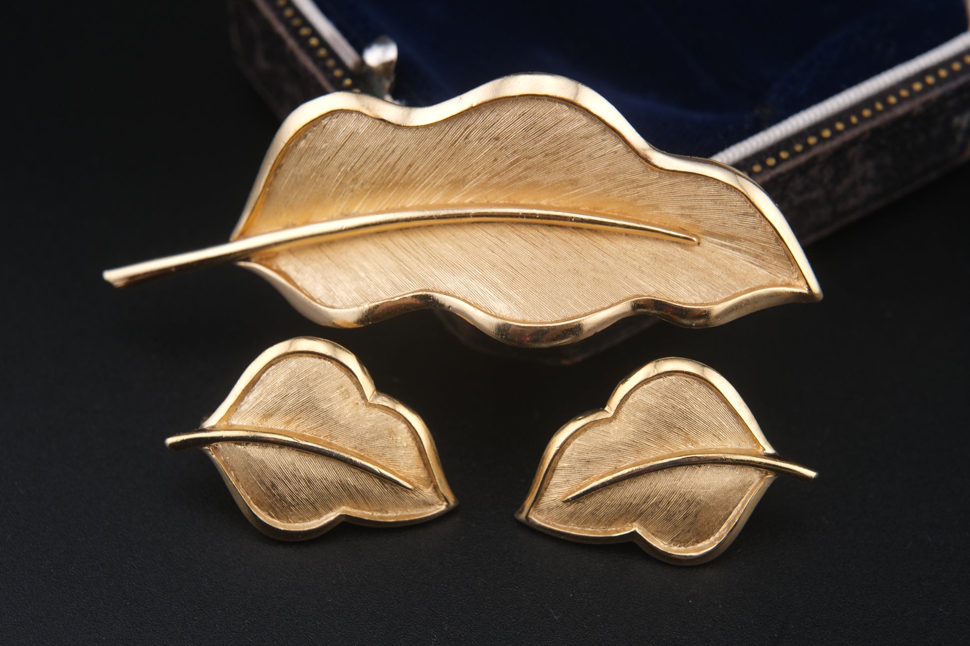 Step into timeless mid-century elegance with this vintage Crown Trifari jewelry set, featuring a stylized botanical design. The set includes a gold-tone leaf brooch and matching clip-on earrings, each meticulously crafted with a brushed satin texture and polished raised borders. The sleek curvature of the leaves and the delicate veining capture the beauty of nature in true retro glamour style.