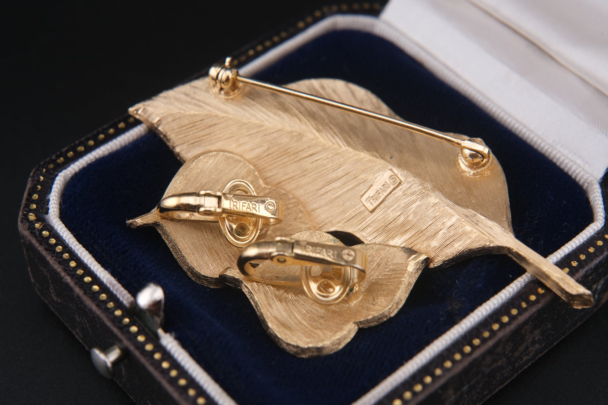 - Hallmarked: Each piece is stamped “TRIFARI ©” on the reverse