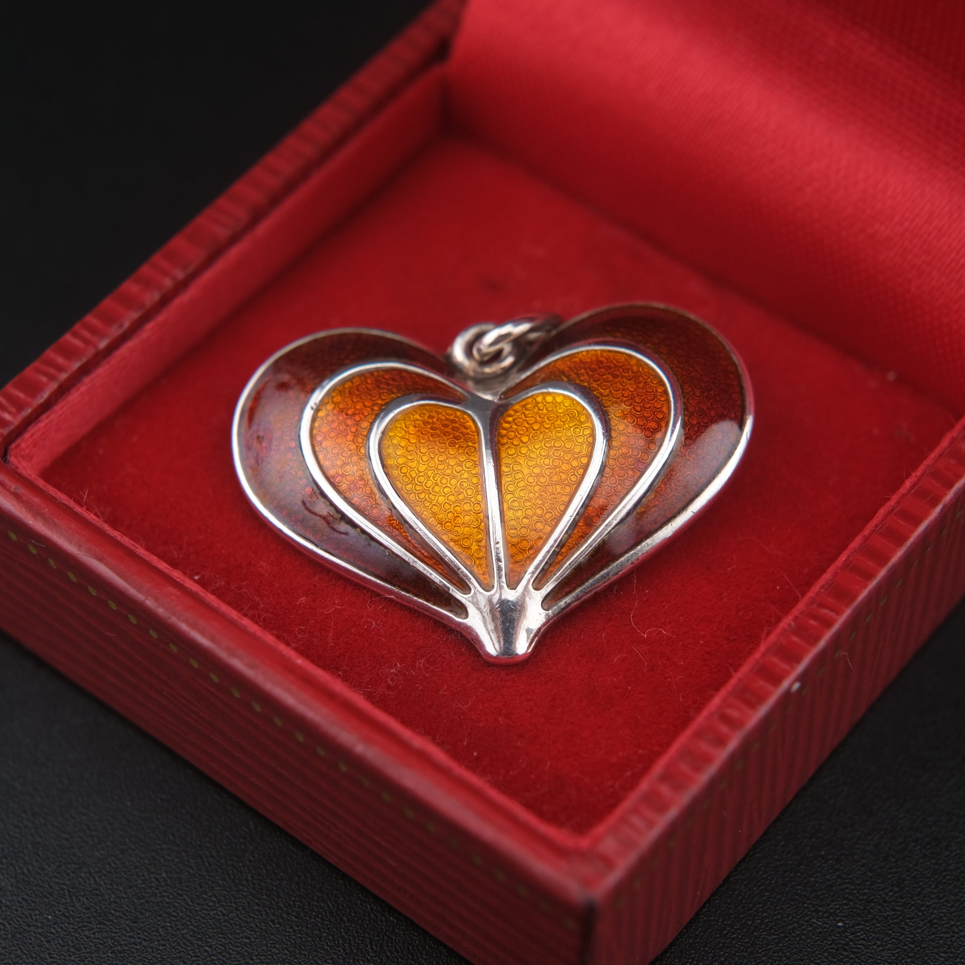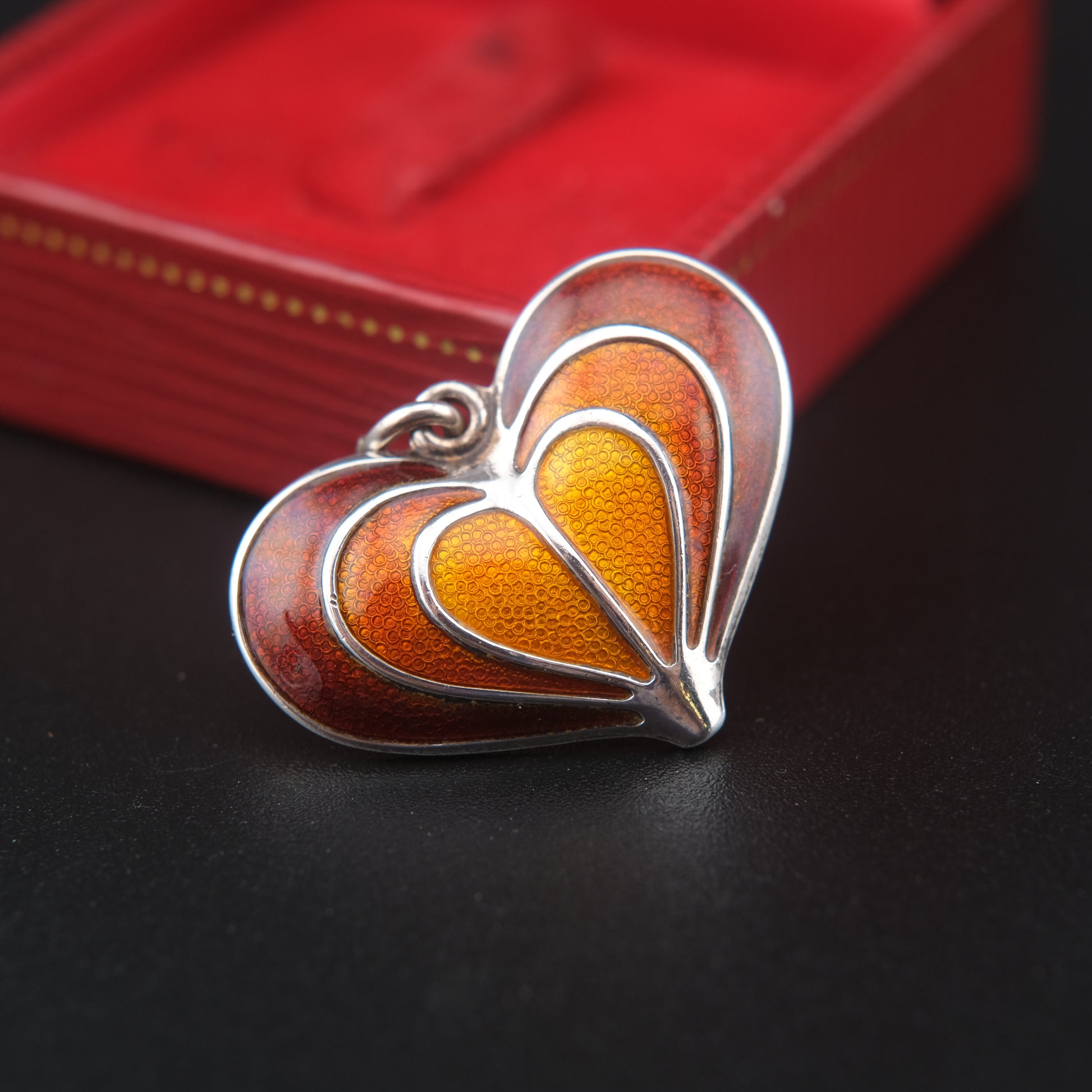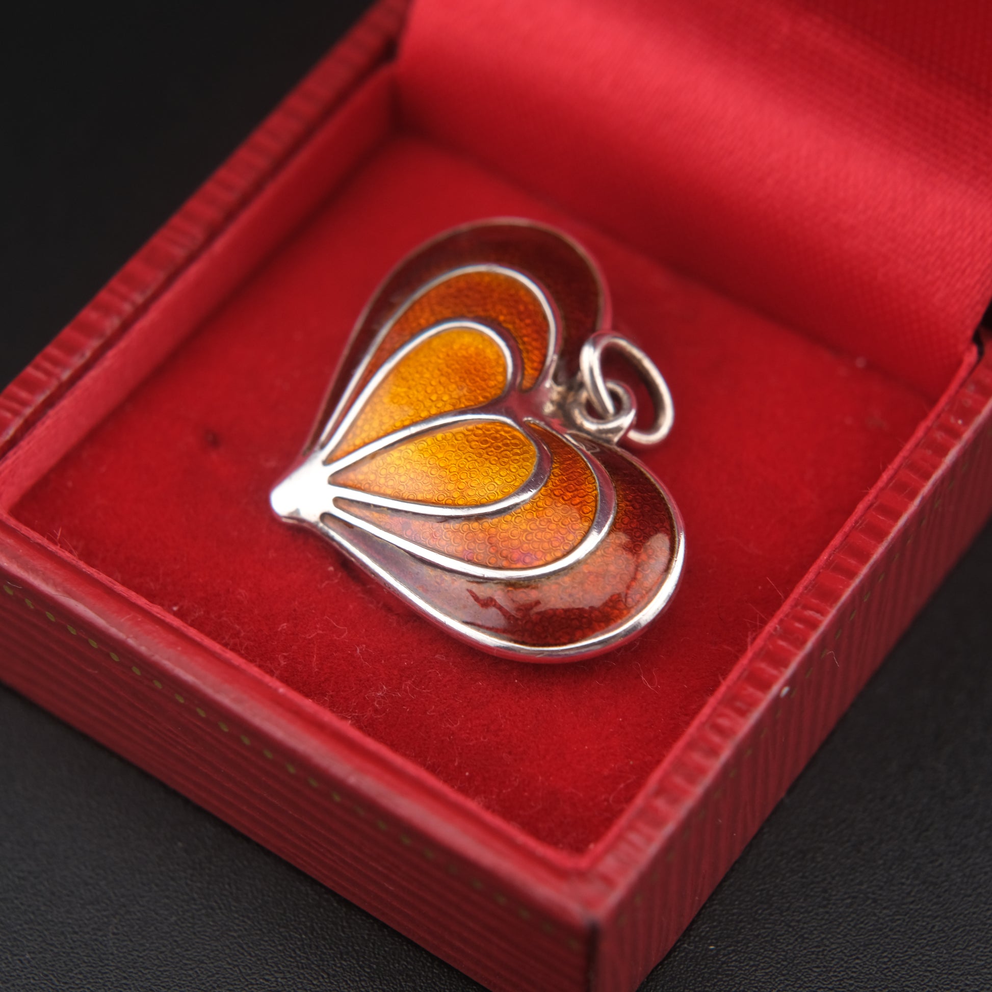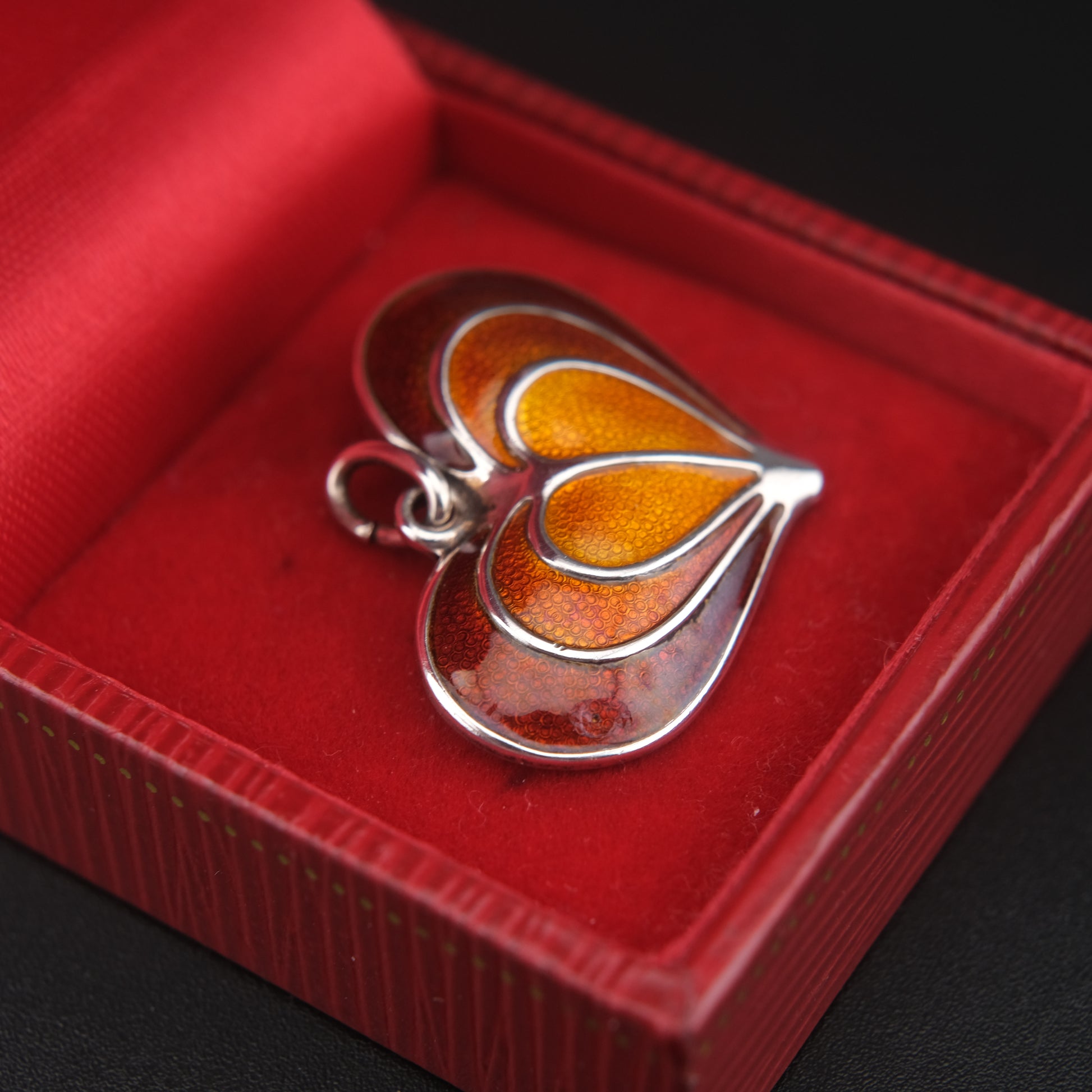 Add a touch of Scandinavian artistry to your collection with this vintage David-Andersen pendant. Beautifully crafted in sterling silver and adorned with vibrant guilloché enamel in shades of orange and red, this heart-shaped design showcases the brand’s signature craftsmanship and timeless appeal.