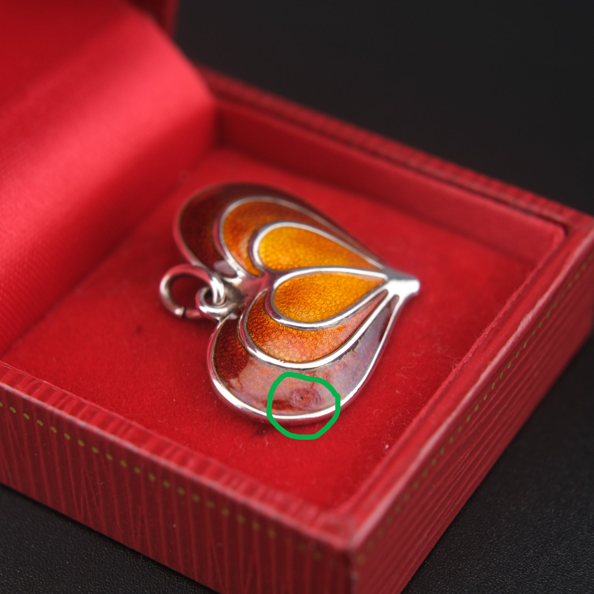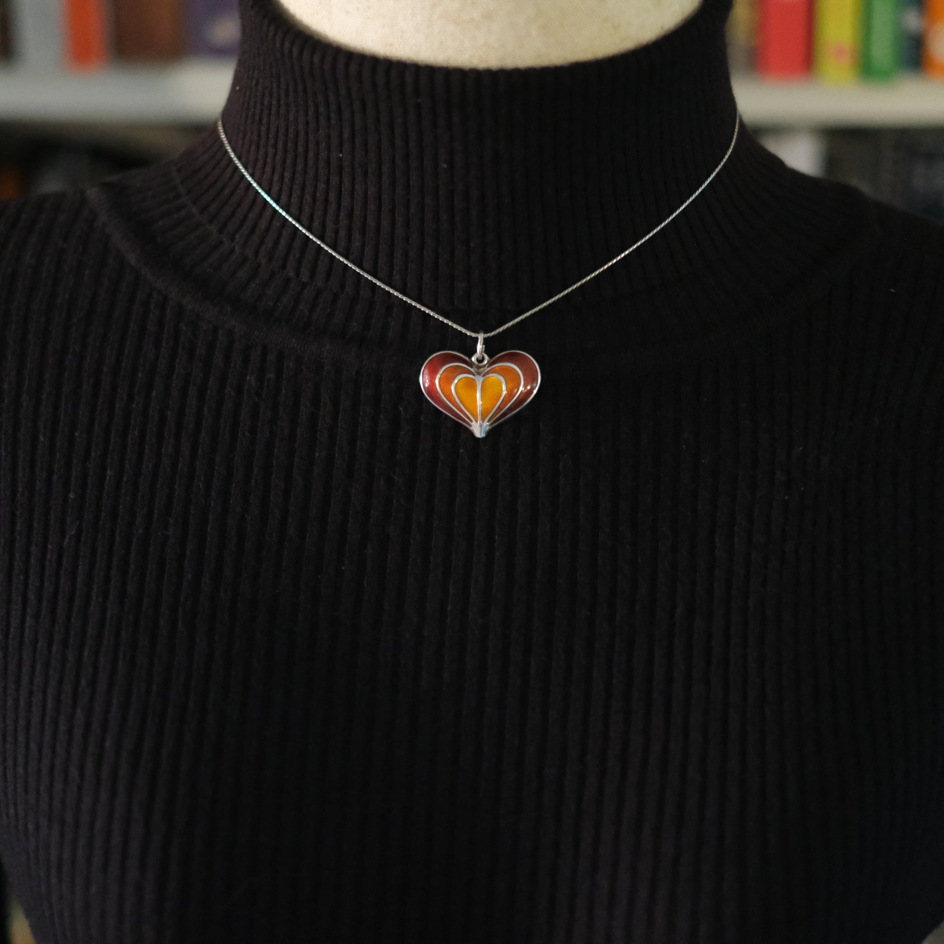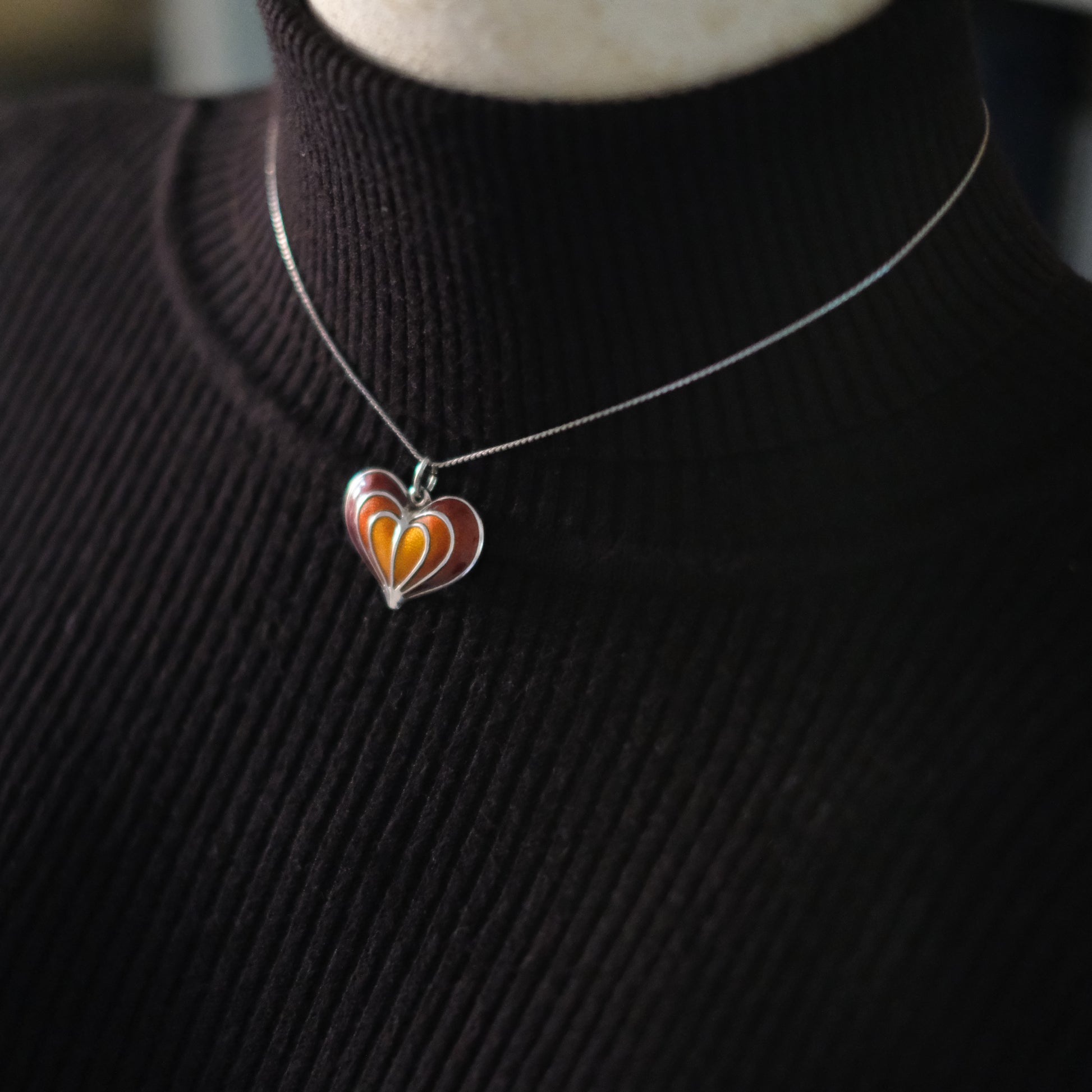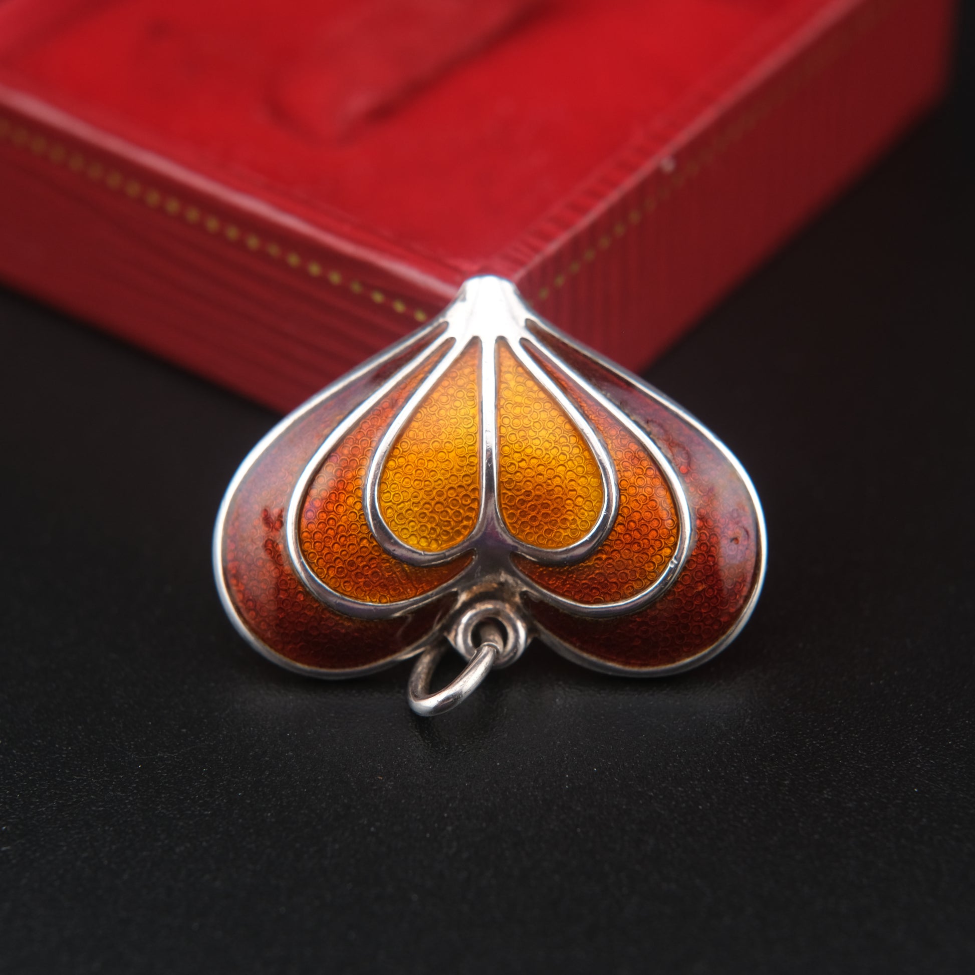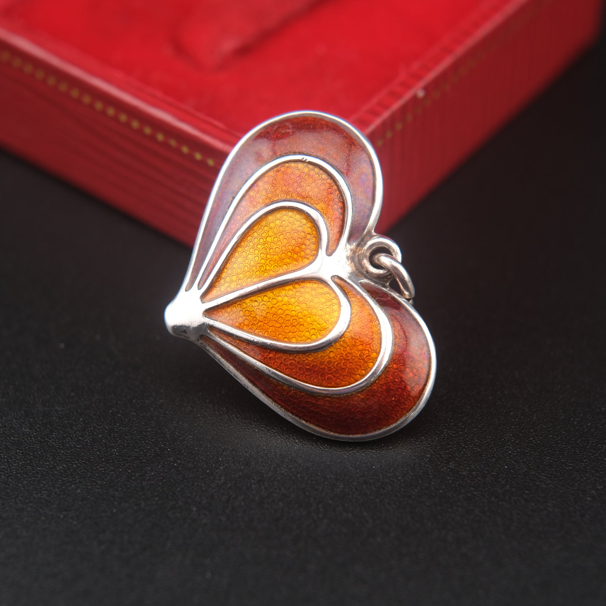 Add a touch of Scandinavian artistry to your collection with this vintage David-Andersen pendant. Beautifully crafted in sterling silver and adorned with vibrant guilloché enamel in shades of orange and red, this heart-shaped design showcases the brand’s signature craftsmanship and timeless appeal.