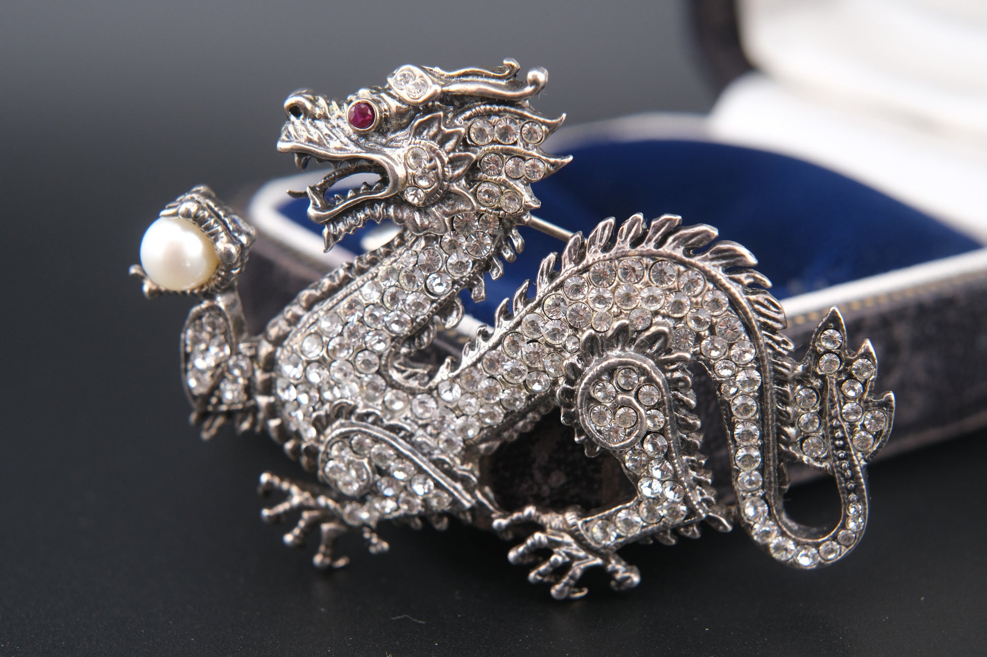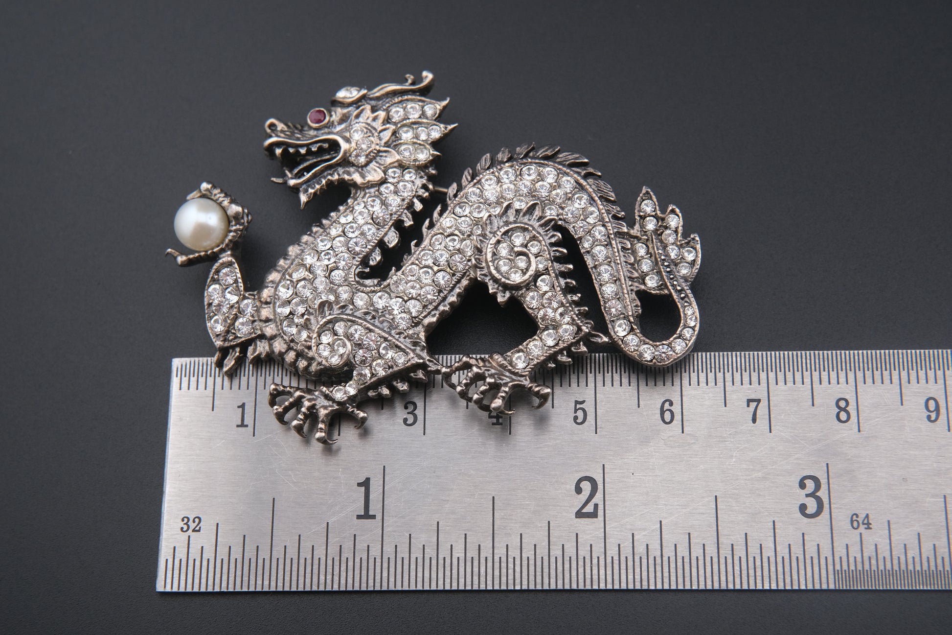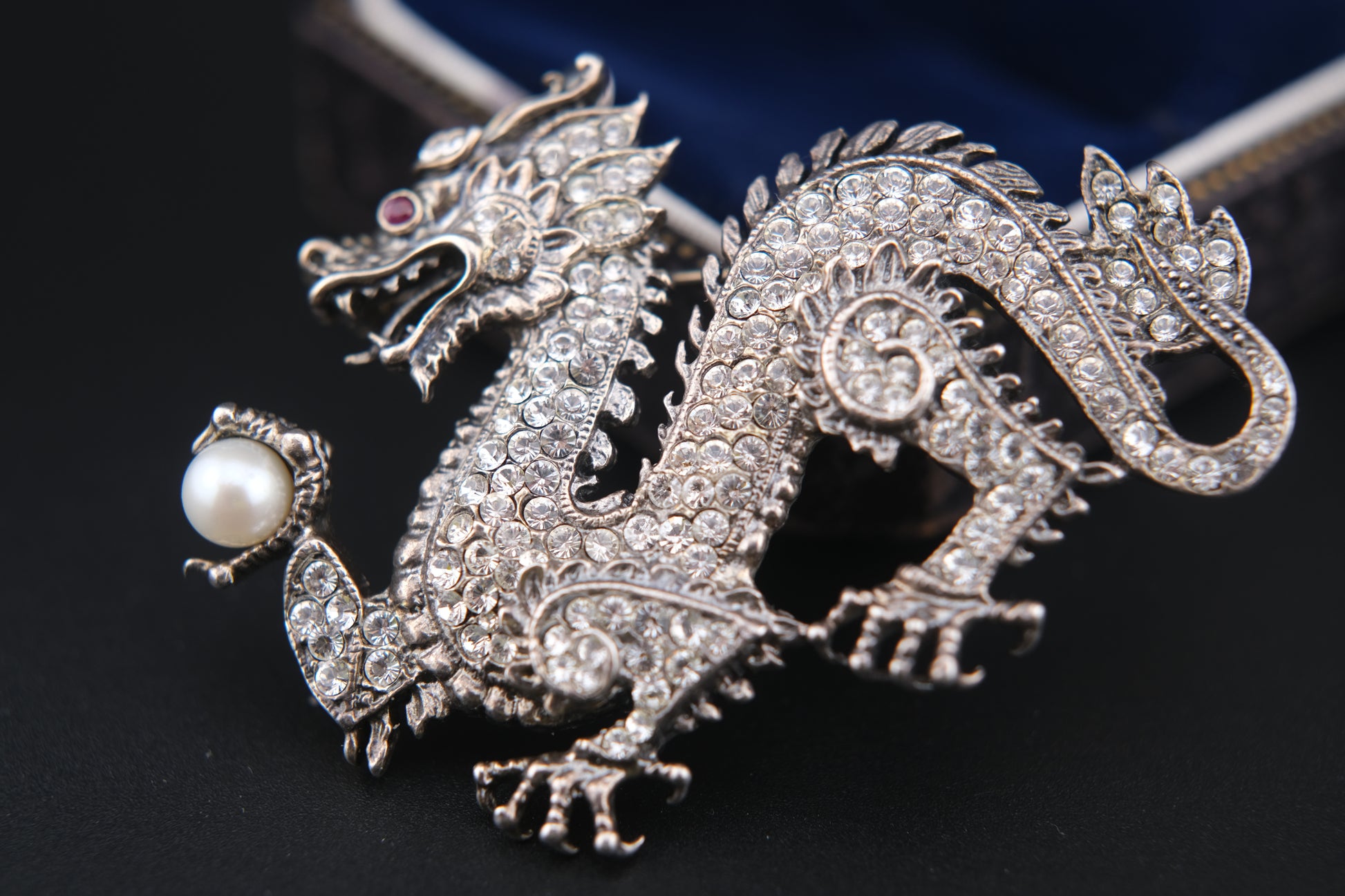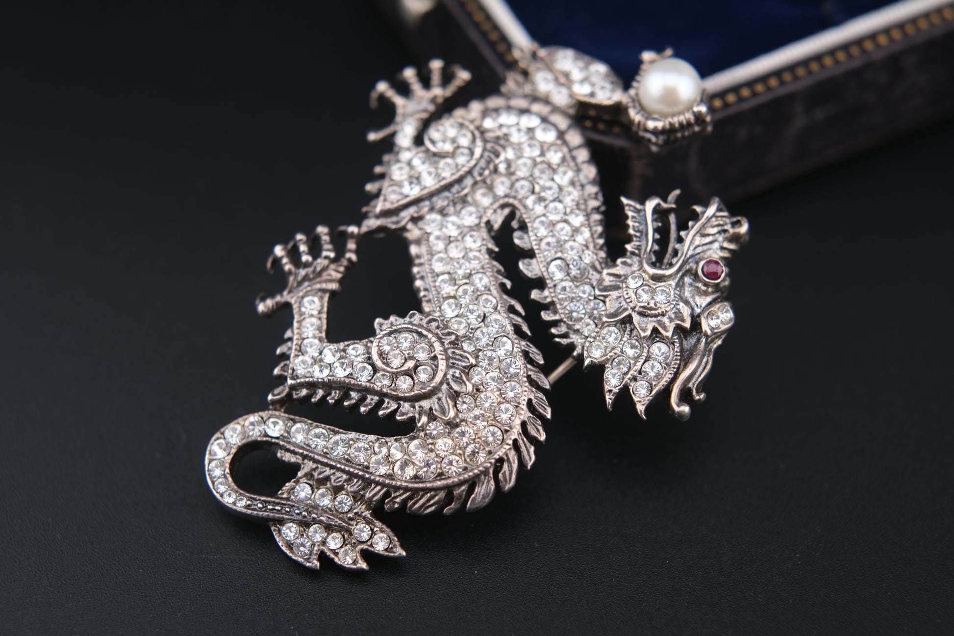 - Design: Majestic dragon with clear crystal pavé body, pearl in claw, and red gemstone eye