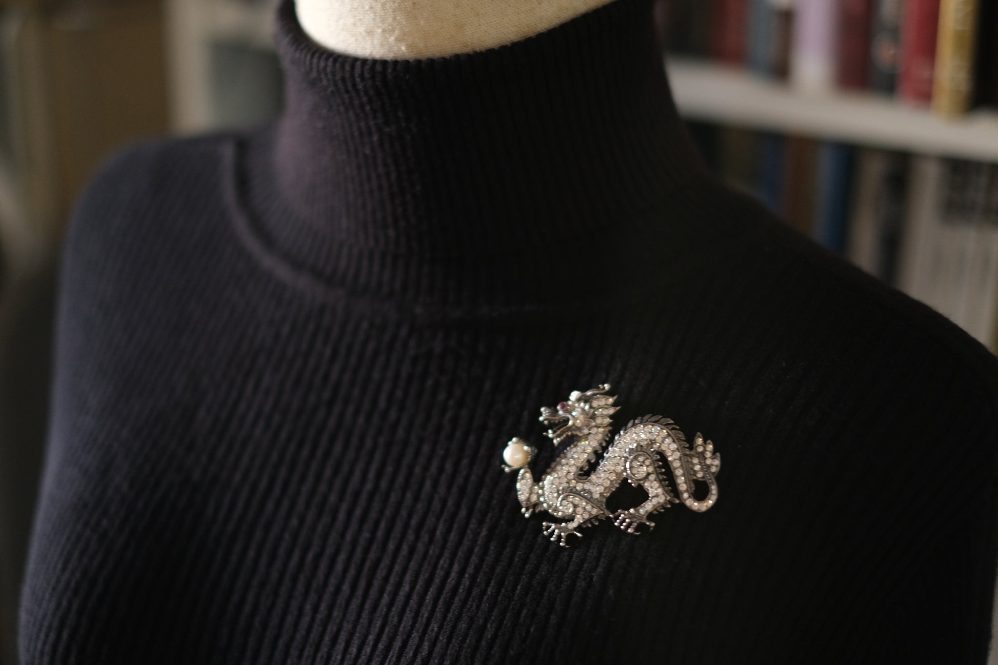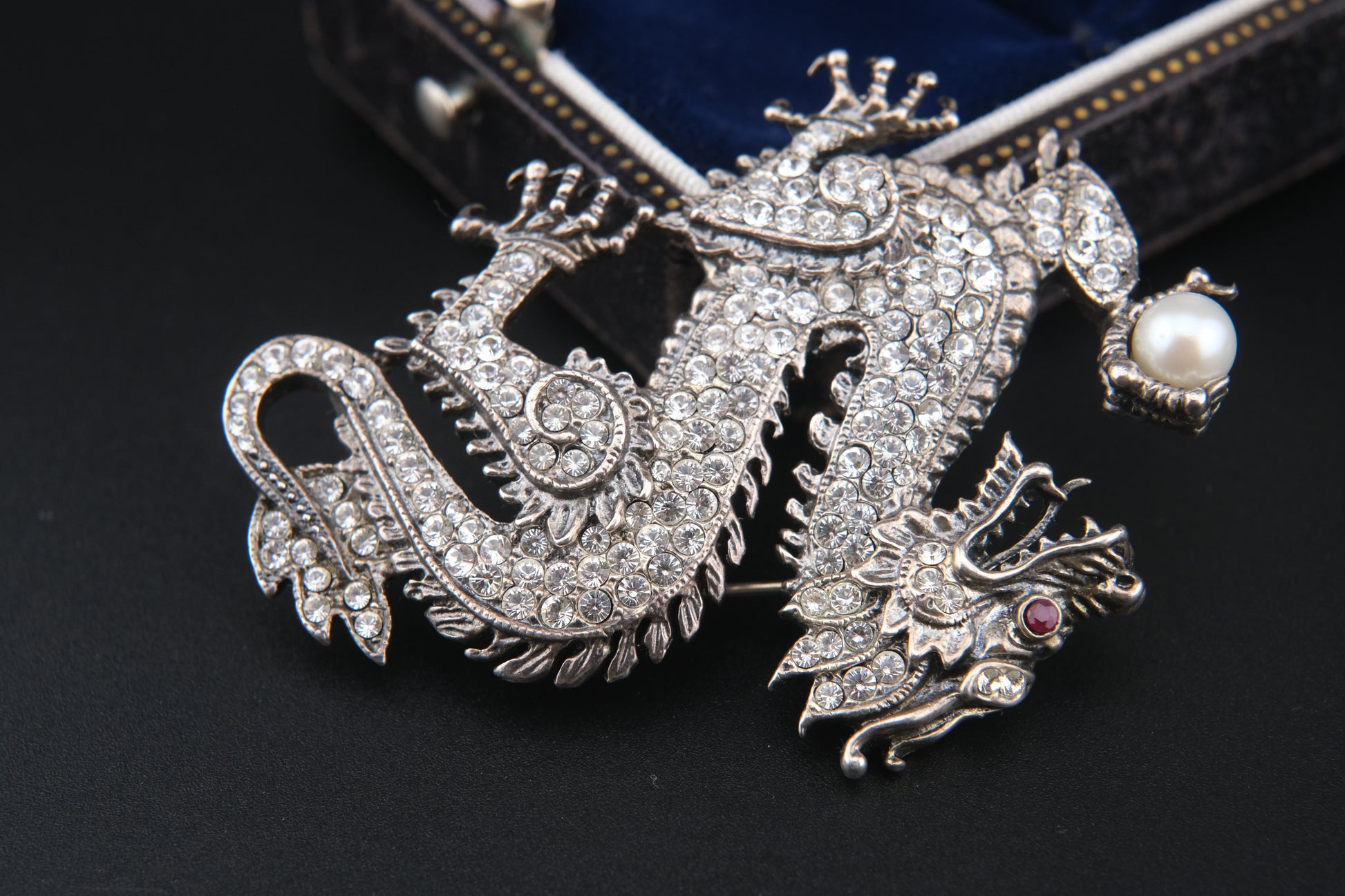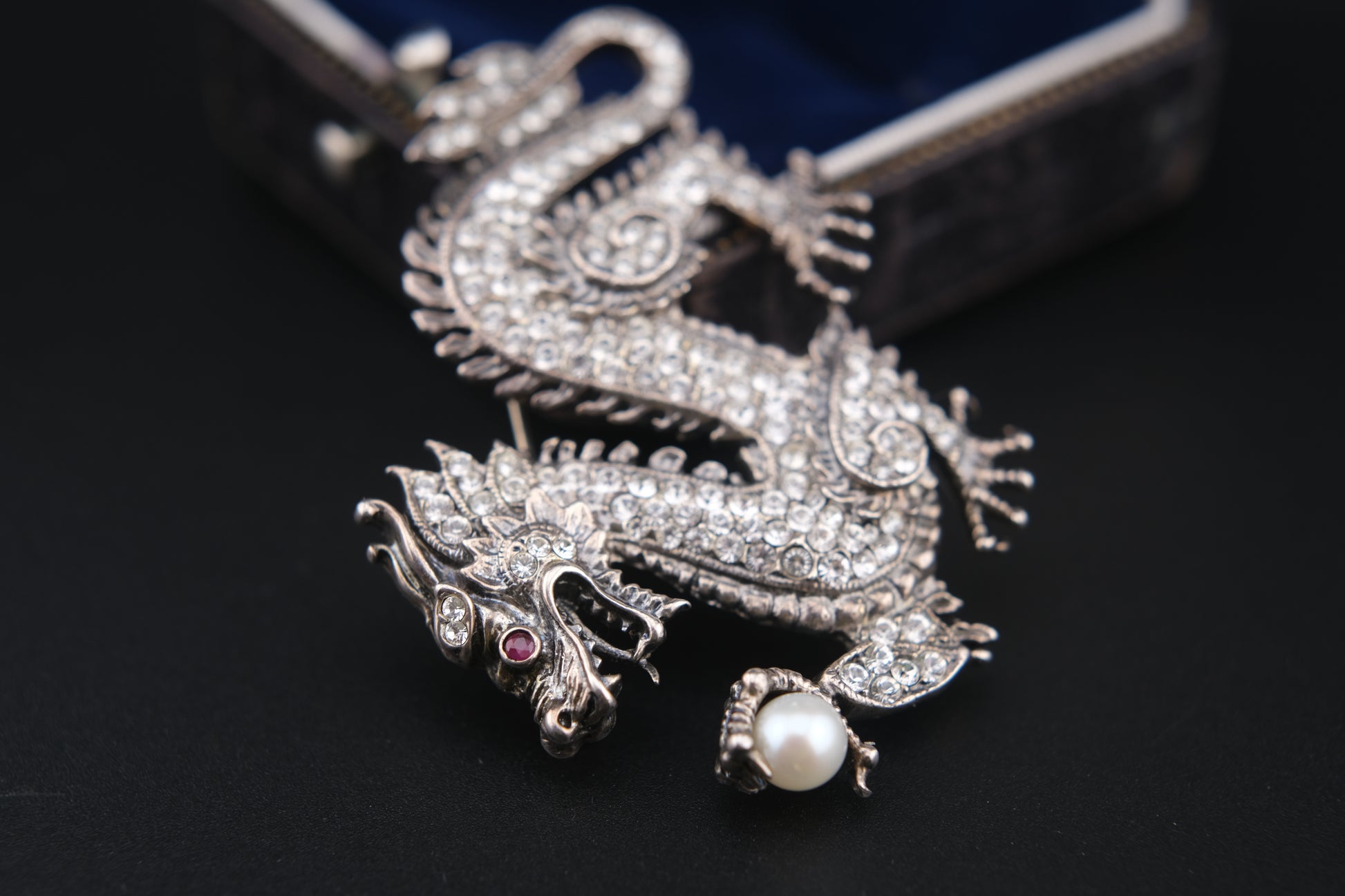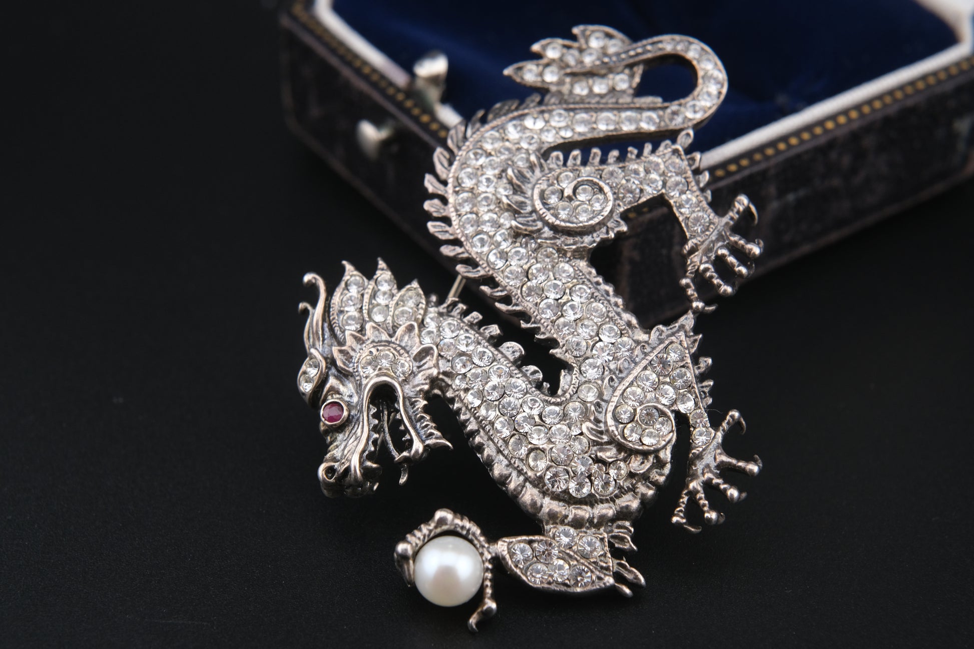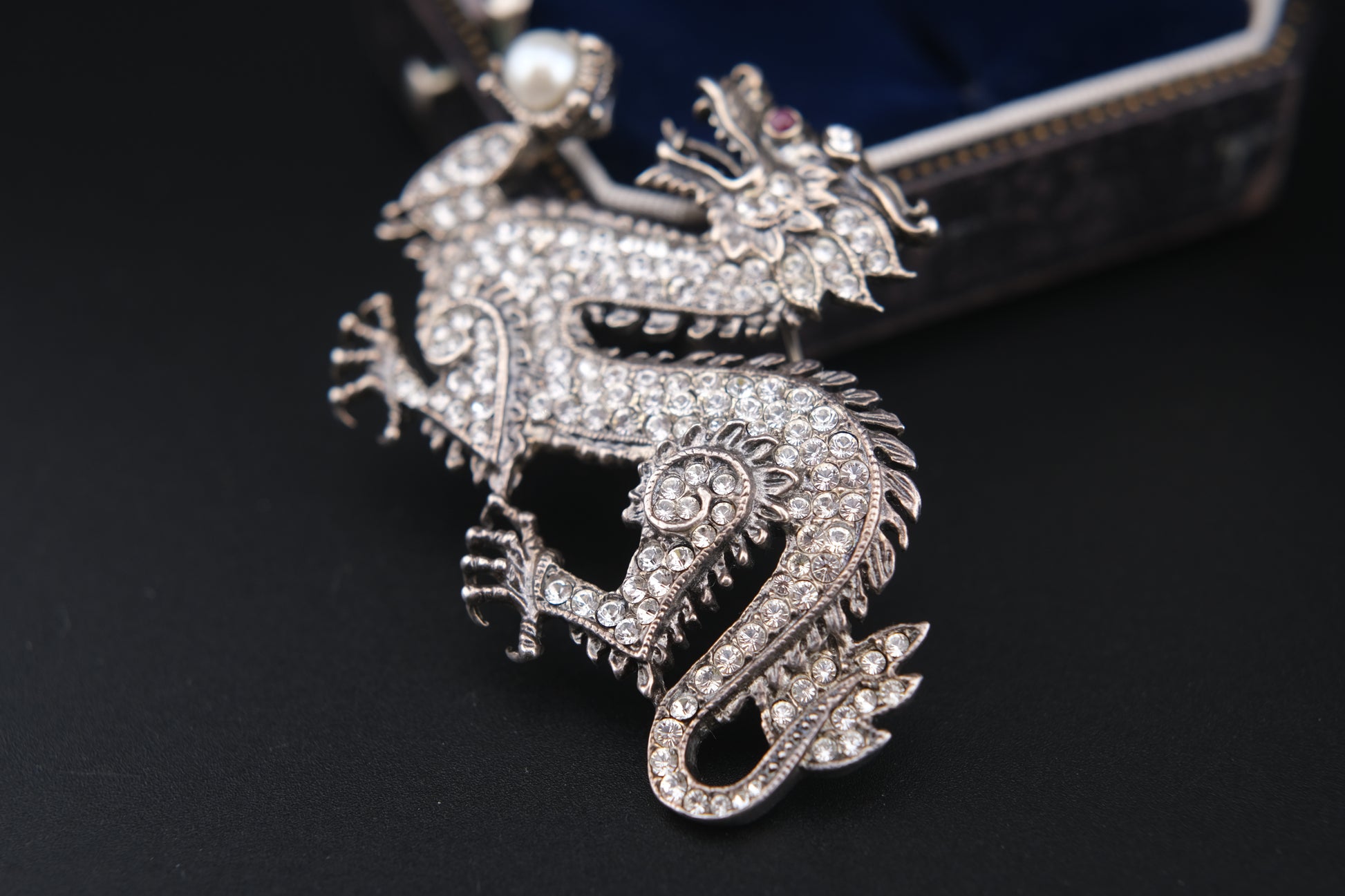 - Design: Majestic dragon with clear crystal pavé body, pearl in claw, and red gemstone eye
