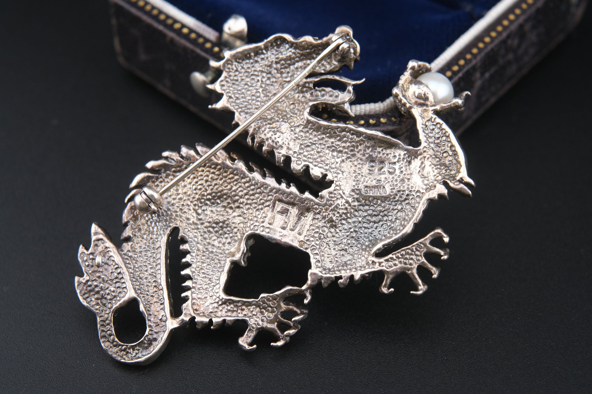 Franklin Mint Sterling Silver Dragon Brooch – Crystal Pavé with Pearl & Red Gem Eye