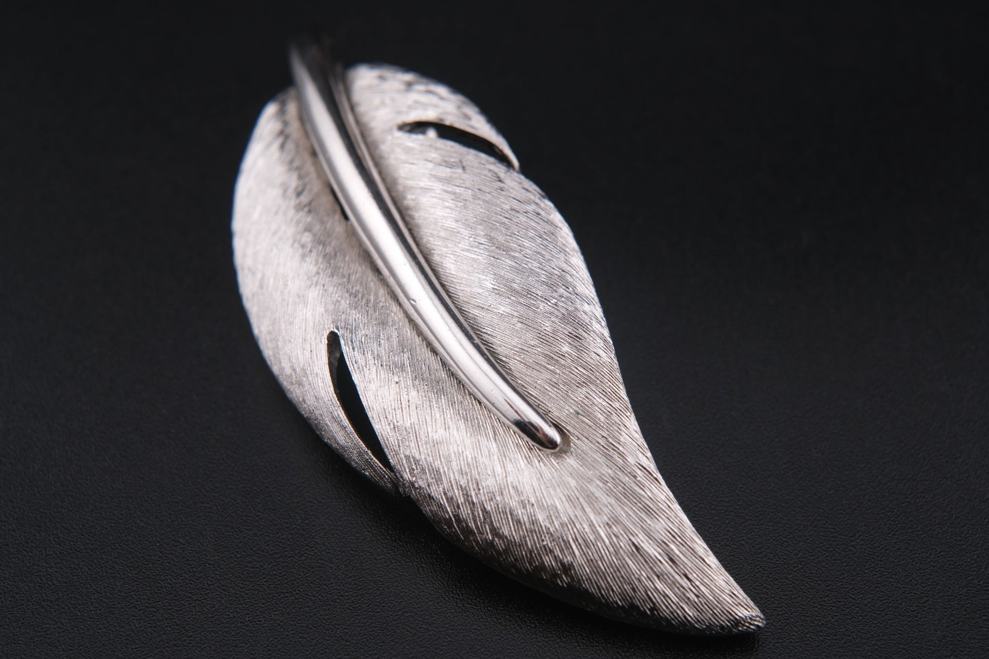 - Design: Stylized leaf/feather with brushed and polished finishes