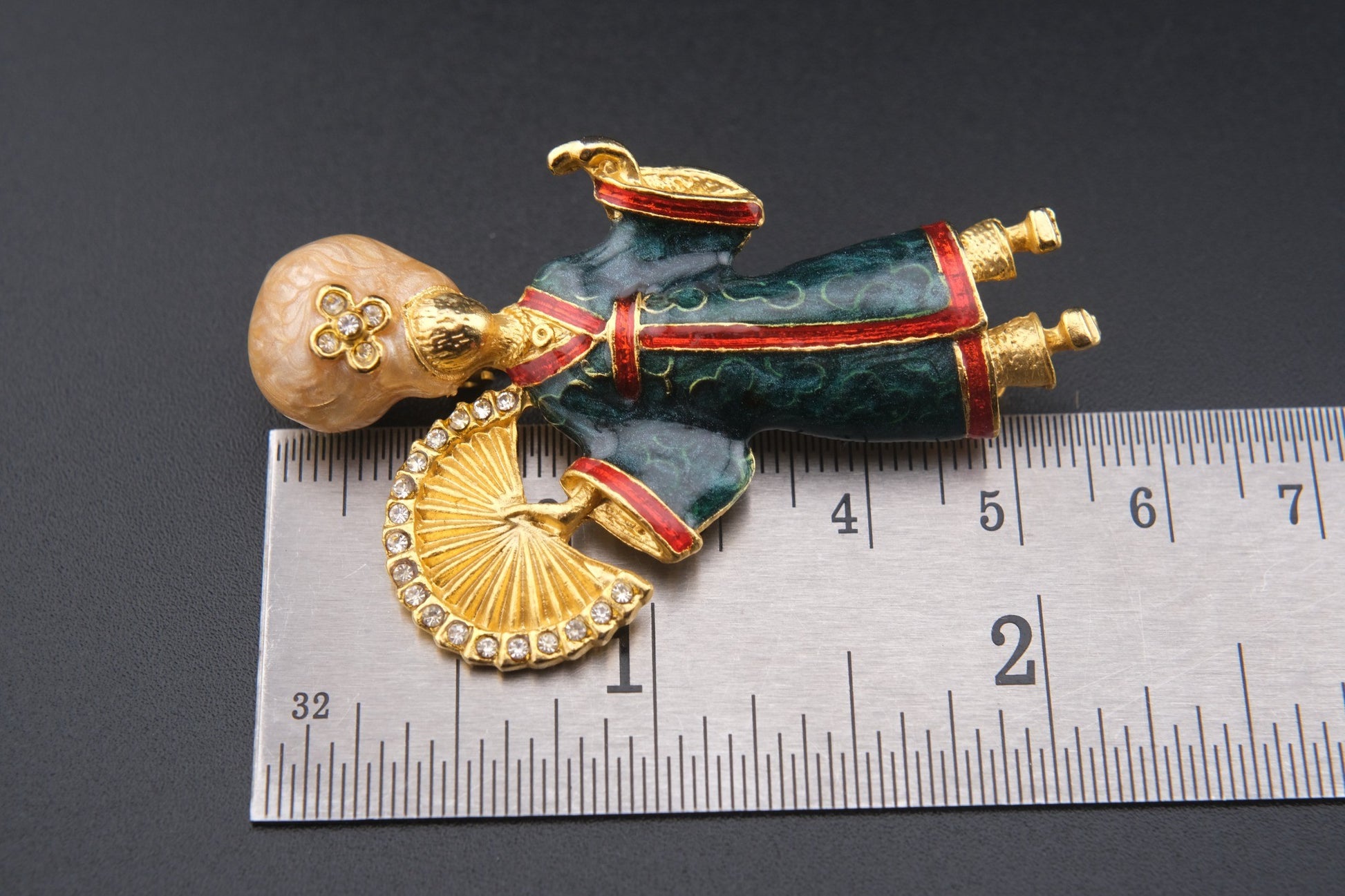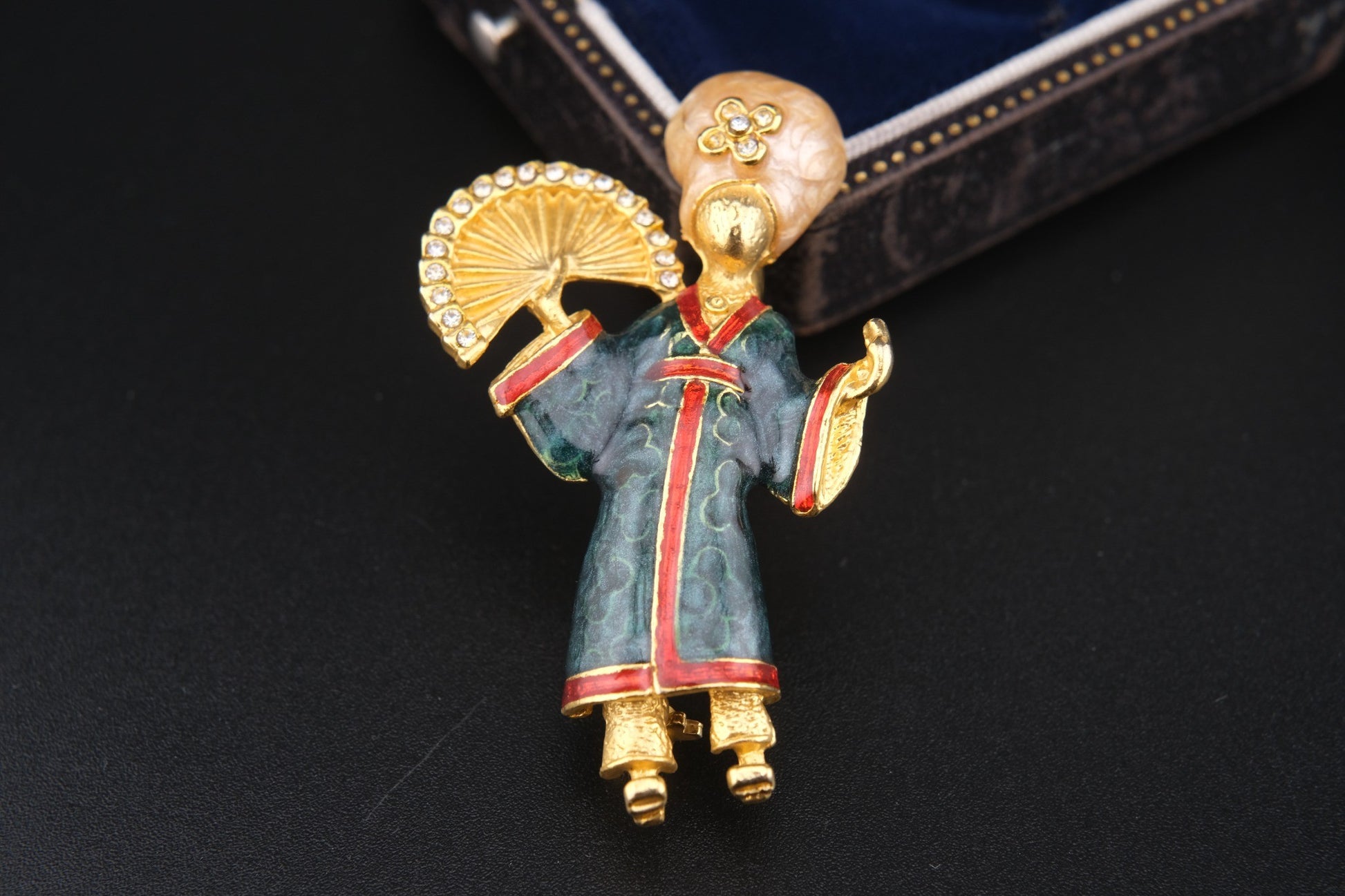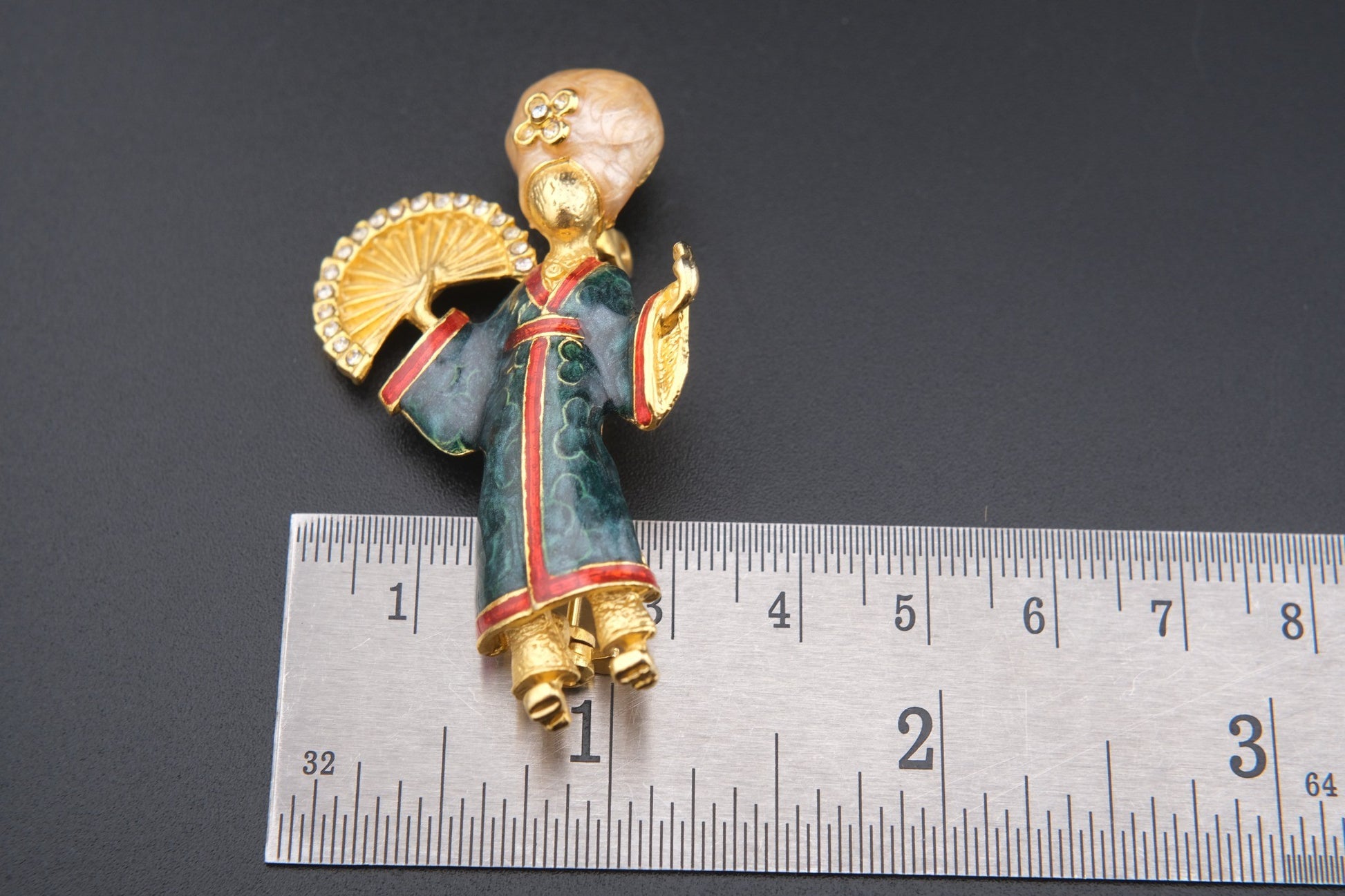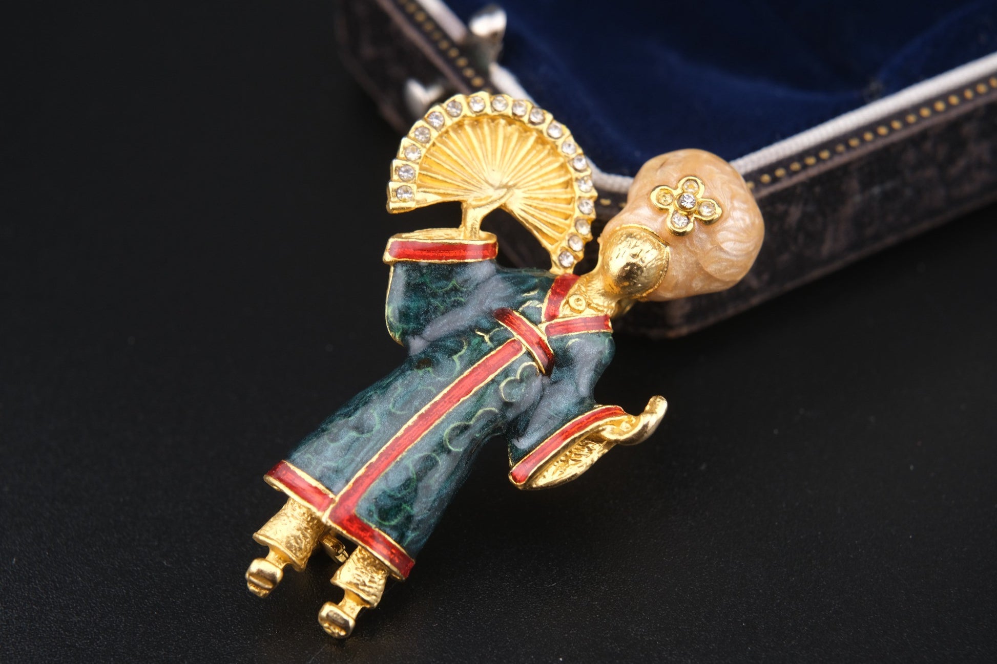 Celebrate the beauty of cultural artistry with this vintage figural brooch inspired by the elegance of a traditional fan dancer. Exquisitely detailed in enamel and rhinestones, this unsigned piece exhibits all the hallmarks of CINER's mid-century craftsmanship — from the ornate detailing to the signature stippled gold-tone backing.