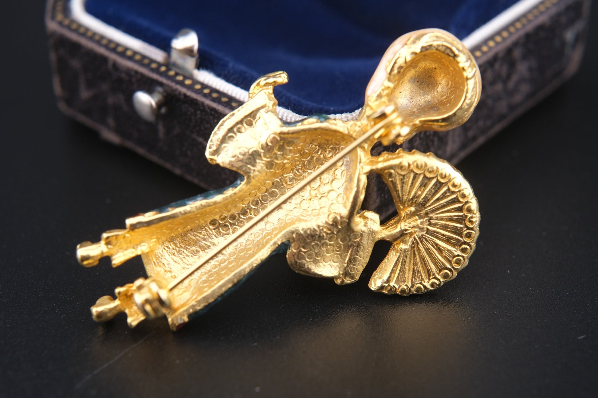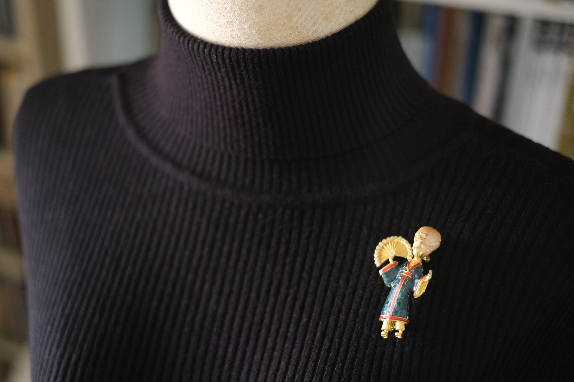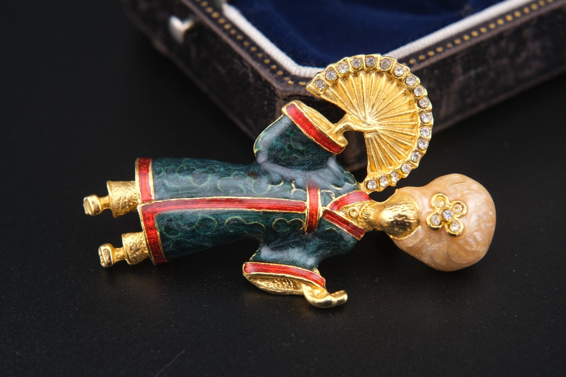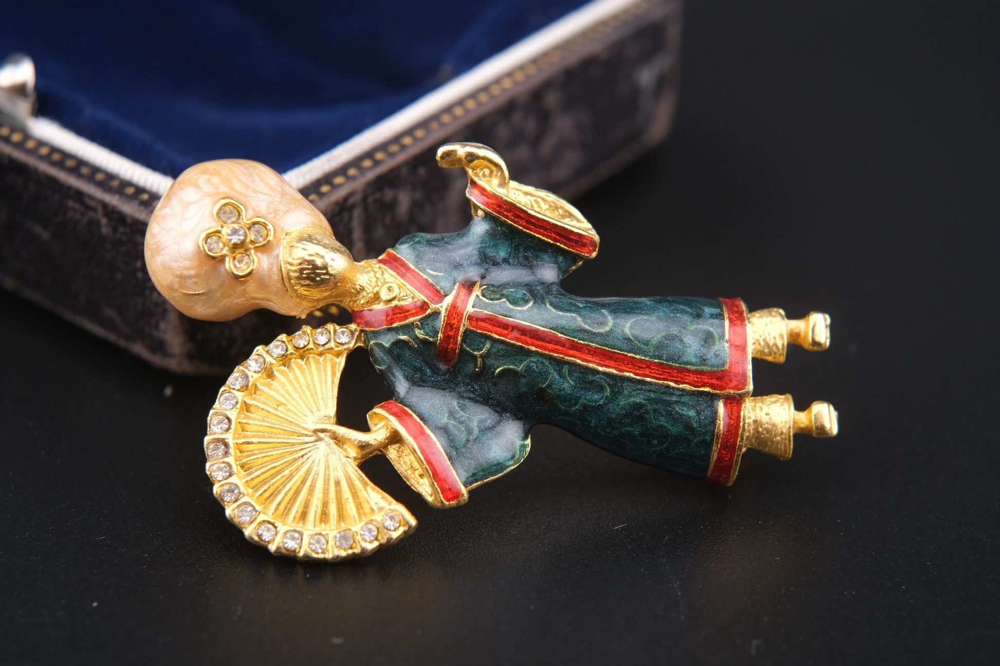 Celebrate the beauty of cultural artistry with this vintage figural brooch inspired by the elegance of a traditional fan dancer. Exquisitely detailed in enamel and rhinestones, this unsigned piece exhibits all the hallmarks of CINER's mid-century craftsmanship — from the ornate detailing to the signature stippled gold-tone backing.