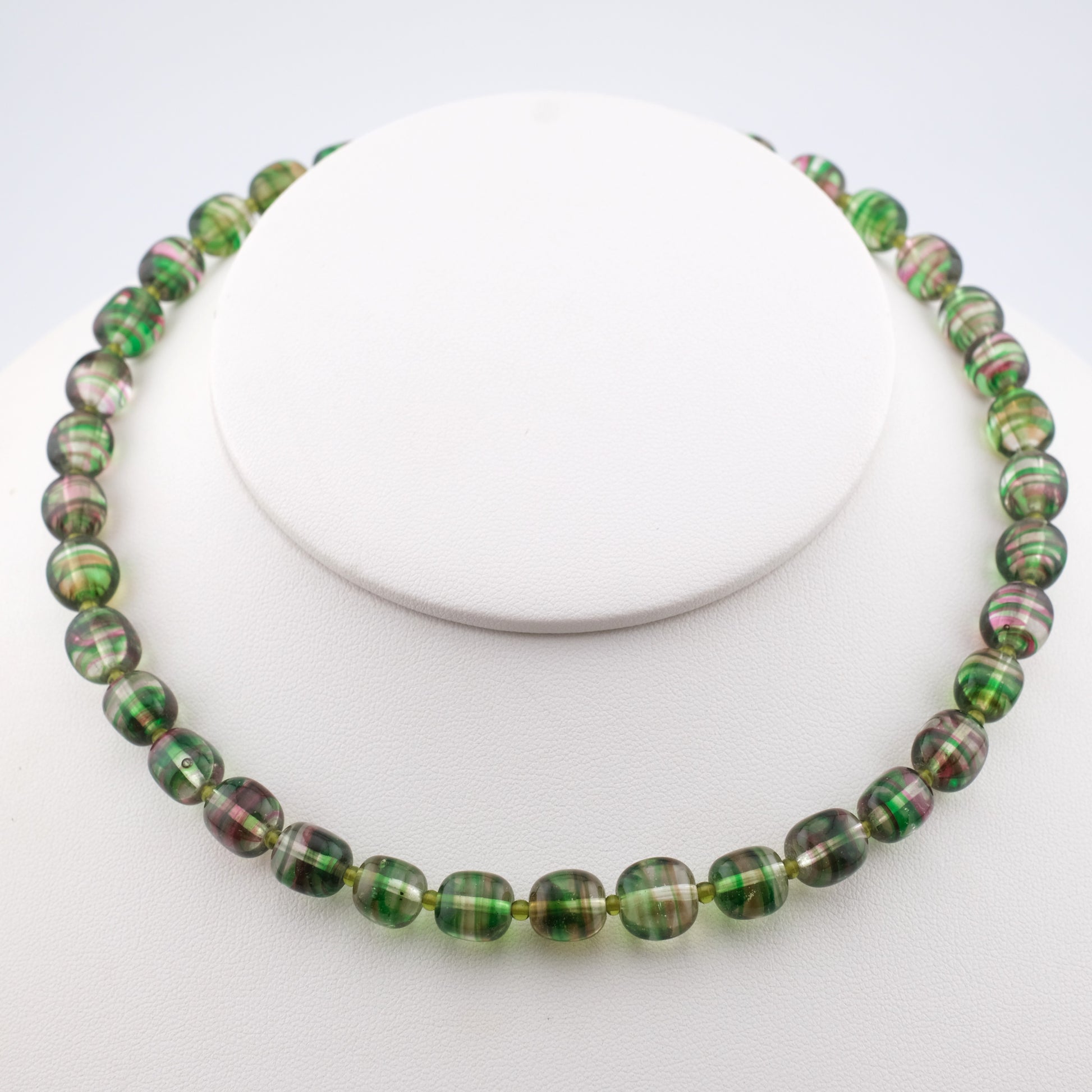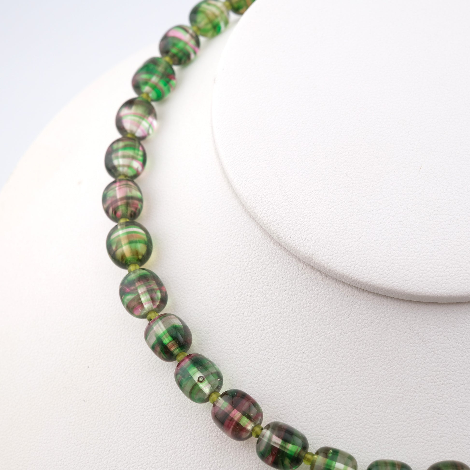 Kenzo Glass Beaded Necklace – Striped Green & Pink Beads – 16” – Vintage Designer Jewelry