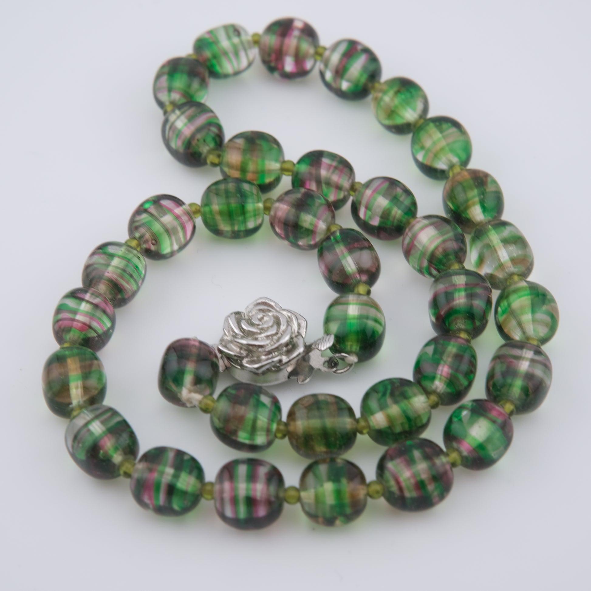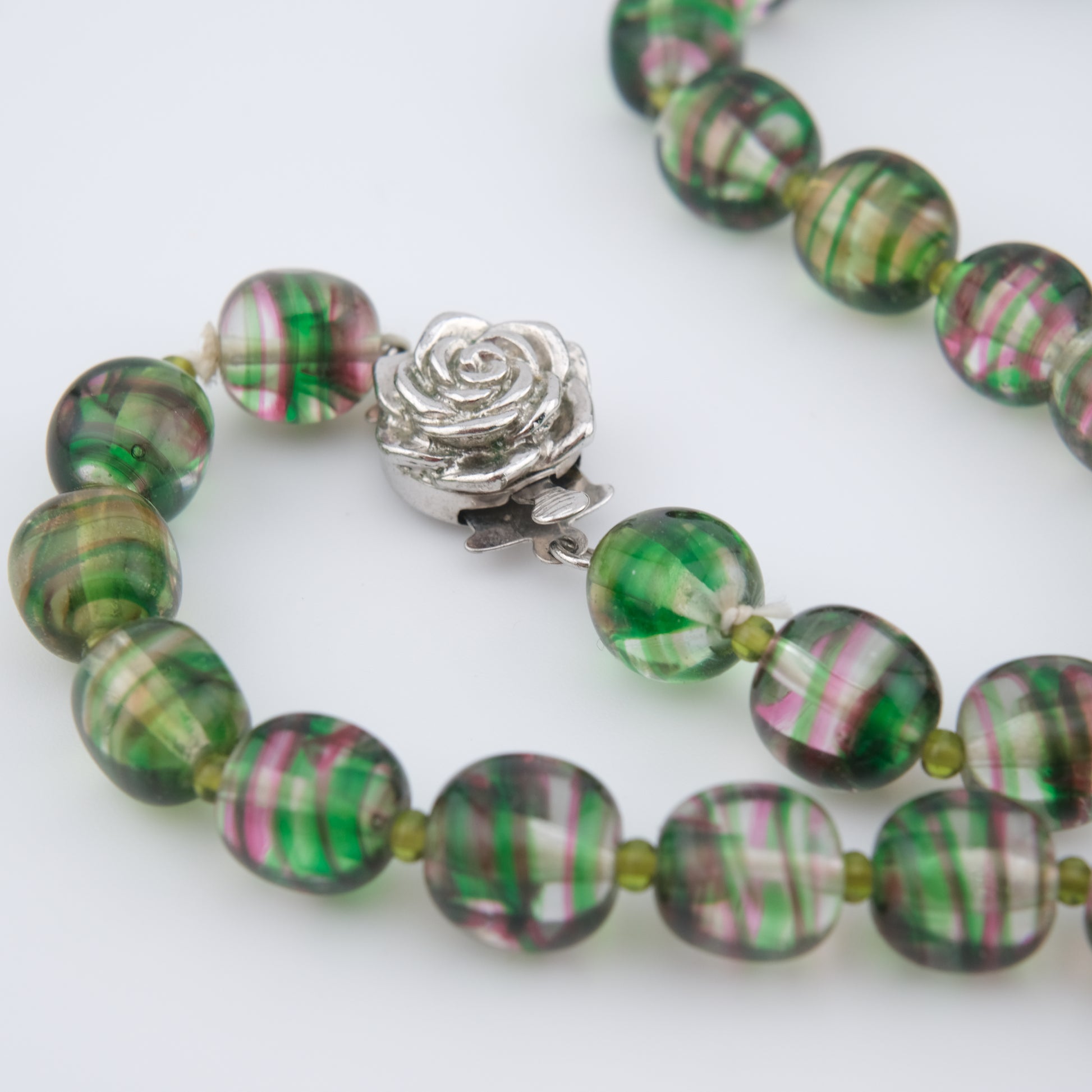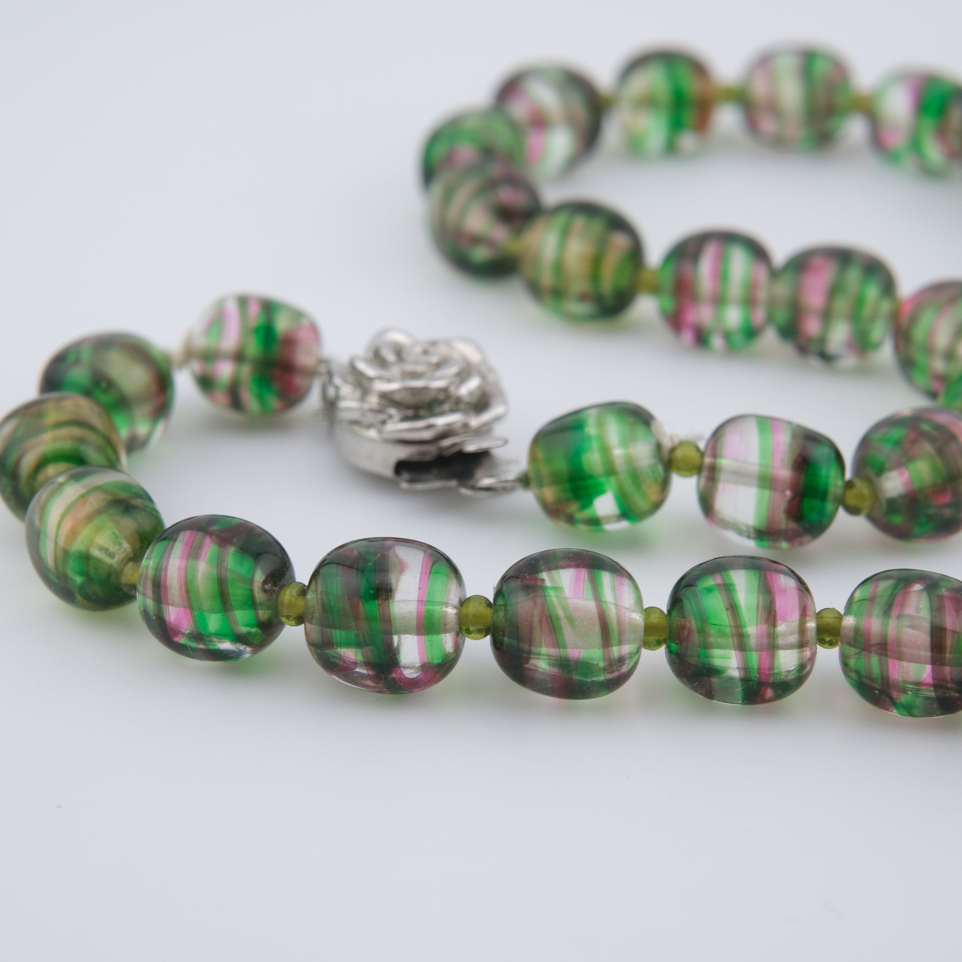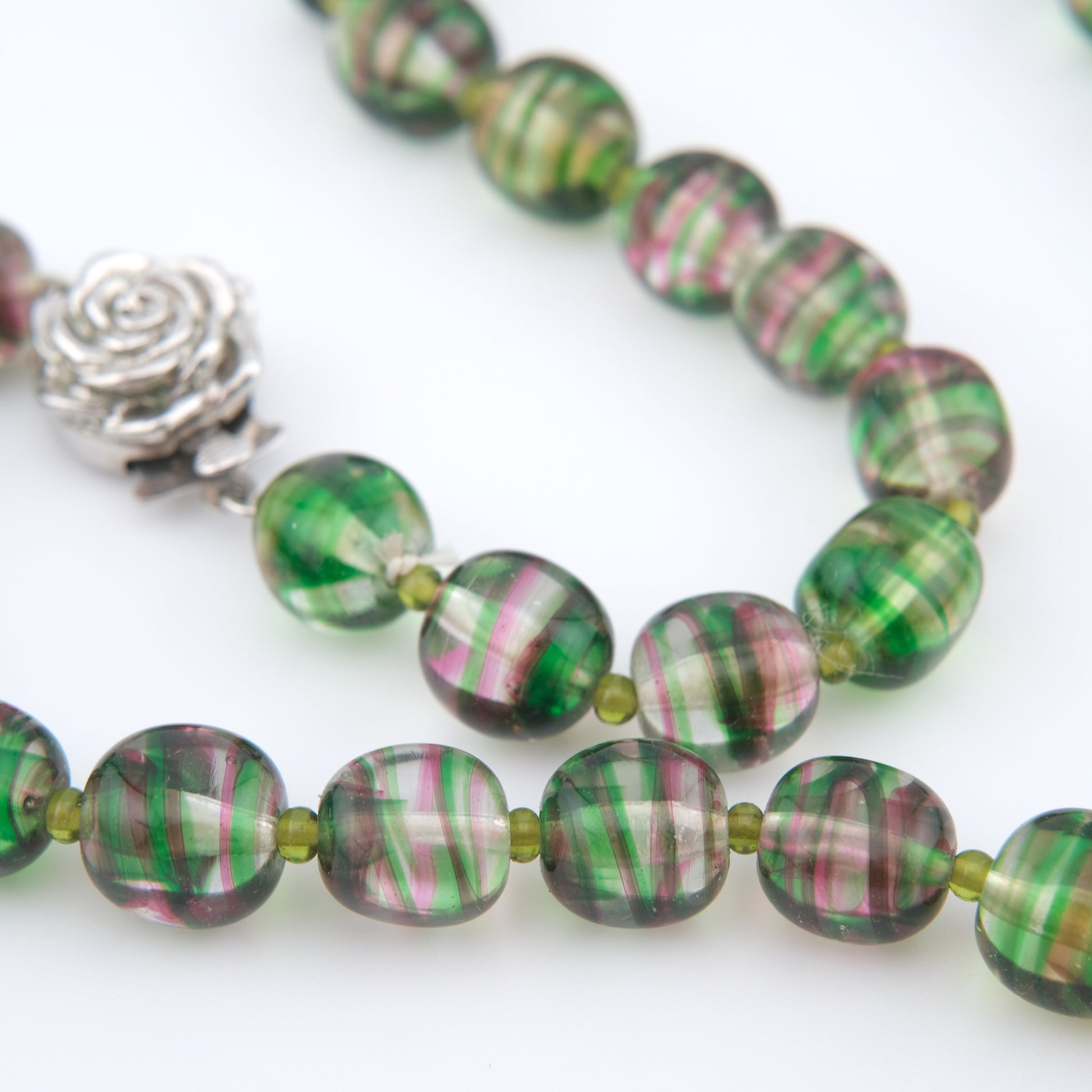 - Design: Alternating green and pink striped round beads with sculpted rose push clasp