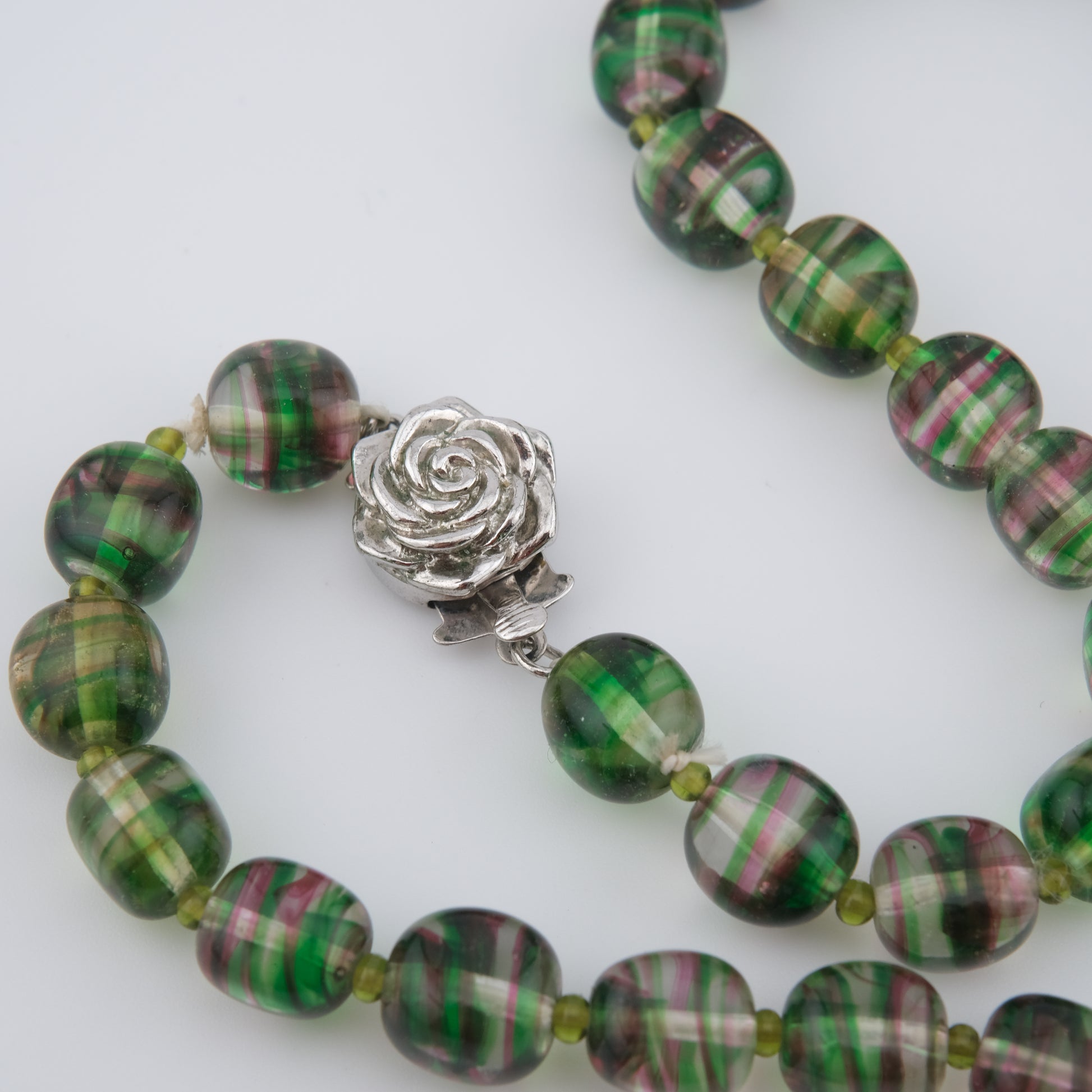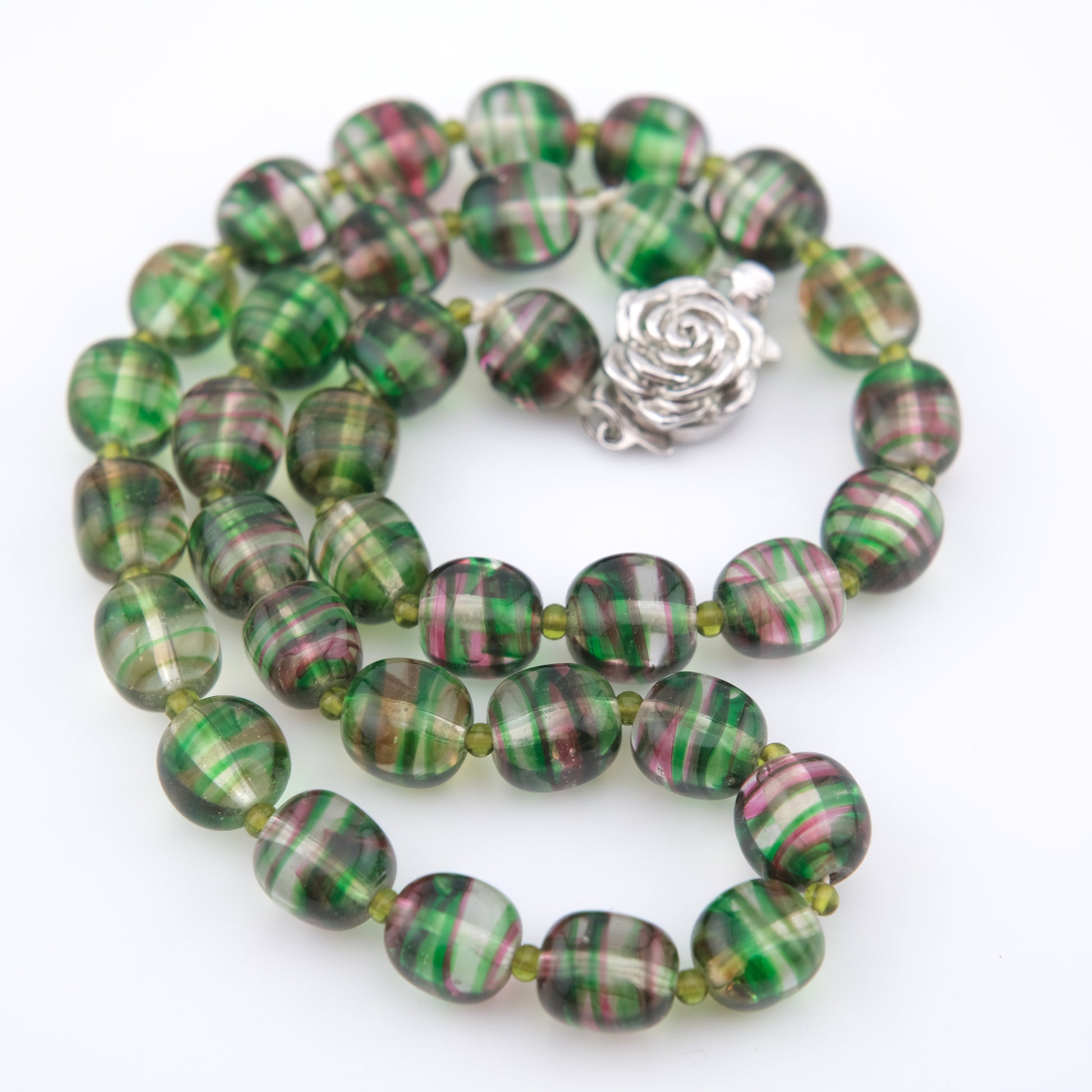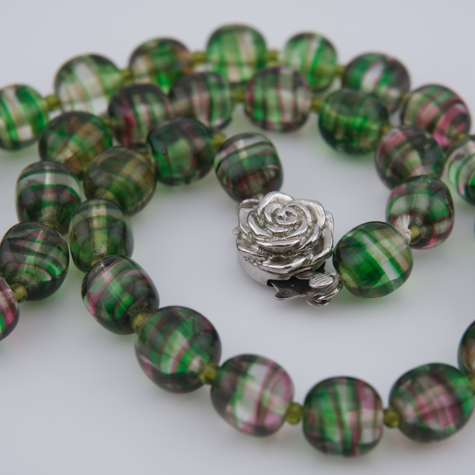 - Design: Alternating green and pink striped round beads with sculpted rose push clasp