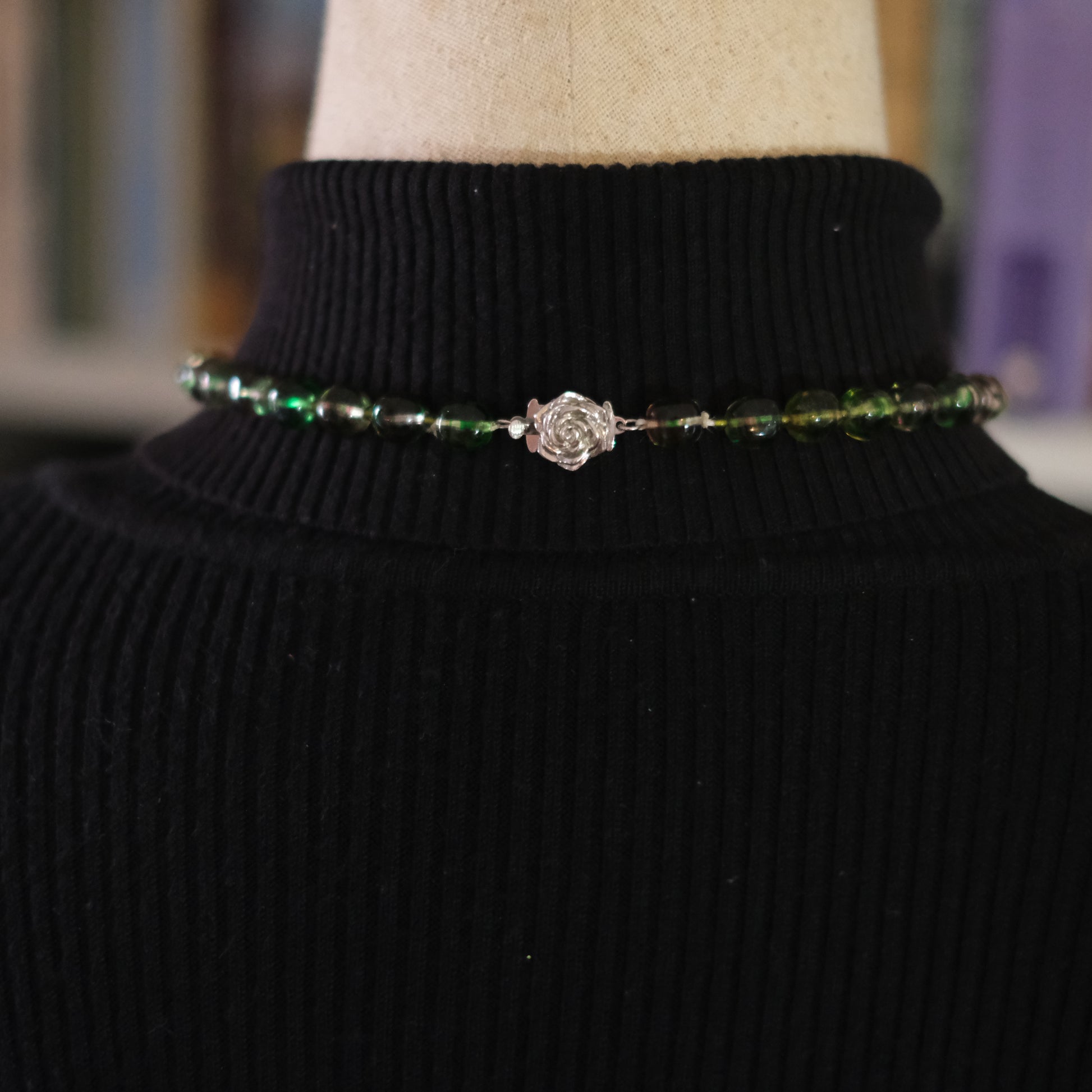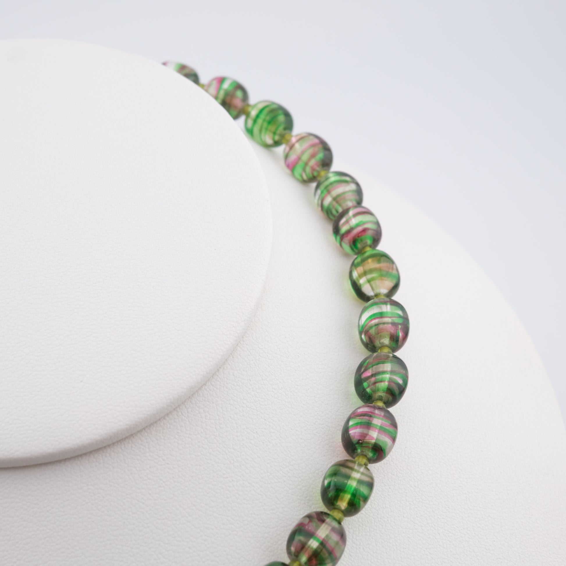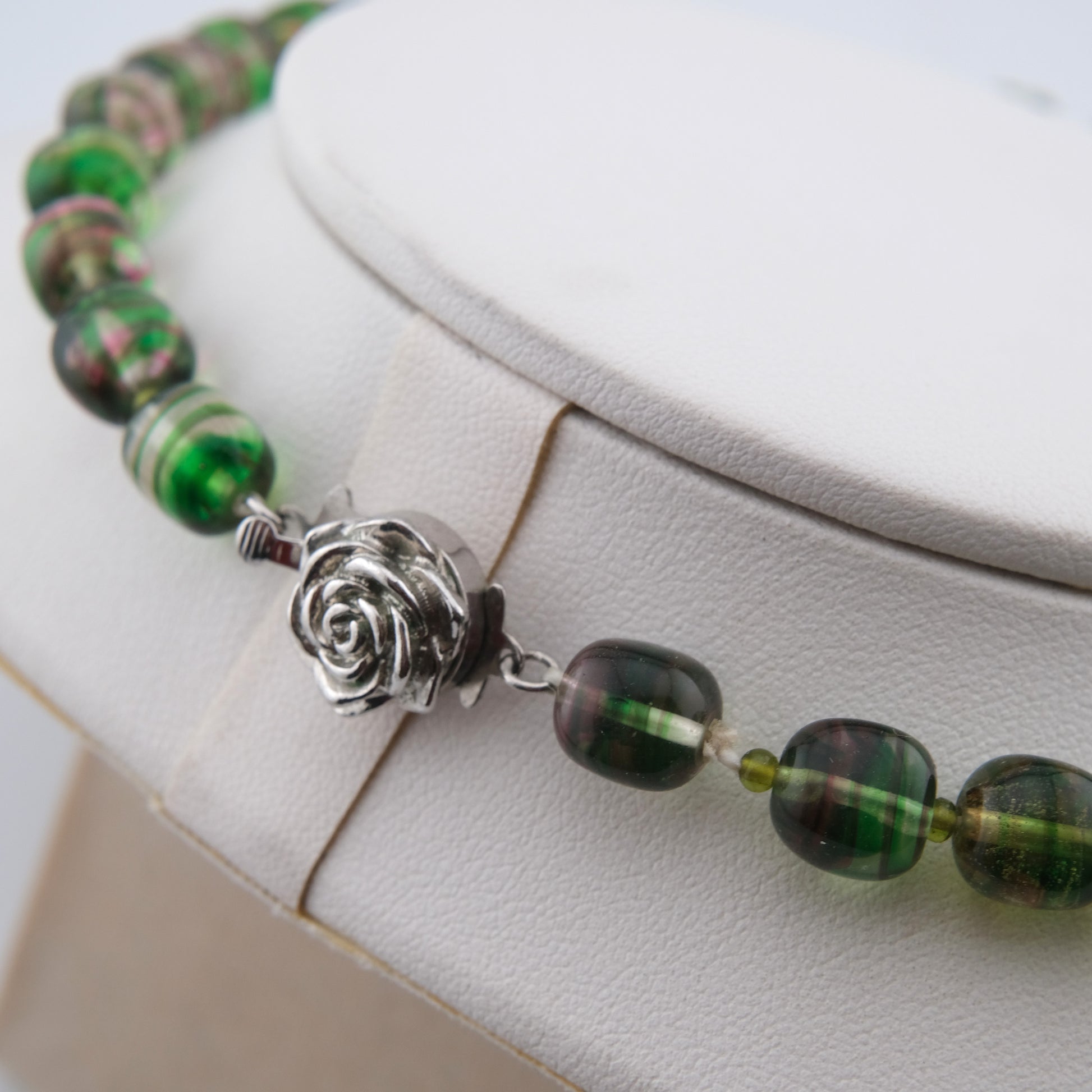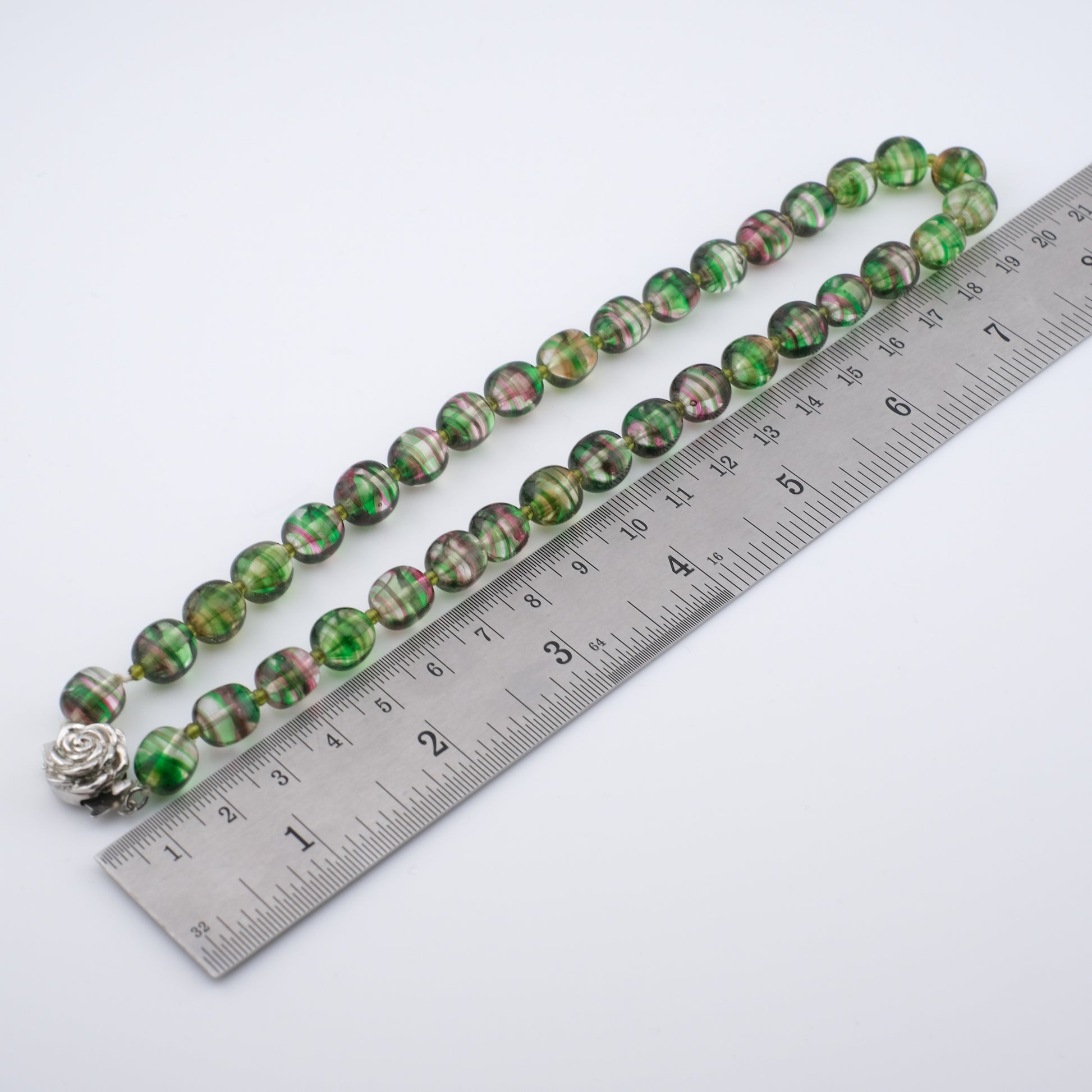 - Design: Alternating green and pink striped round beads with sculpted rose push clasp