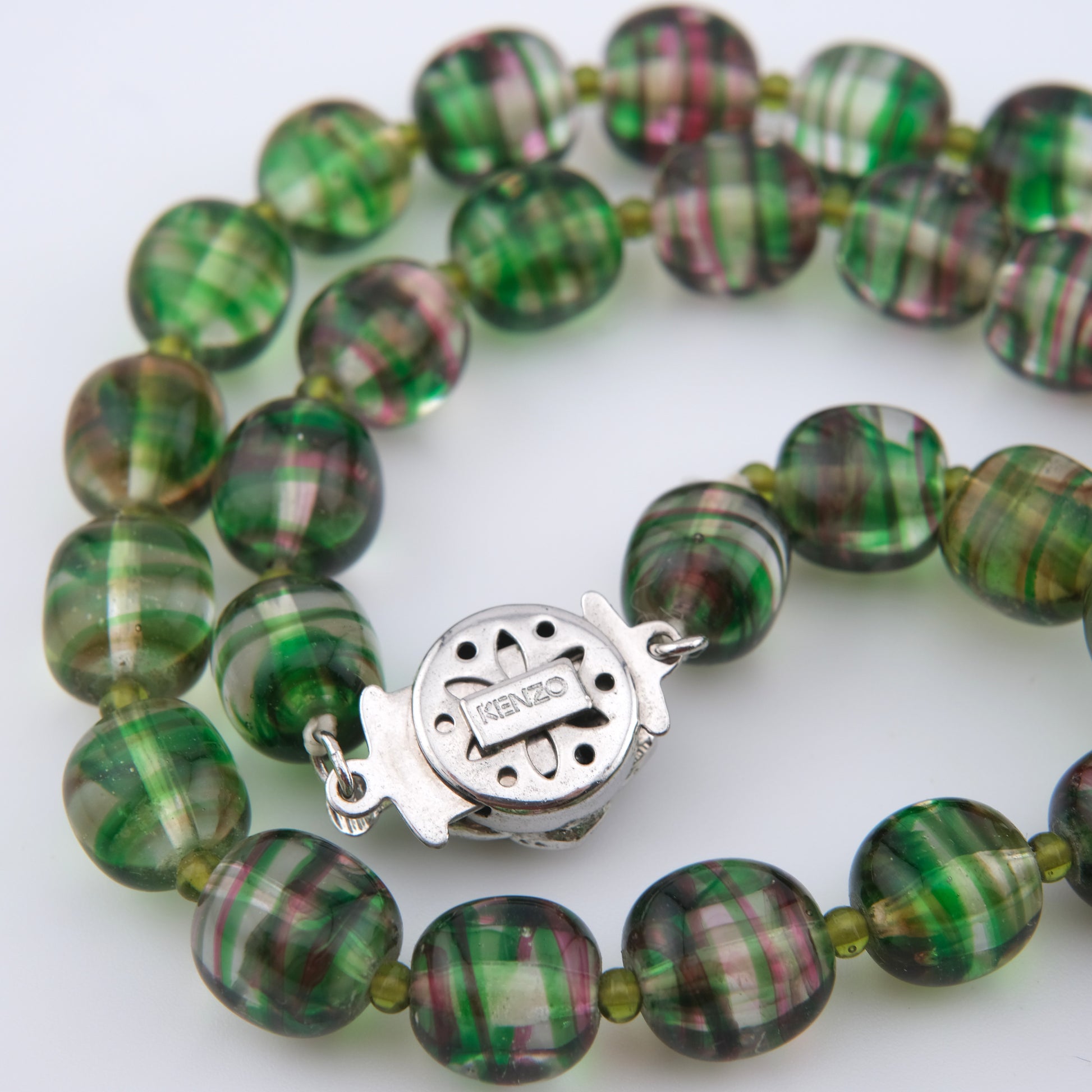 Elevate your collection with this rare vintage Kenzo necklace, featuring beautifully striped glass beads in shades of green and soft pink. The beads are hand-knotted for a refined finish and fasten with a sculptural silver-tone rose clasp that bears the Kenzo signature. Both delicate and vibrant, this 16-inch necklace is an elegant statement piece from the iconic Japanese-French fashion house.