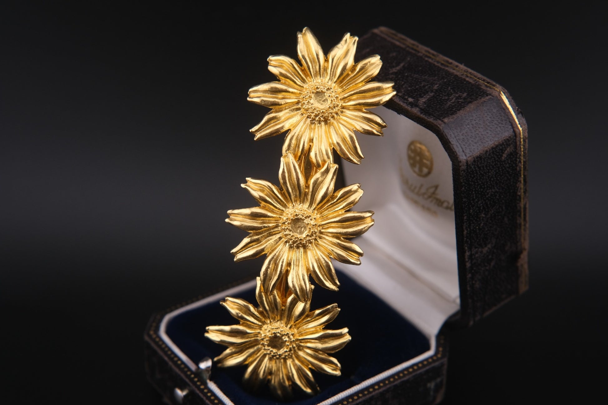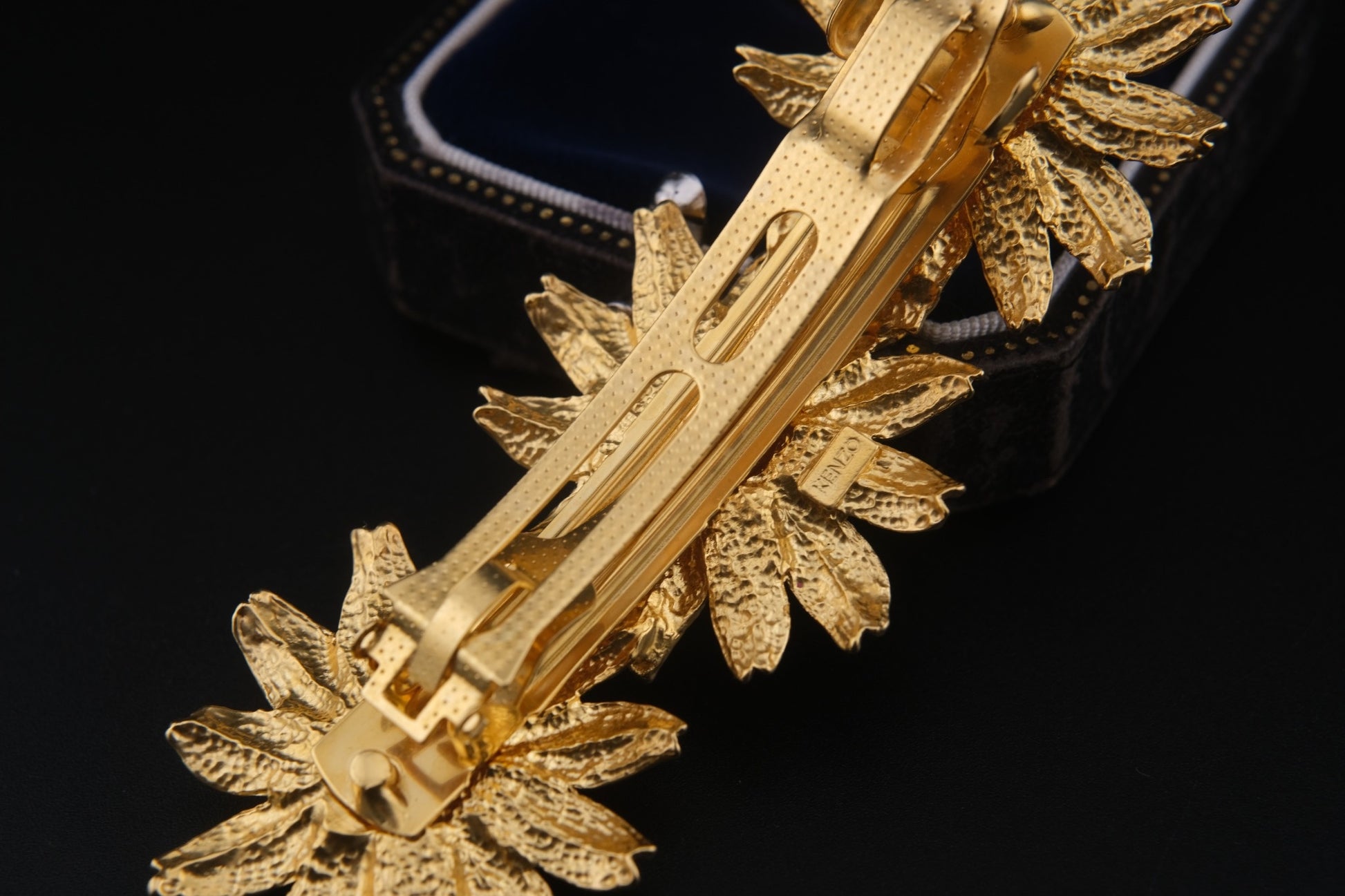 Elevate your hairstyle with timeless elegance using this vintage Kenzo hair clip. Crafted in radiant gold-tone metal, this accessory features three intricately detailed flowers, exuding charm and sophistication. With a secure clip mechanism and Japanese craftsmanship, it's a rare collectible piece perfect for both everyday wear and special occasions.
