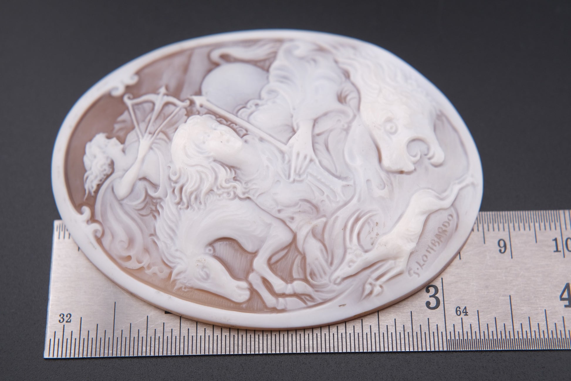Meticulously crafted from natural shell, the carving bears the signature of G. Lombardo on the front and Di Luca on the back – both names associated with the renowned cameo carving tradition of Torre del Greco, Italy.