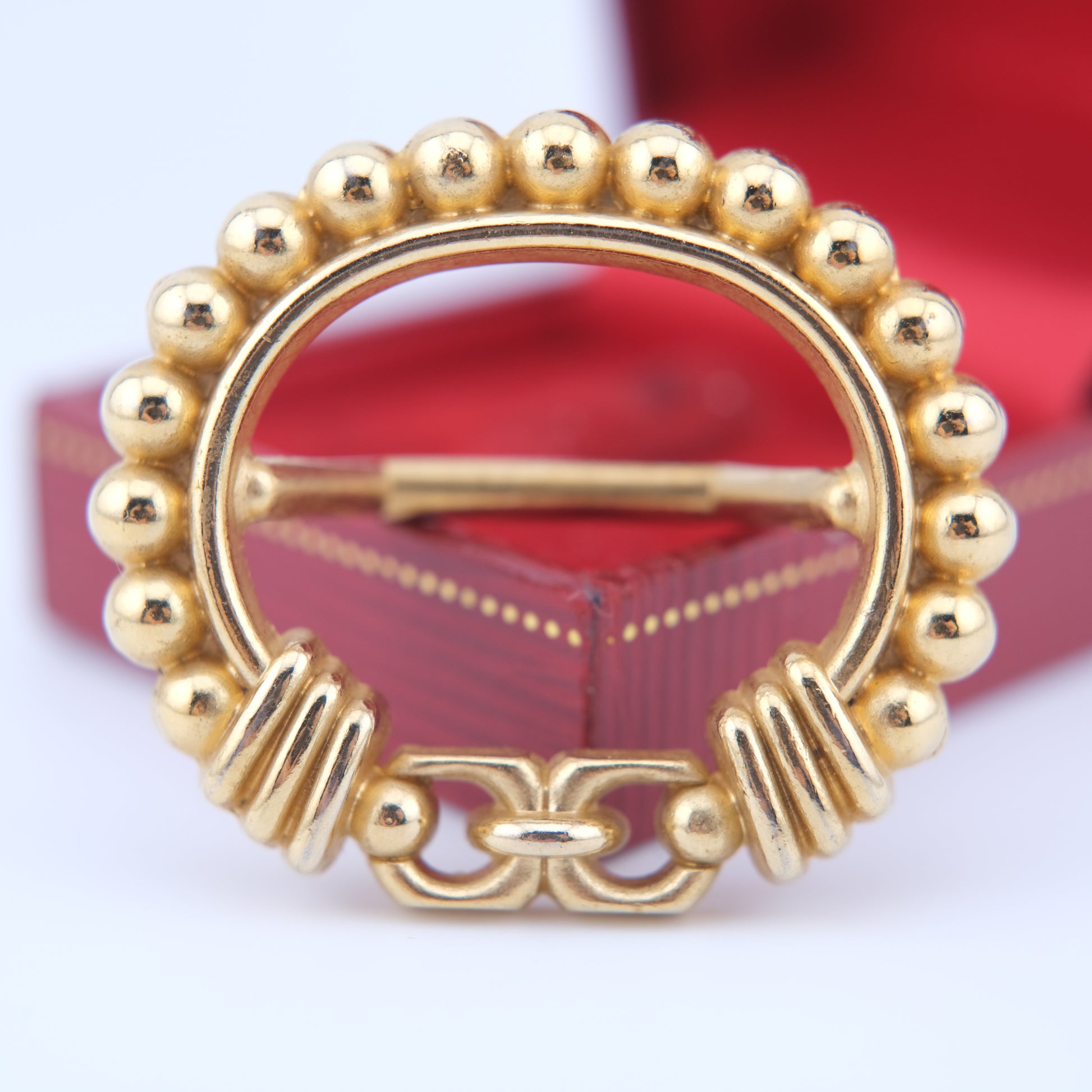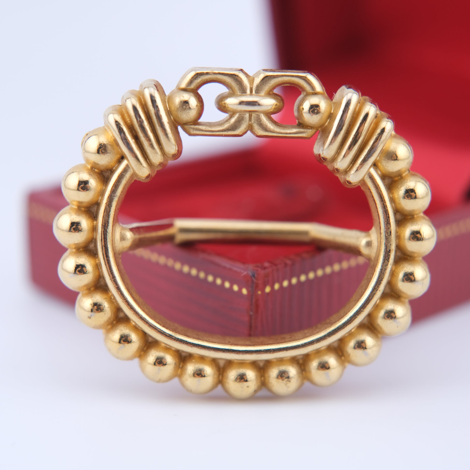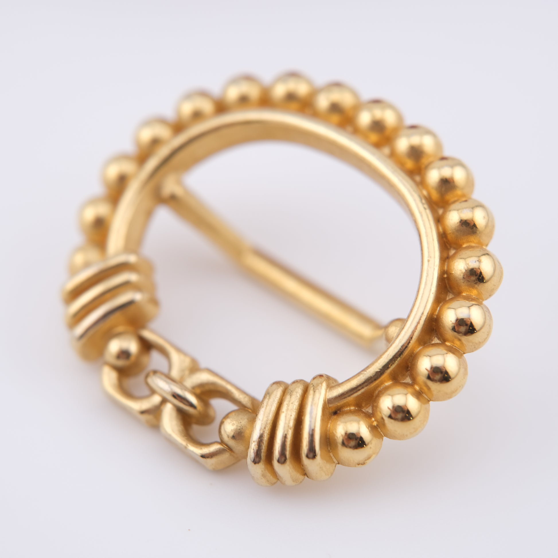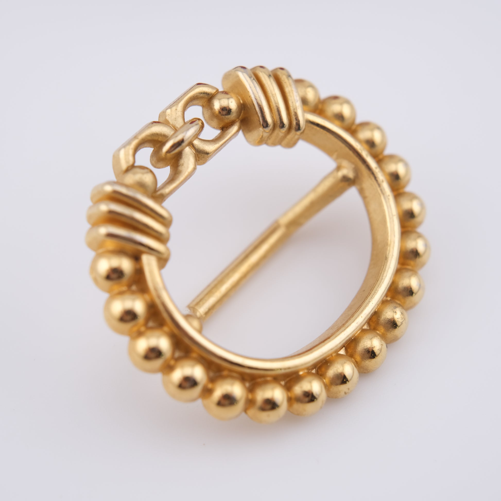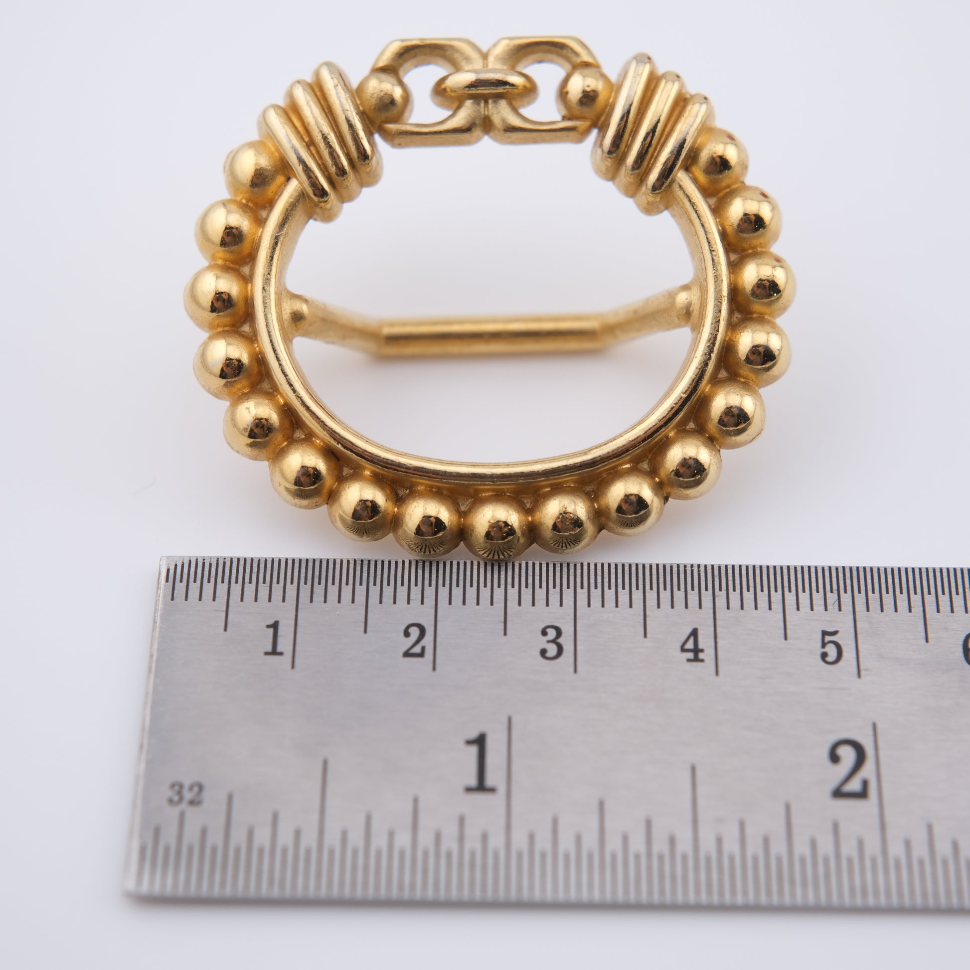 MElevate your vintage accessories collection with this exquisite gold-tone scarf ring by Malka, a French designer known for timeless Parisian elegance. Crafted with a luxurious beaded border and finished with wrapped bar details and a decorative interlink motif, this piece is as versatile as it is stylish. It works beautifully as a scarf ring, and could even be adapted as a pendant for a chunky chain necklace.