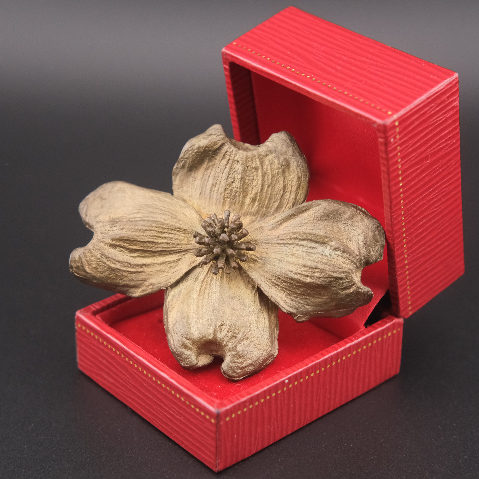 This Michael Michaud Dogwood brooch beautifully captures the delicate bloom in wearable form. Cast in bronze with finely plated silver and copper petals, it showcases the lifelike detail and nature-inspired artistry for which Michaud is celebrated. A timeless botanical piece, perfect for collectors and lovers of elegant, naturalistic jewelry.