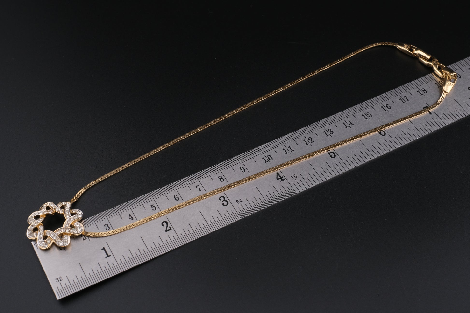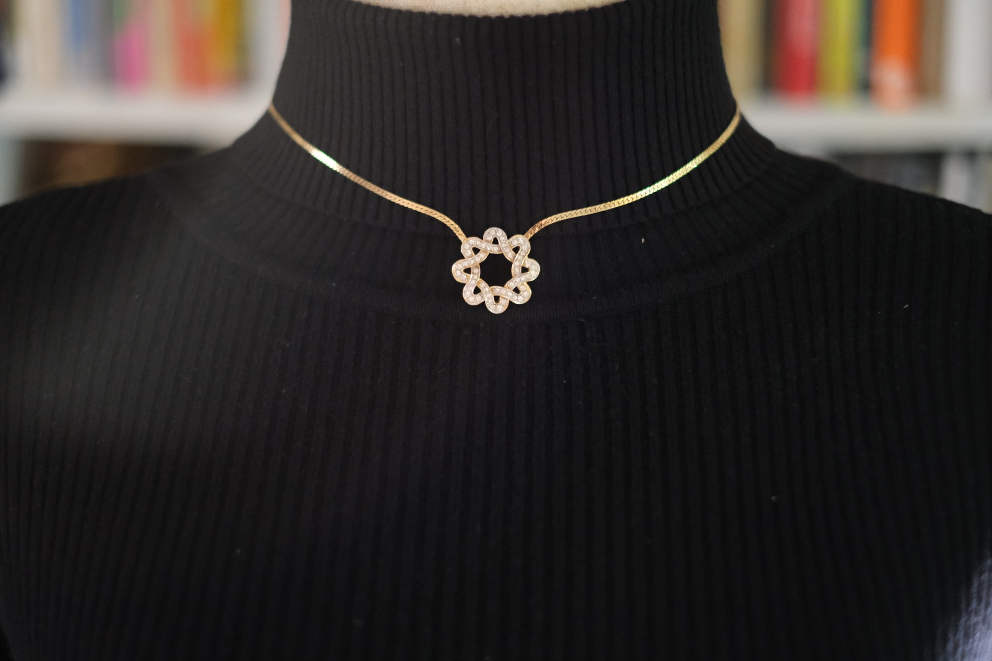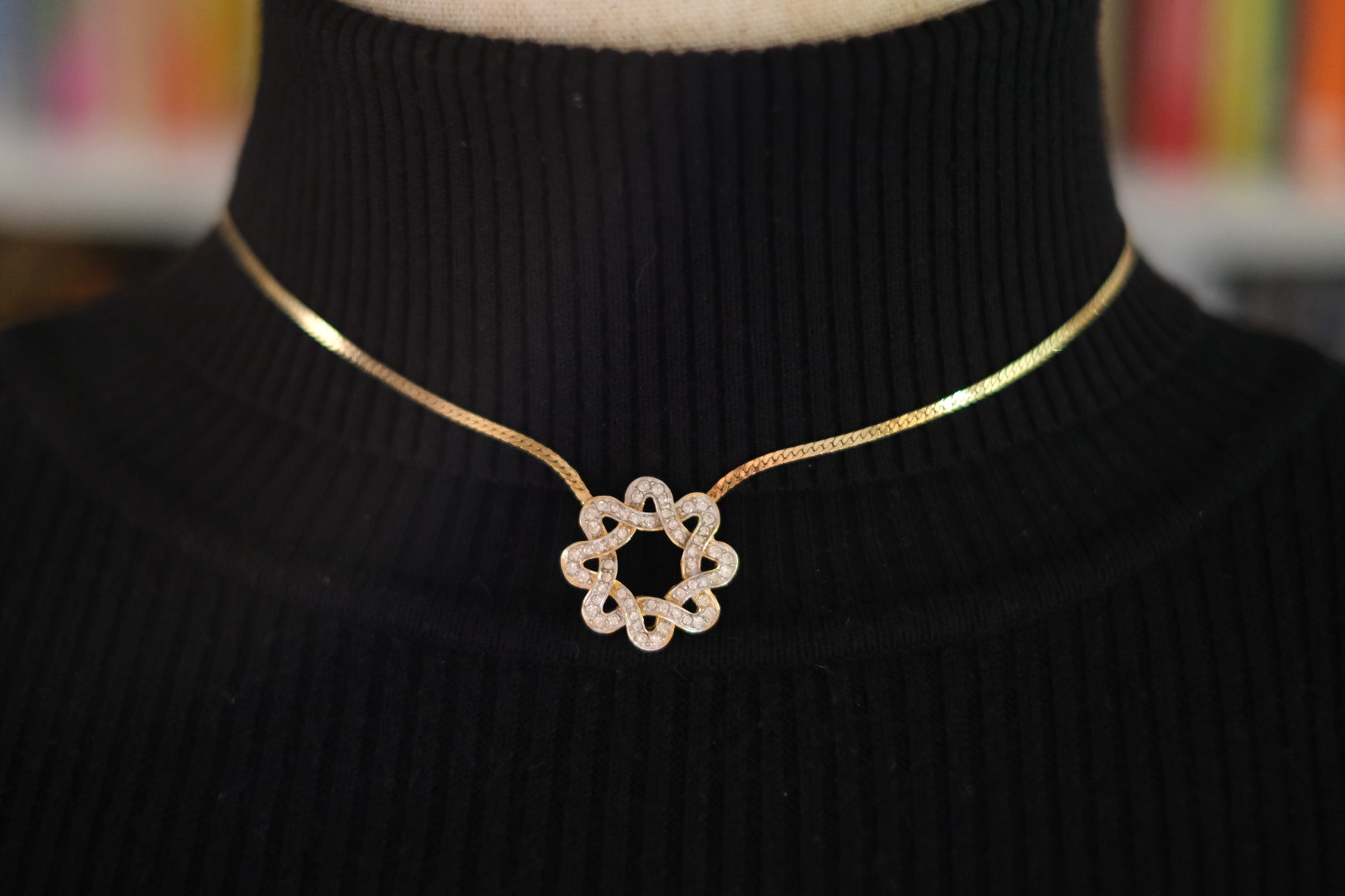 his exquisite vintage Nina Ricci necklace features a striking star-shaped knot pendant encrusted with shimmering clear crystals. The fluid gold-tone setting adds a rich contrast and timeless elegance, while the snake-style chain sits beautifully as a close-fitting choker. The necklace is finished with a secure fold-over clasp, both clasp and pendant marked Nina Ricci for authenticity. A refined piece that easily elevates any outfit with just the right amount of sparkle.