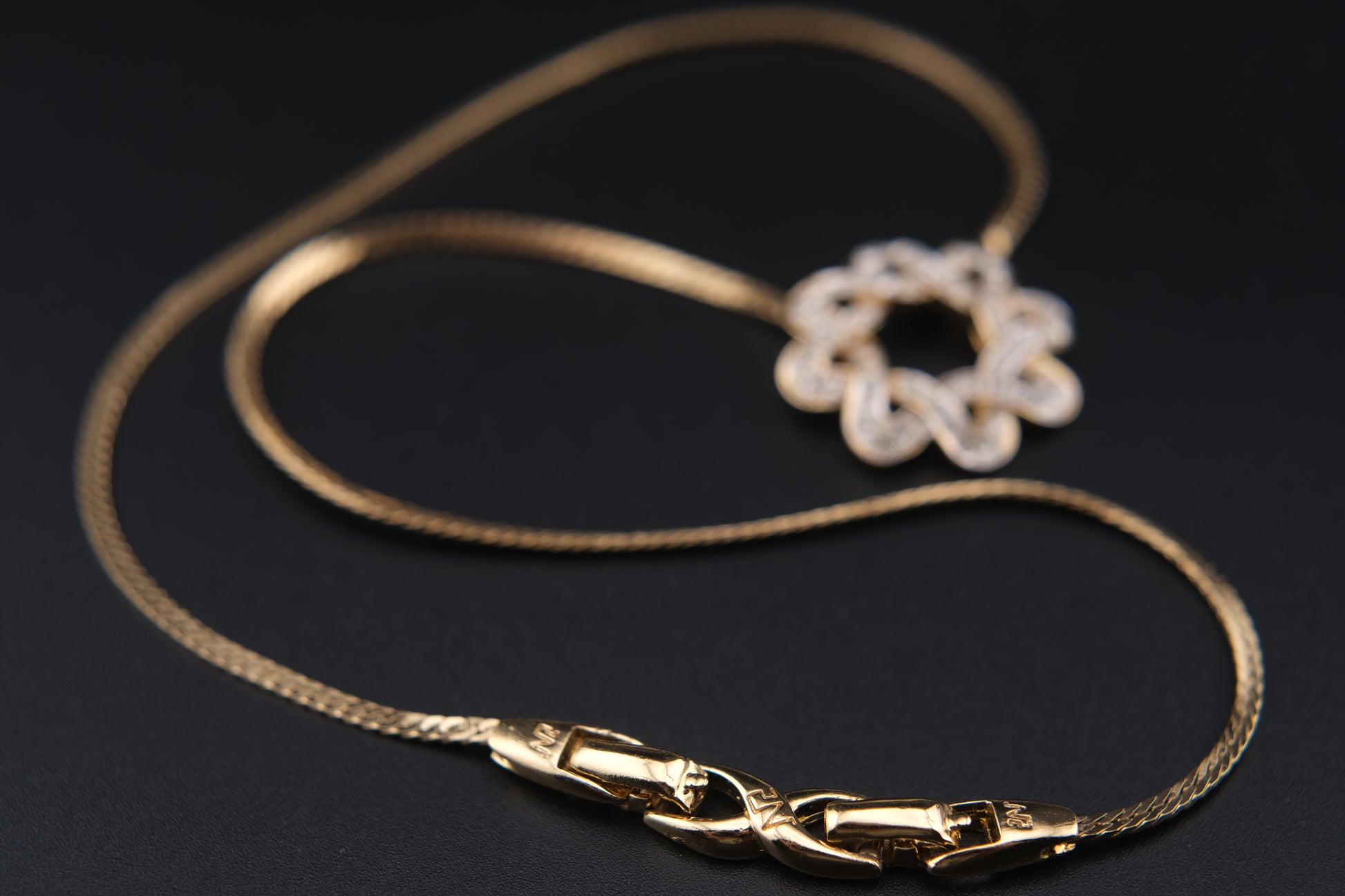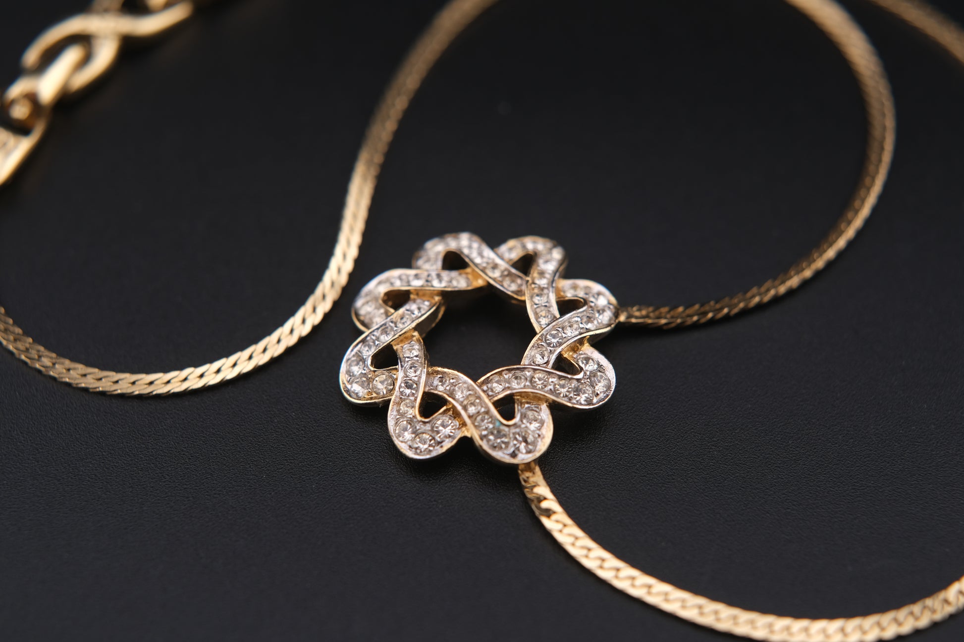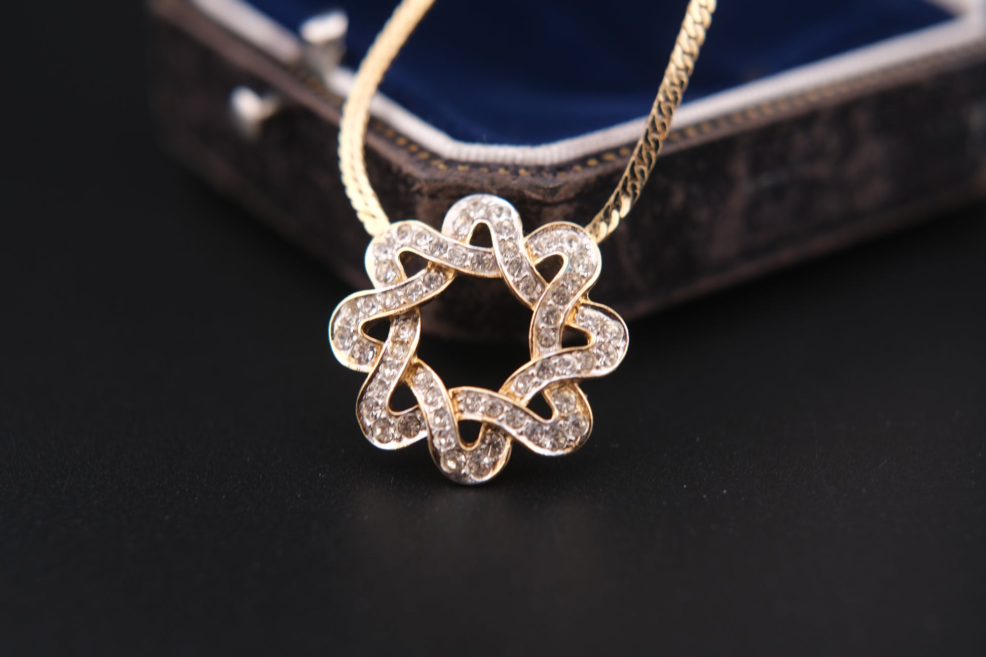 his exquisite vintage Nina Ricci necklace features a striking star-shaped knot pendant encrusted with shimmering clear crystals. The fluid gold-tone setting adds a rich contrast and timeless elegance, while the snake-style chain sits beautifully as a close-fitting choker. The necklace is finished with a secure fold-over clasp, both clasp and pendant marked Nina Ricci for authenticity. A refined piece that easily elevates any outfit with just the right amount of sparkle.