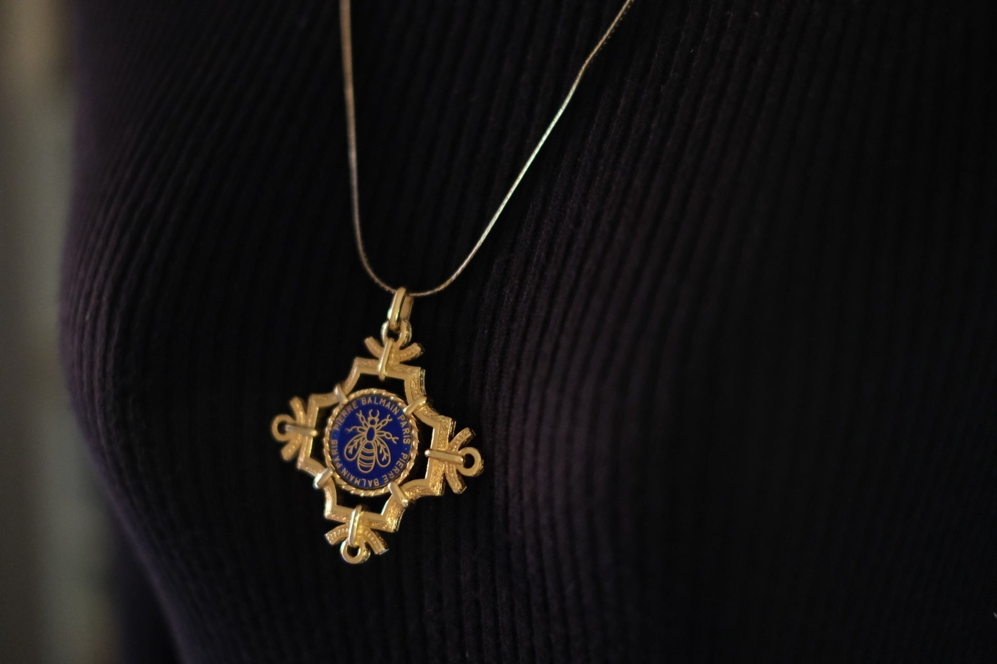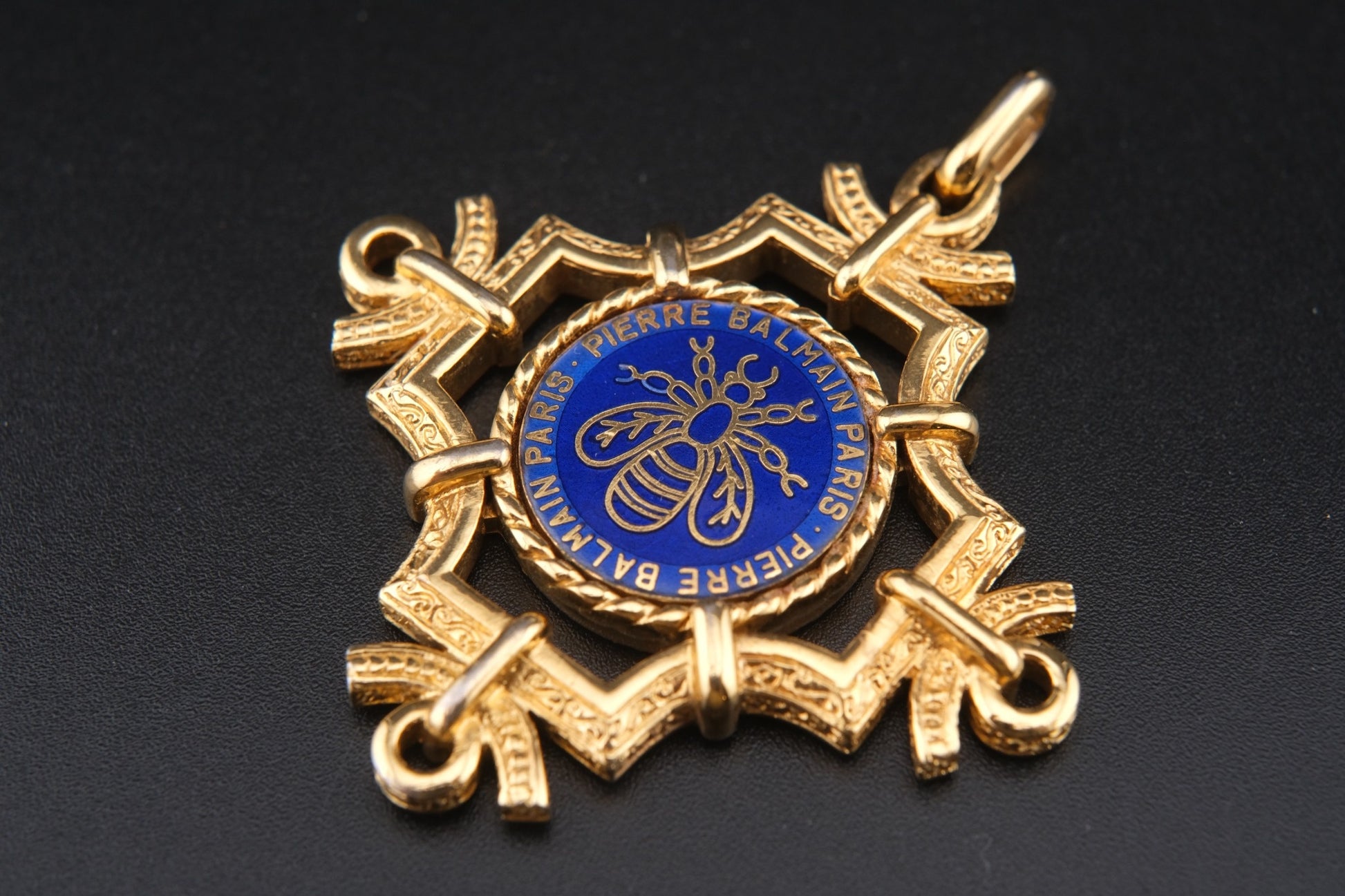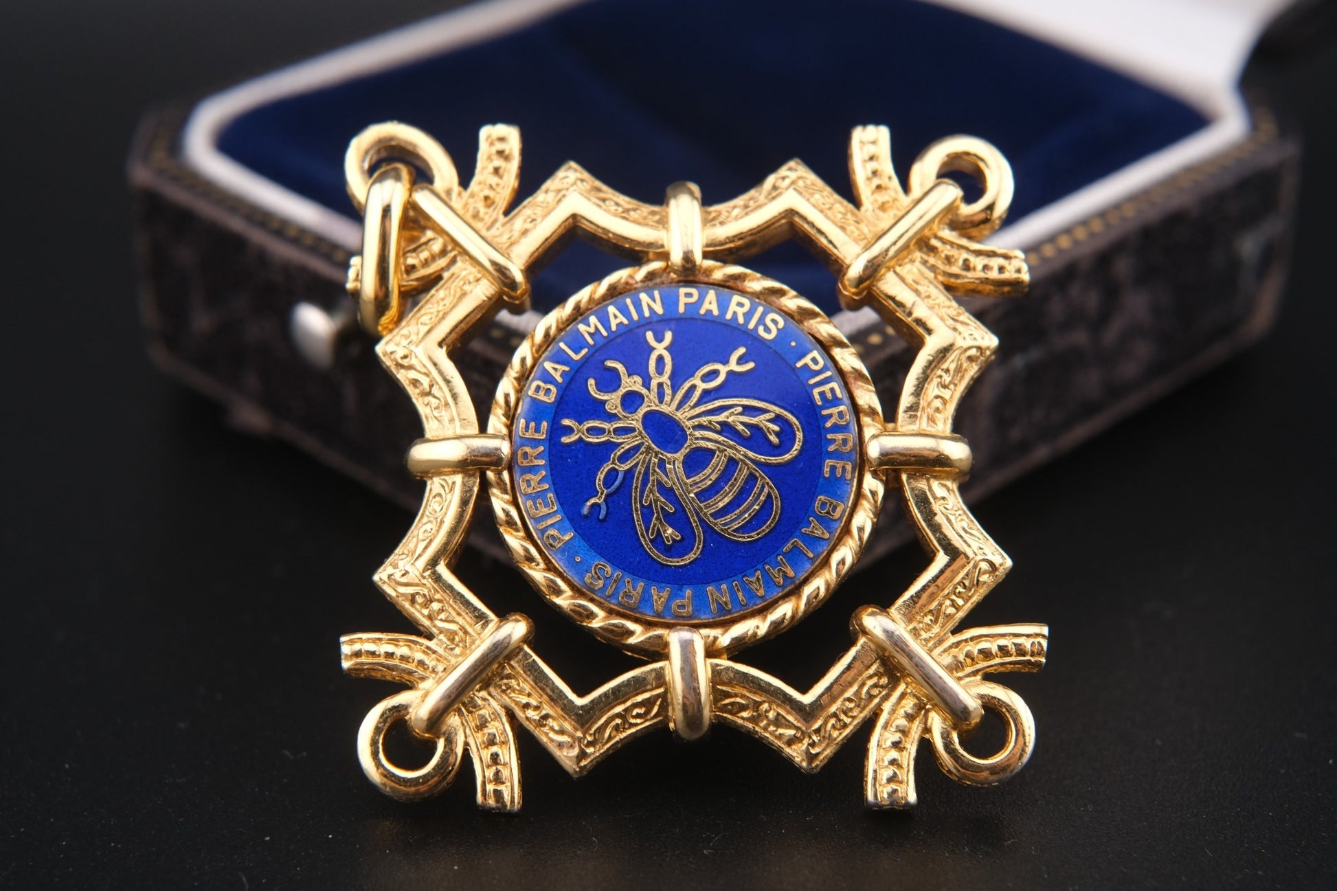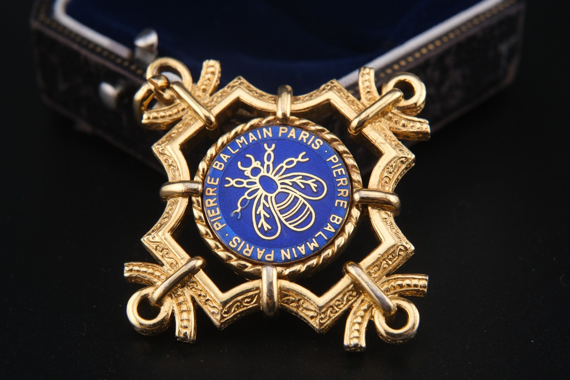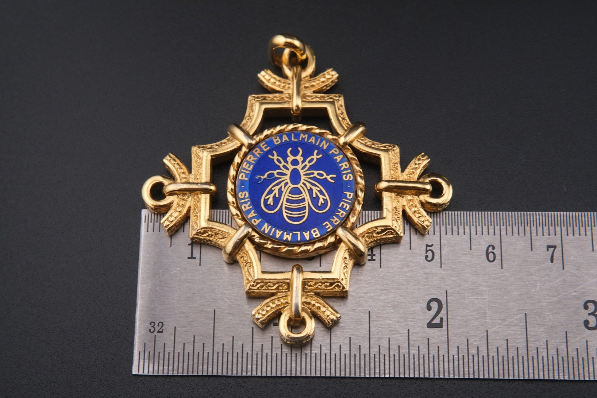 Add a touch of Parisian elegance to your collection with this vintage Pierre Balmain pendant. Crafted in gold-tone metal, the design features a regal bee emblem set against a rich royal blue enamel background, encircled with the lettering “Pierre Balmain Paris.” The ornate, heraldic-style frame reflects the couture sophistication that Balmain is renowned for. The reverse side is beautifully engraved and hallmarked, confirming its authenticity.