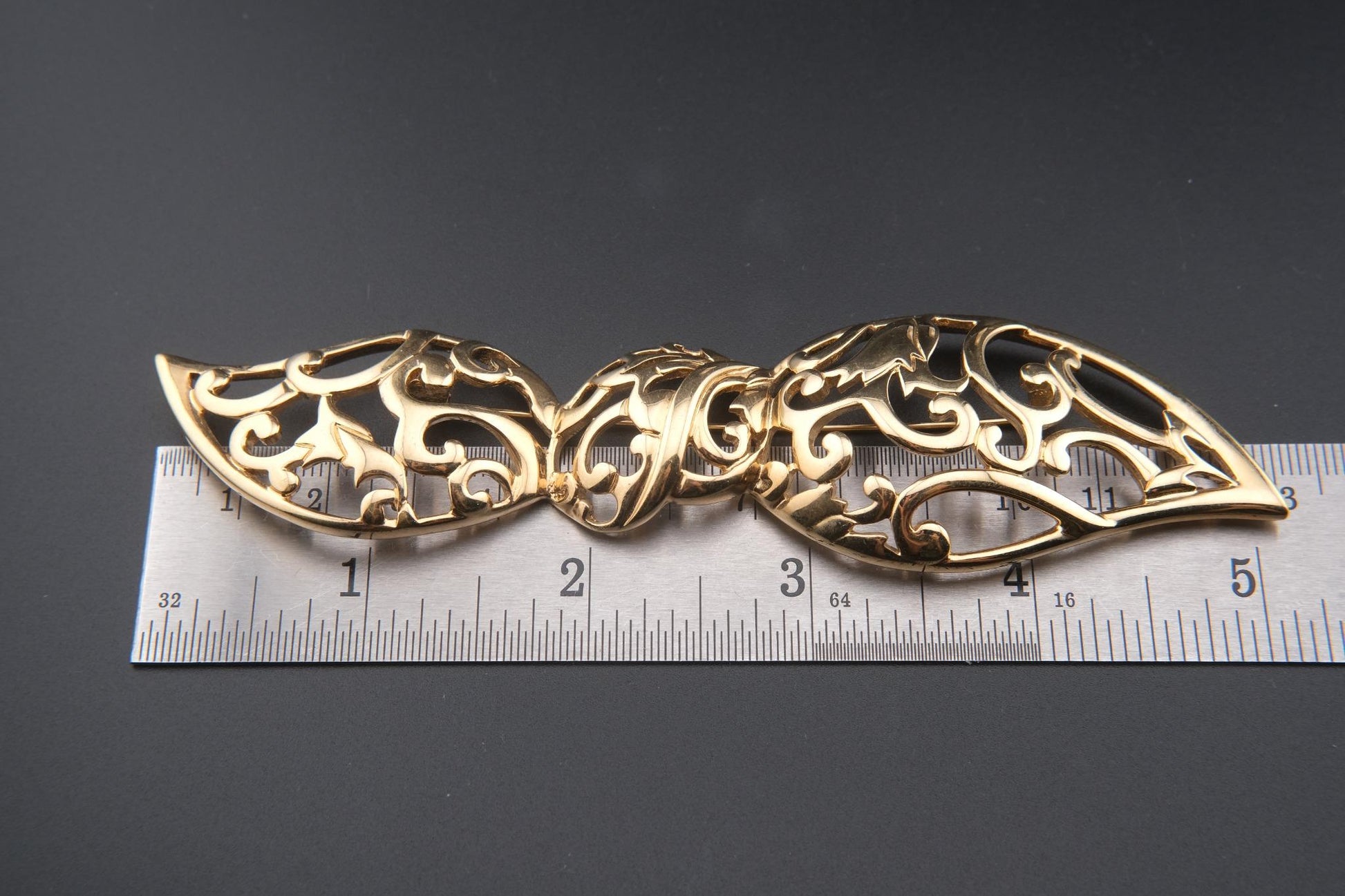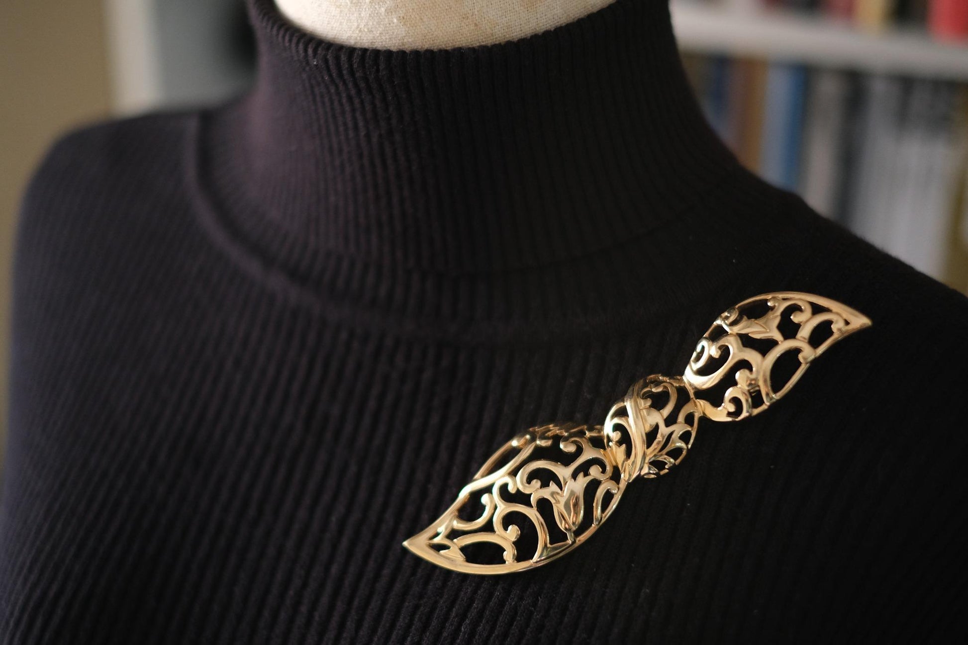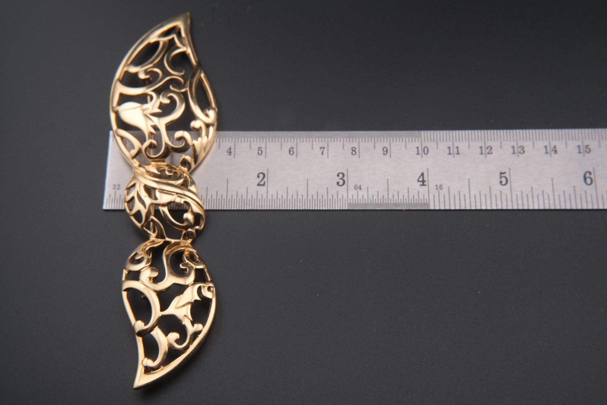 This striking vintage Pierre Lang oversized bow brooch is a true statement piece of Austrian design. Crafted in hard gold-plated openwork metal, the brooch spans an impressive 13.3 cm in width with graceful lines and refined detailing. Its clasp is secured with a safety hood for confident wear, and the reverse is signed PL with the copyright mark.
